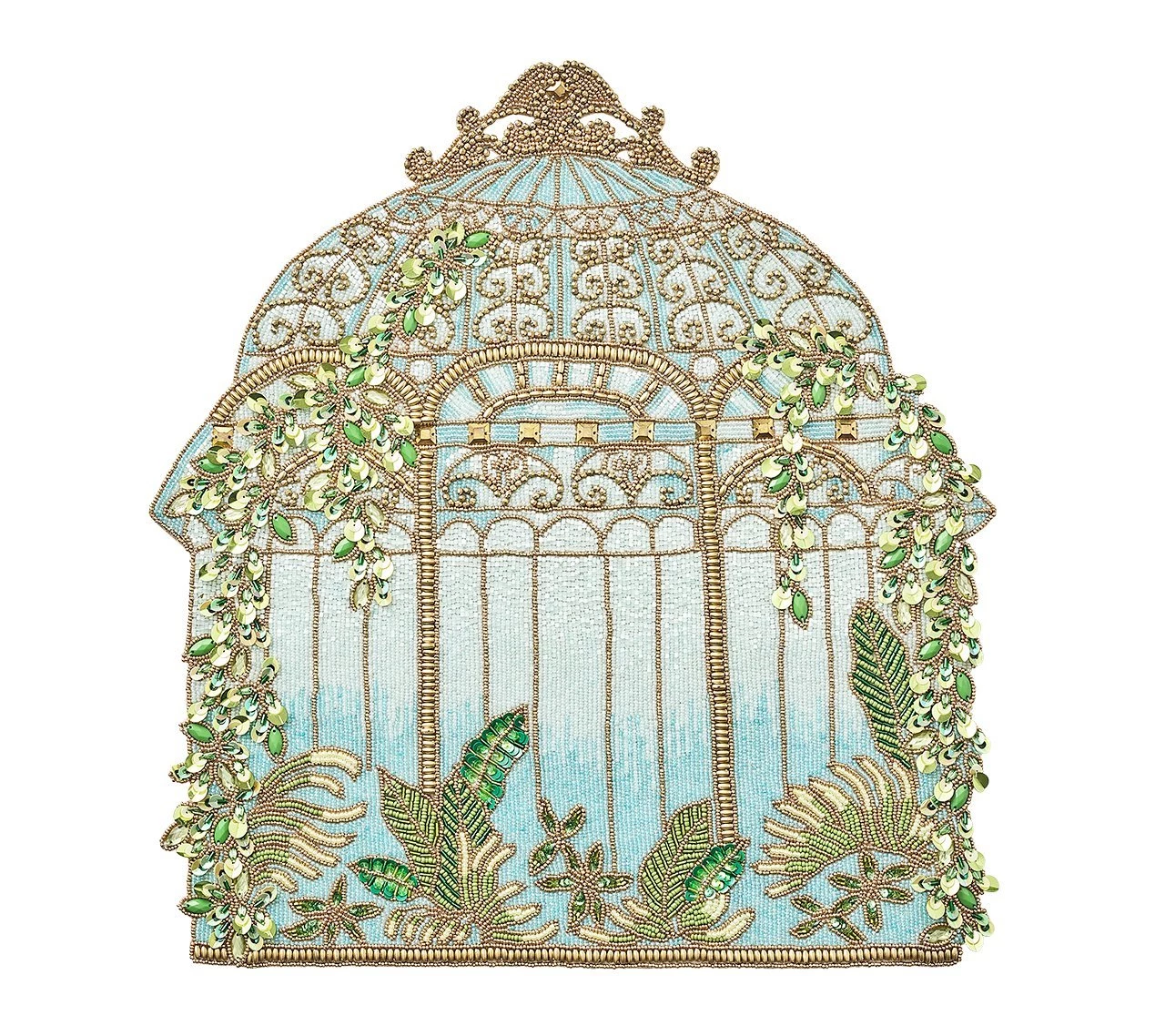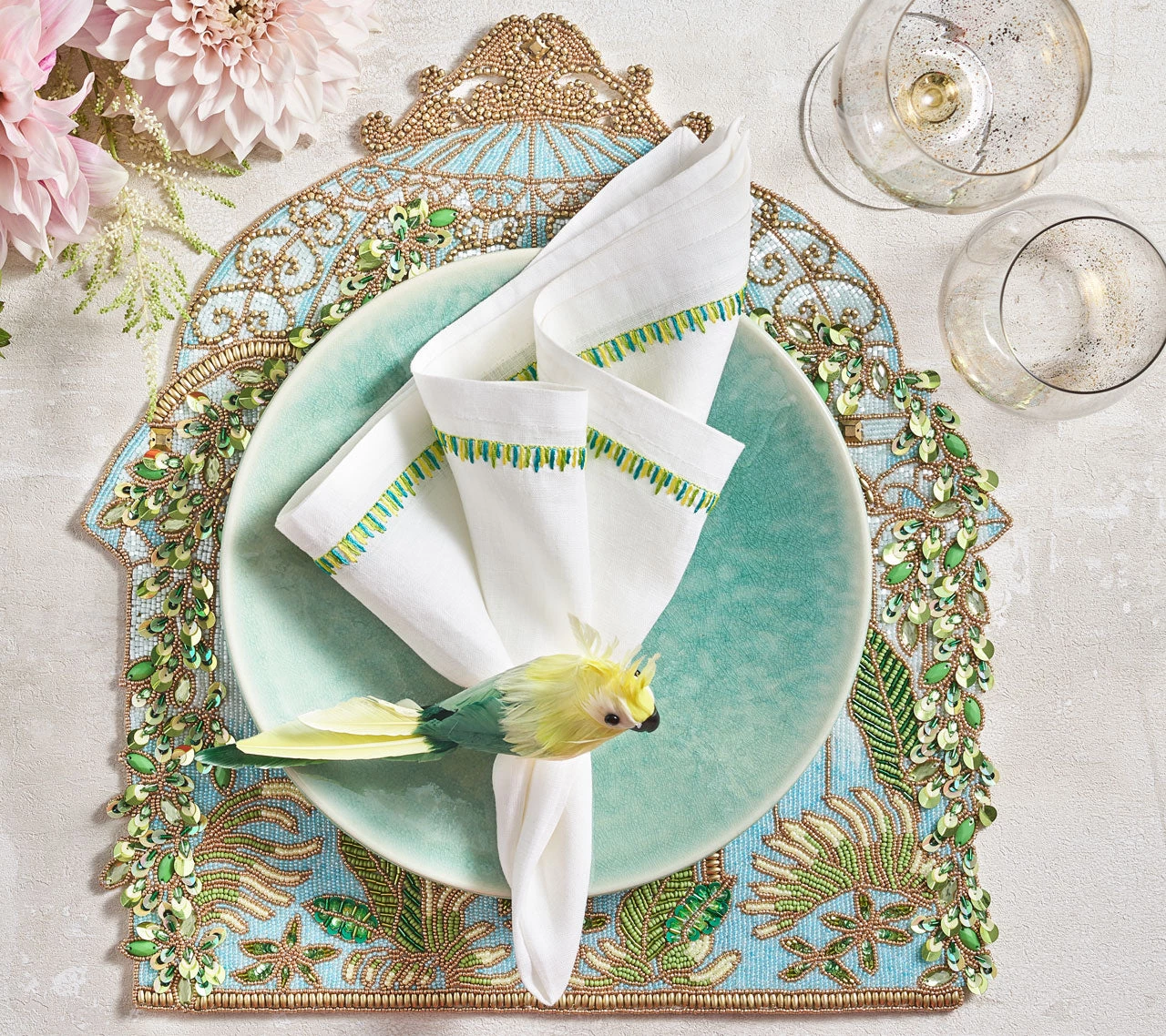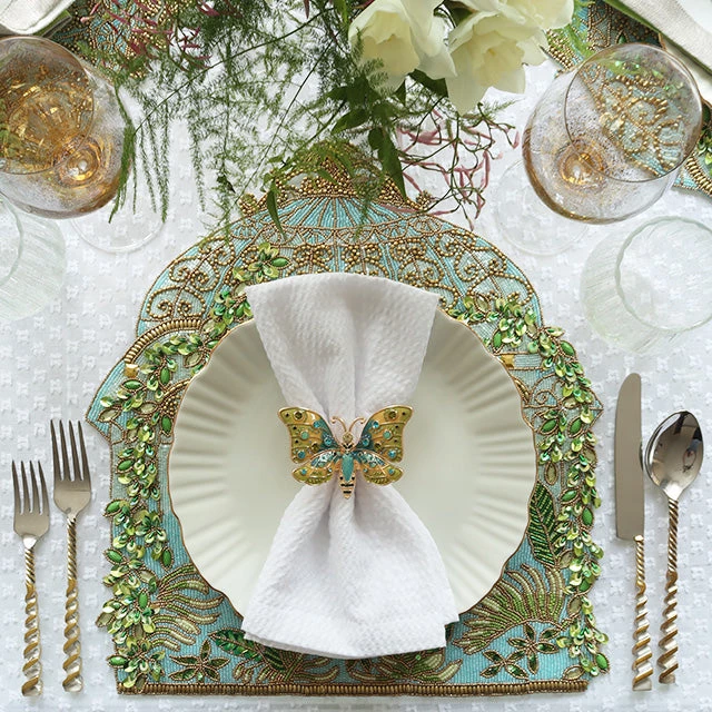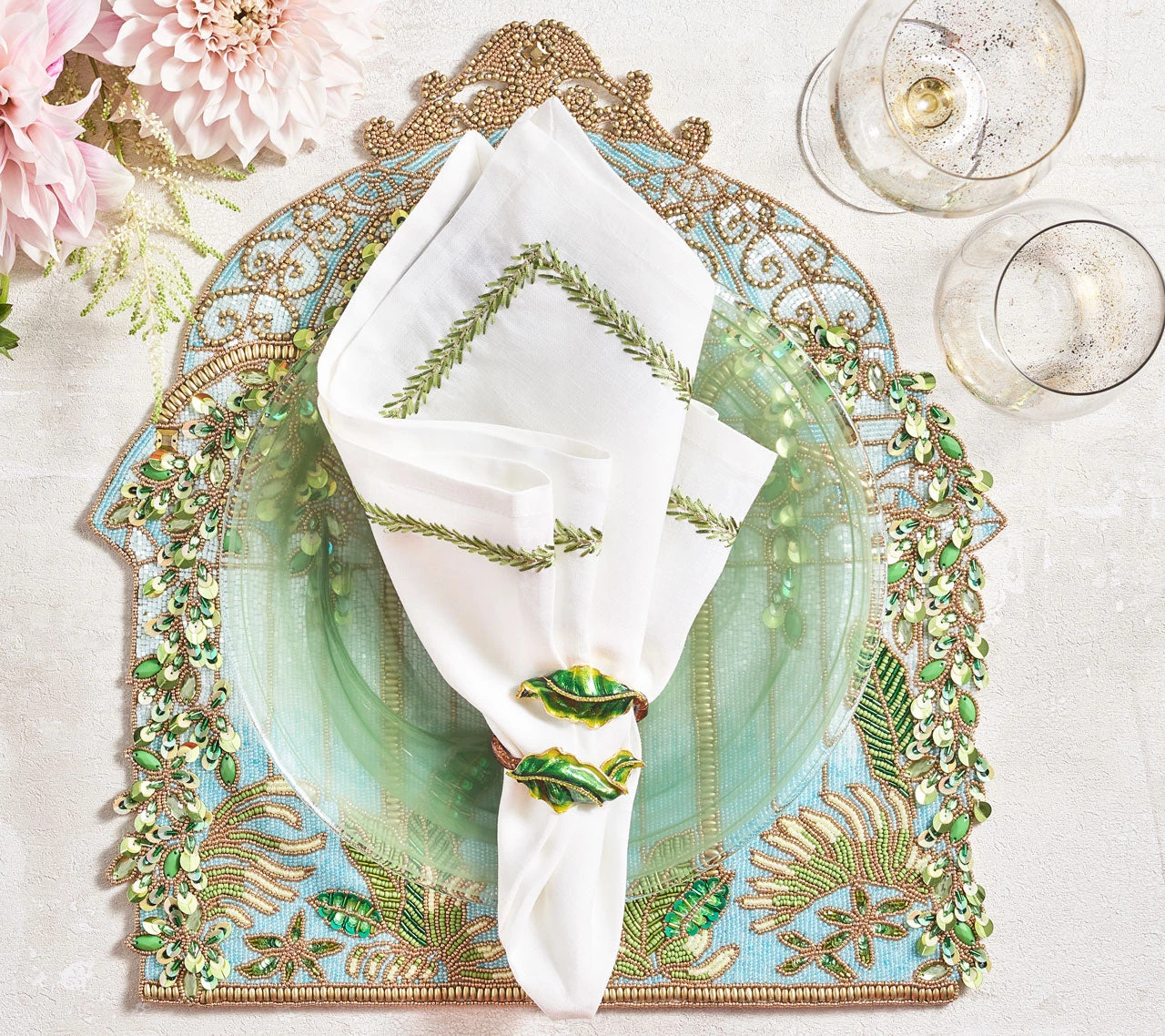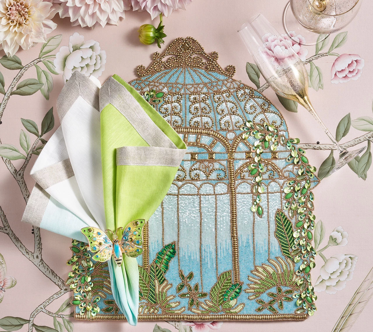 Inspired by the romantic beauty of abandoned Victorian greenhouses, the hand-beaded Arbor Placemat features exquisite beading using a myriad of glass and acrylic beads and sequins. The sequins are hand-folded and applied to the delicate Arbor Placemat to create a three-dimensional effect.