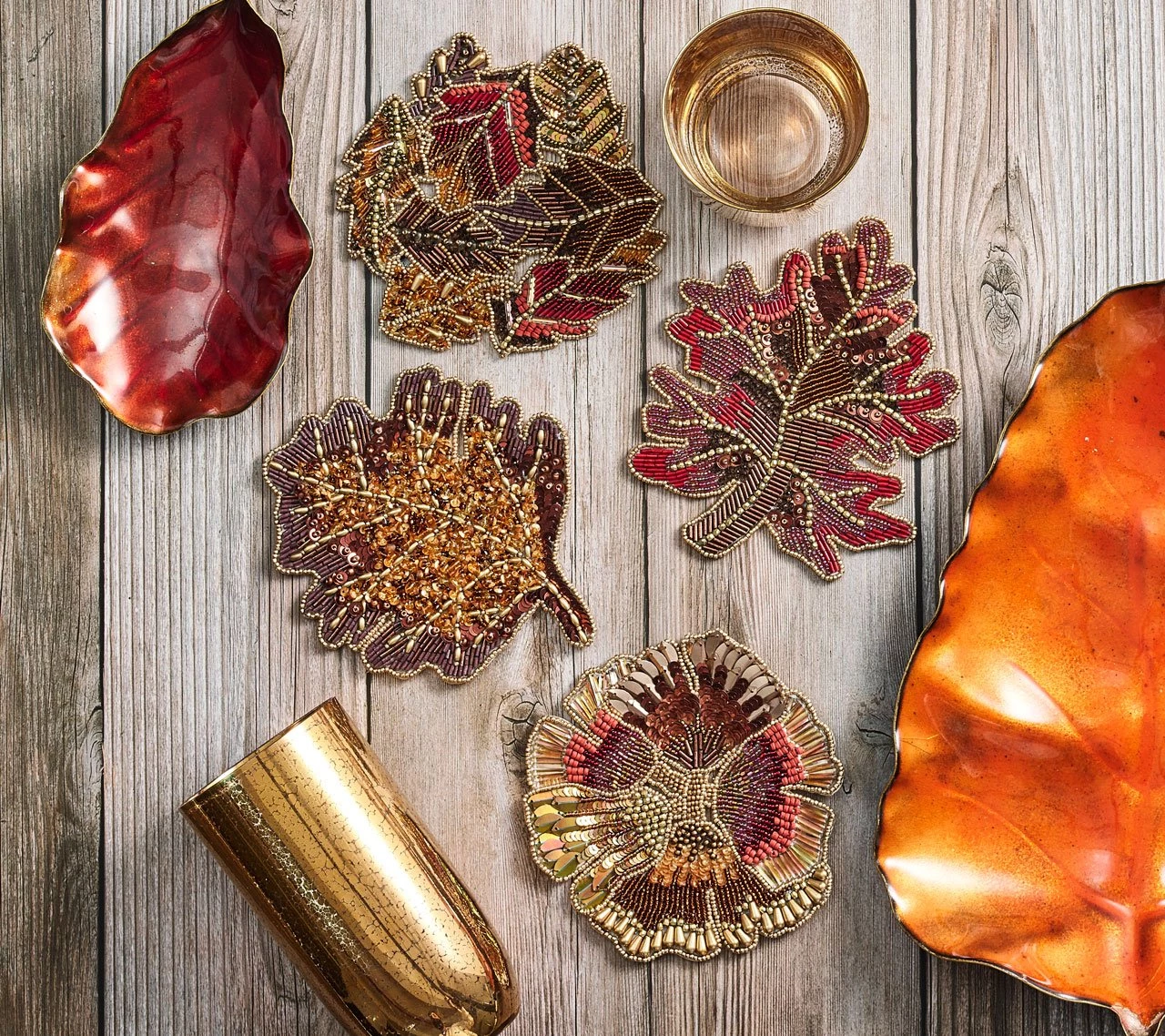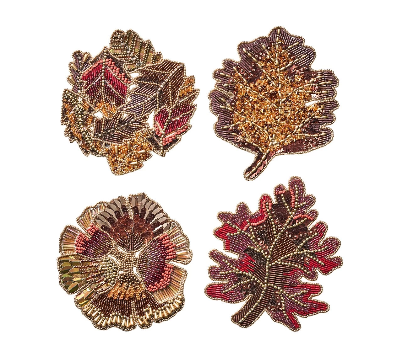 Fifteen different types of glass beads and sequins in rich autumnal shades are used to create the details on four autumn leaves depicted on the beaded Aspen Coasters. A three-dimensional beading technique produces lifelike leaves with depth and texture, creating a realistic quality. The Aspen Collection is the quintessential fall collection inspired by the fall foliage found throughout the Rocky Mountains.