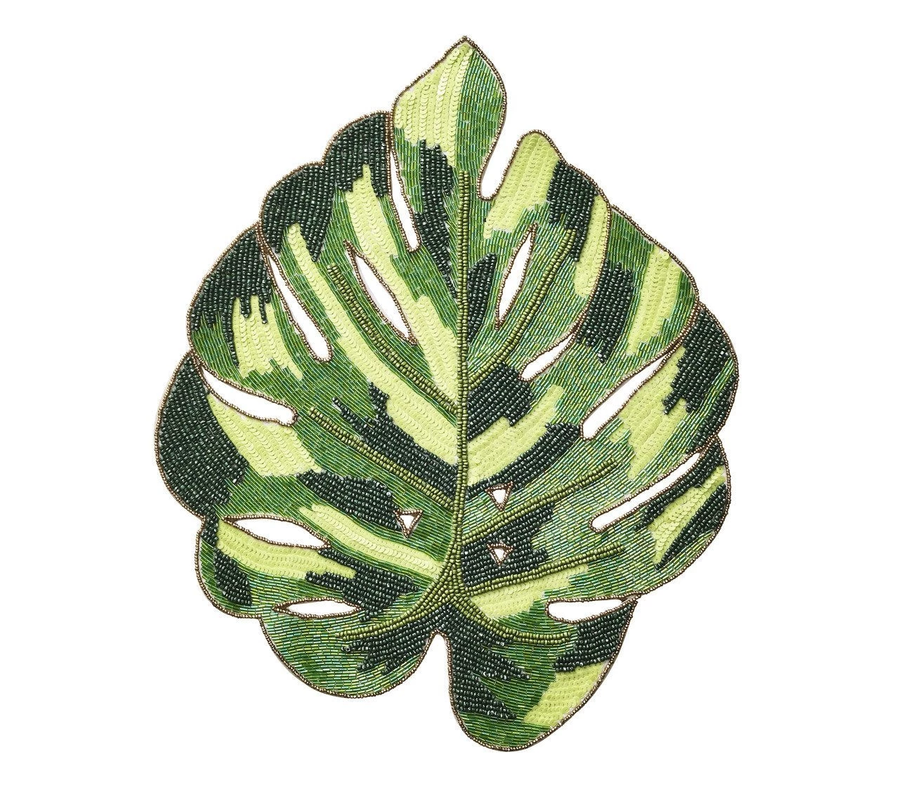 This flora inspired Belize Placemat is suggestive of medicinal leaves found in Central America. Complex glass and acrylic beading using different shades of green add incredible texture and detail.