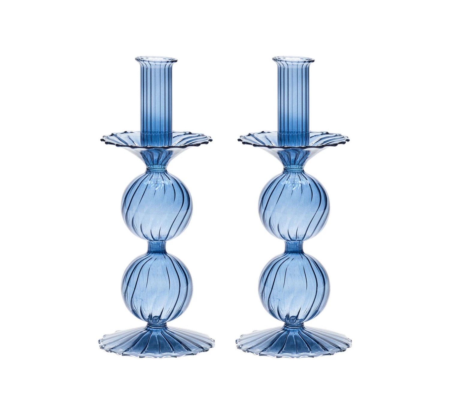 The delicate, hand-blown glass Bella Candlestick features two stacked globes atop a scalloped base. This stunning glass candlestick adds movement and sophistication to any table.