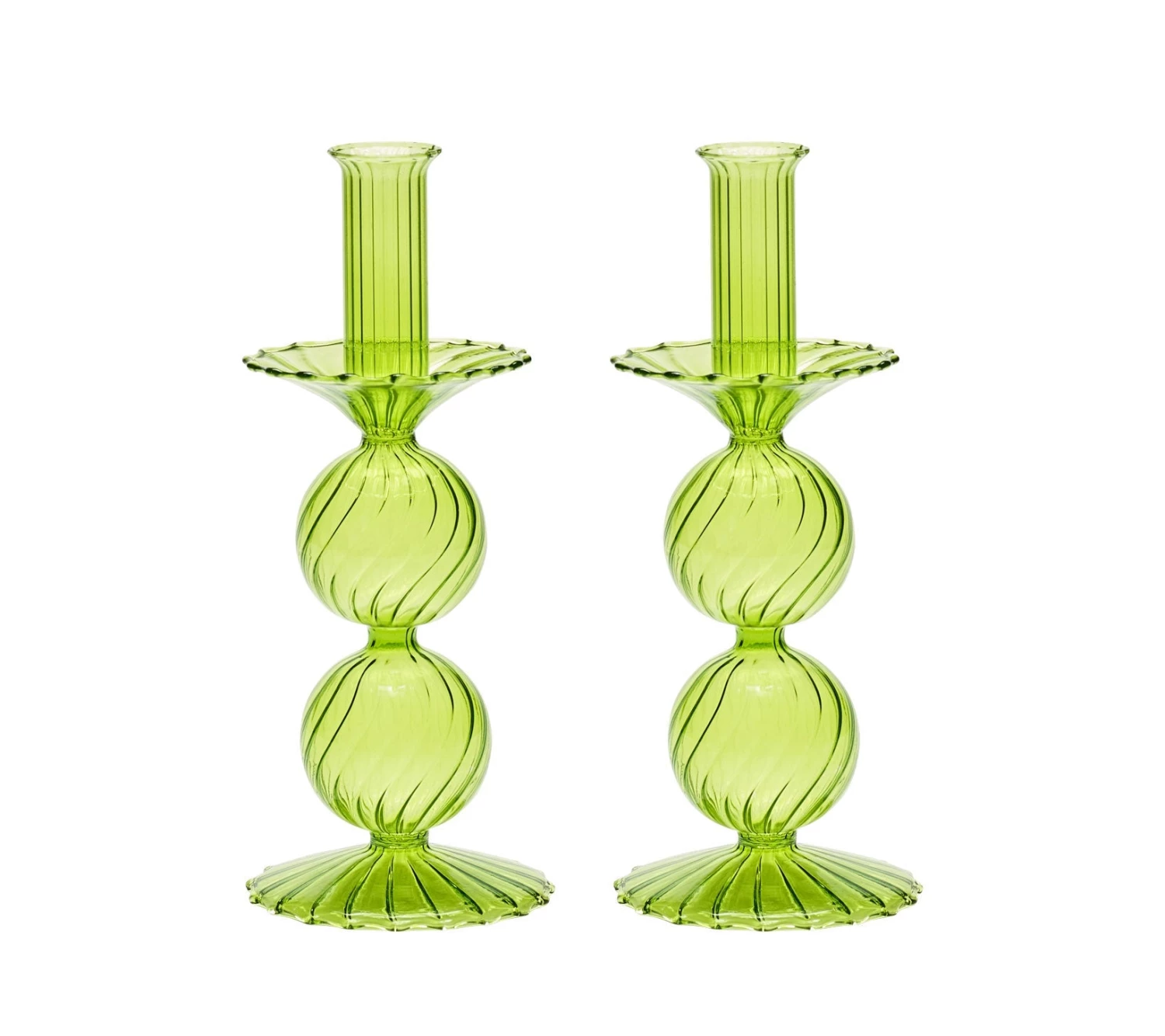 The delicate, hand-blown glass Bella Candlestick features two stacked globes atop a scalloped base. This stunning glass candlestick adds movement and sophistication to any table.