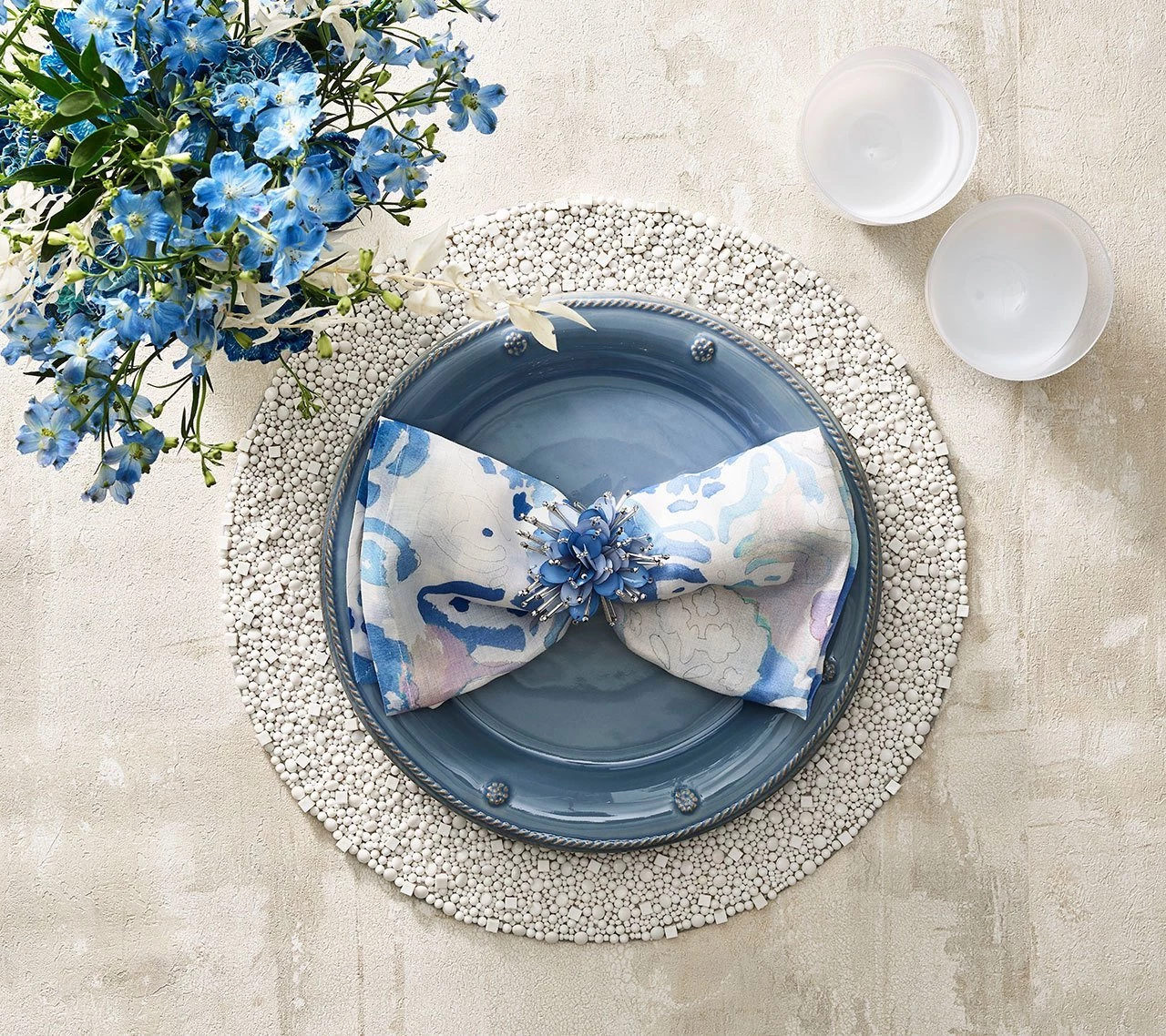 Inspired by the coastal seashore, the textural elements of the Bianco Placemat mimic that of elusive rocky cliffs. The intricate combination of white beads creates a tactile as well as visual experience. While the design is complex, the monochromatic nature creates a neutral yet striking backdrop.