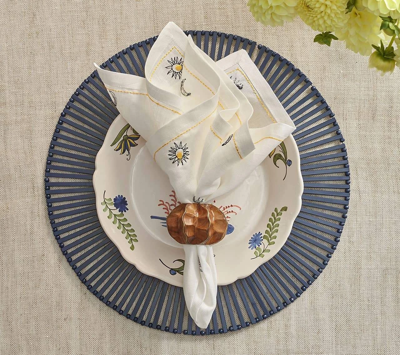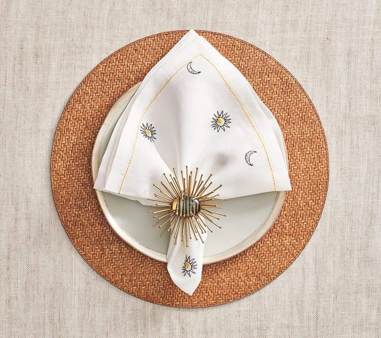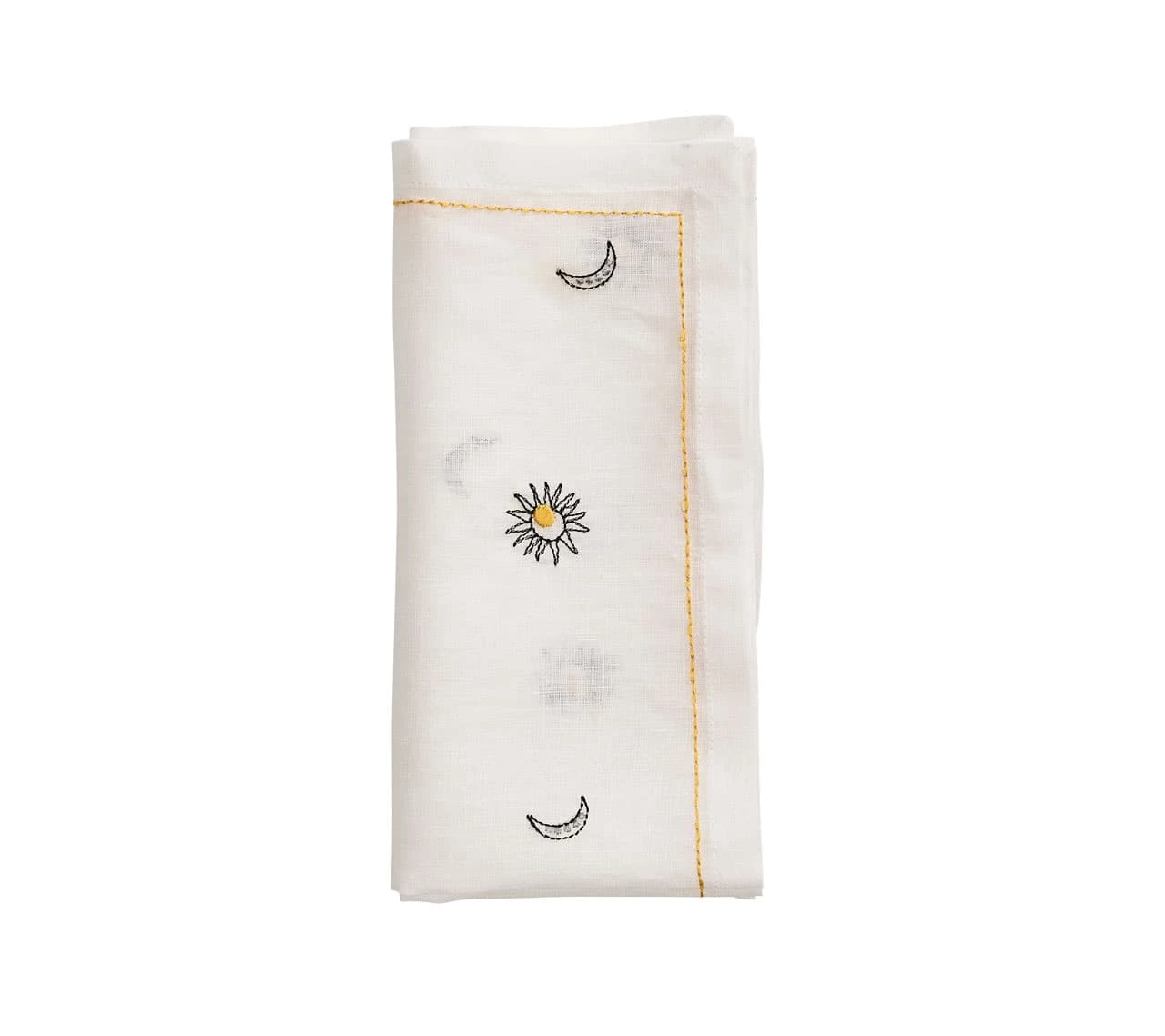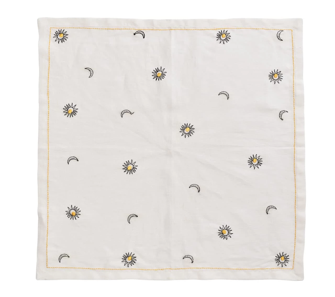 The white linen Bohemia Napkins feature a stark linen background and beautifully embroidered iconic elements in shades of yellow. With a yin-yang type of approach, these crisp linen napkins depict complementary embroidered imagery meant to help foster chitchat.Â