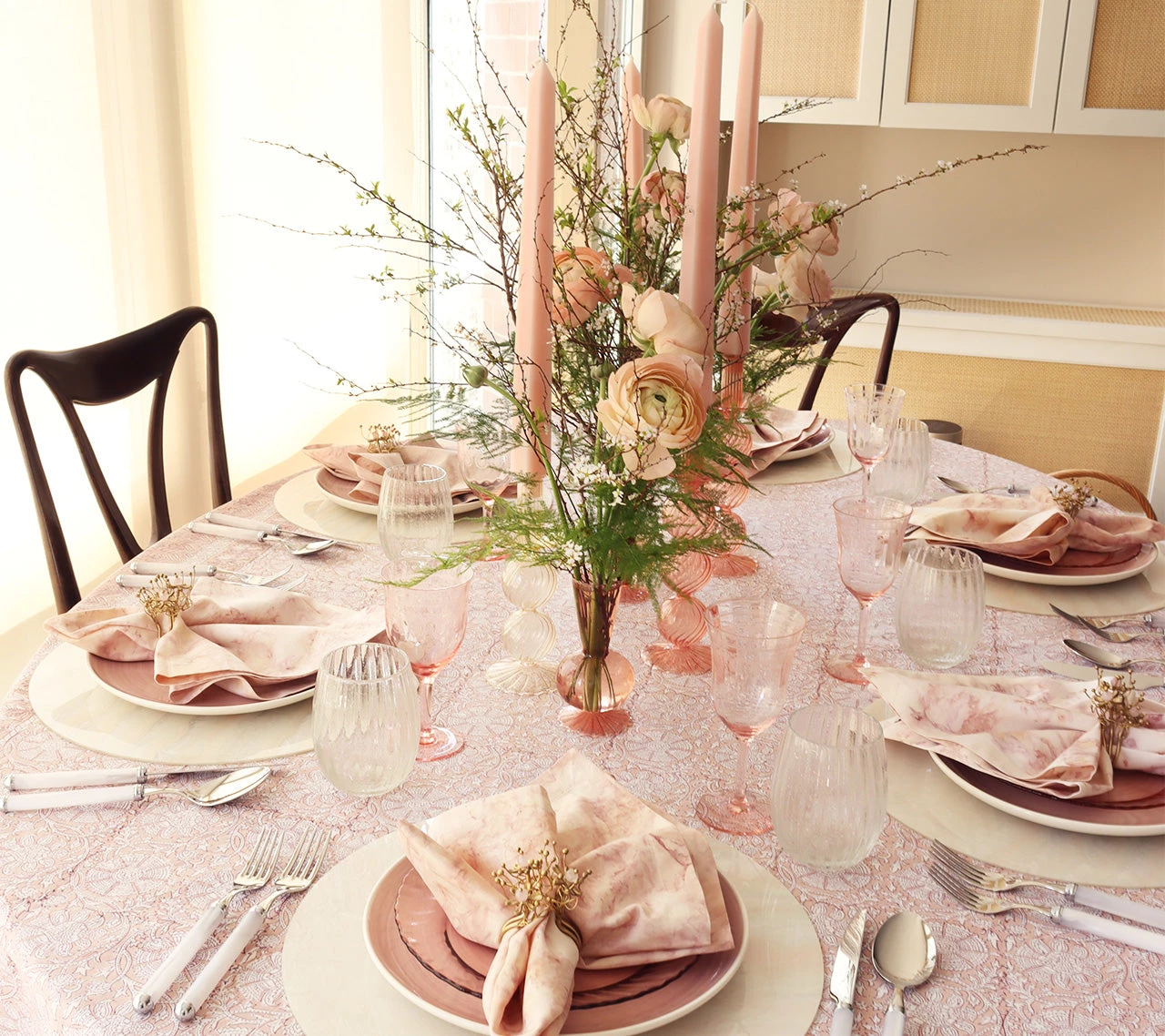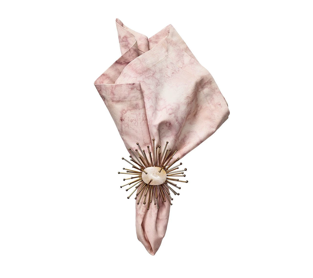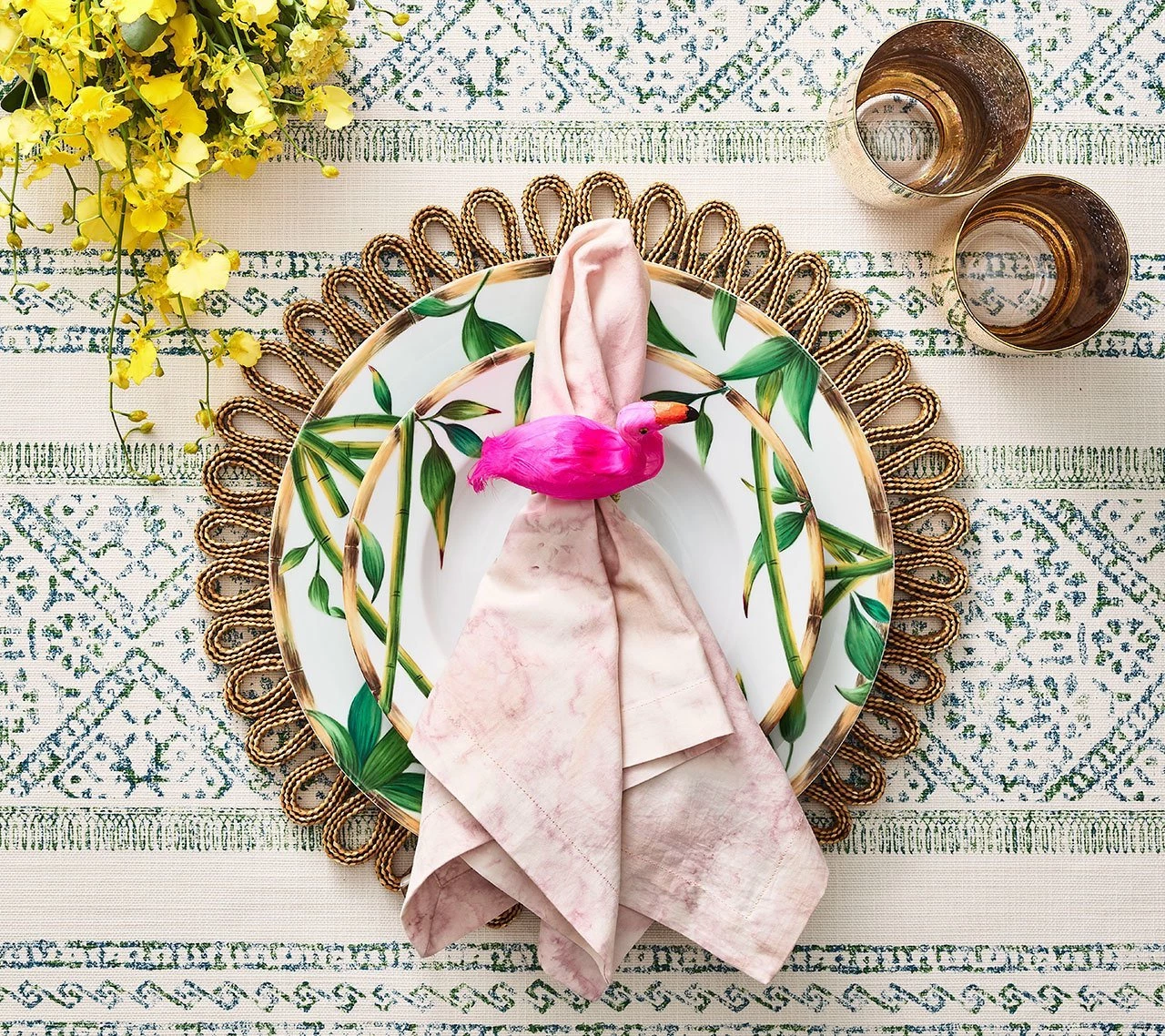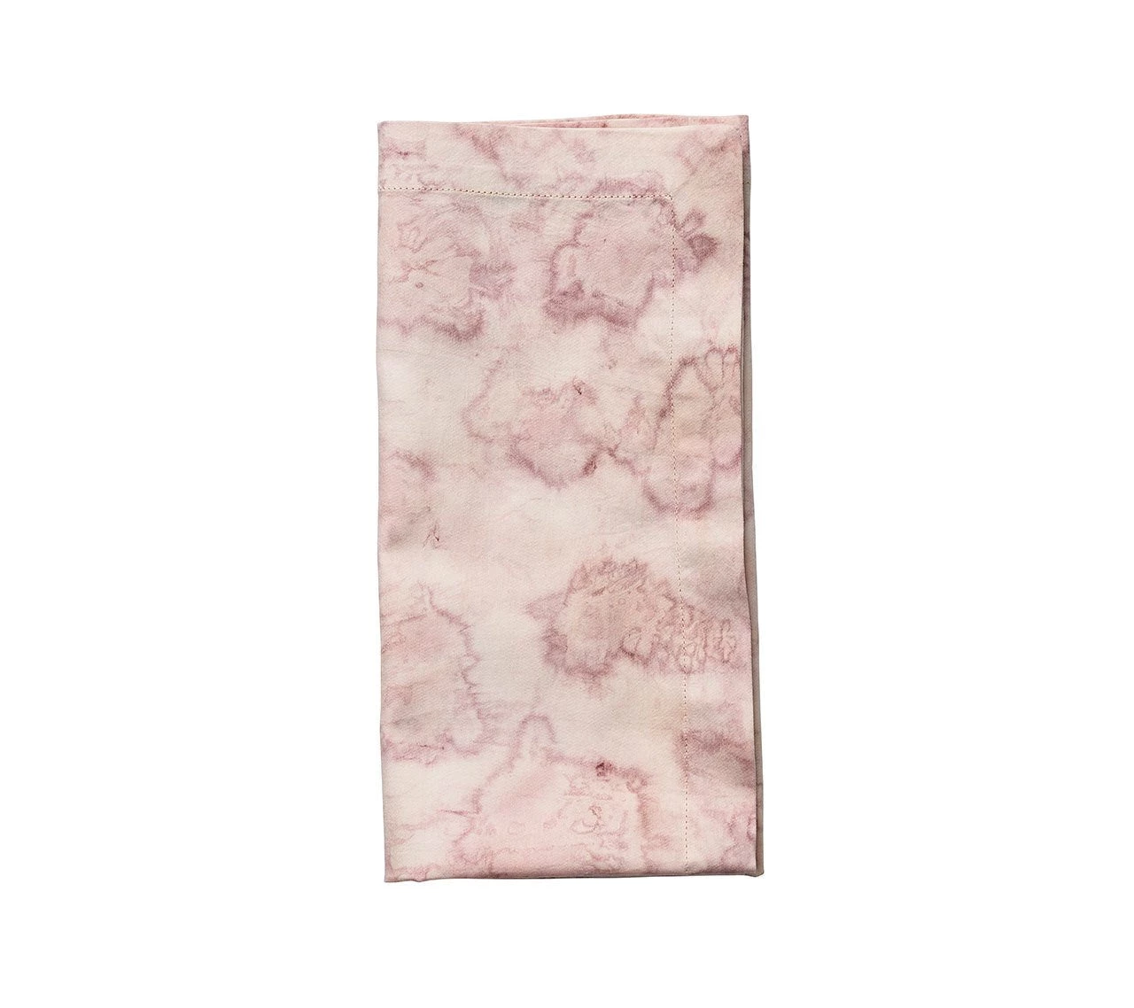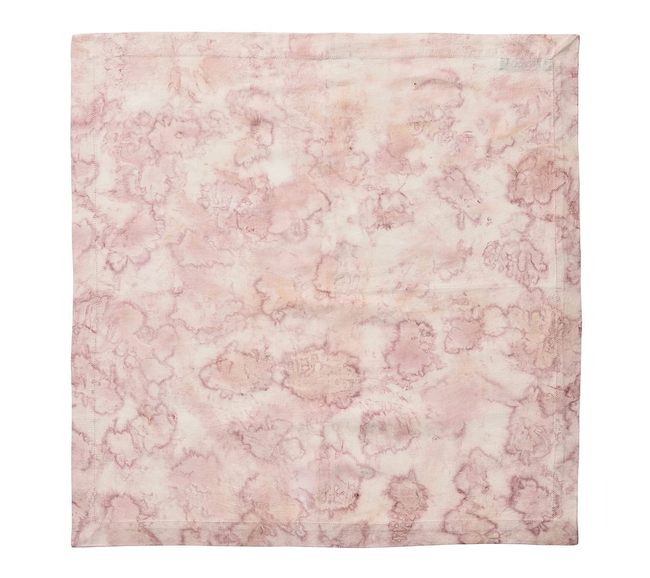 The Boho Napkin embodies the essence of Bohemian style and speaks to an uninhibited philosophy, mixing organic textiles and bold vibrant colors. The hand dying process used is inherently spontaneous. Heat and steam are used to imprint coconut pieces dipped into lac on cotton cloth, creating the organic blush and purple design