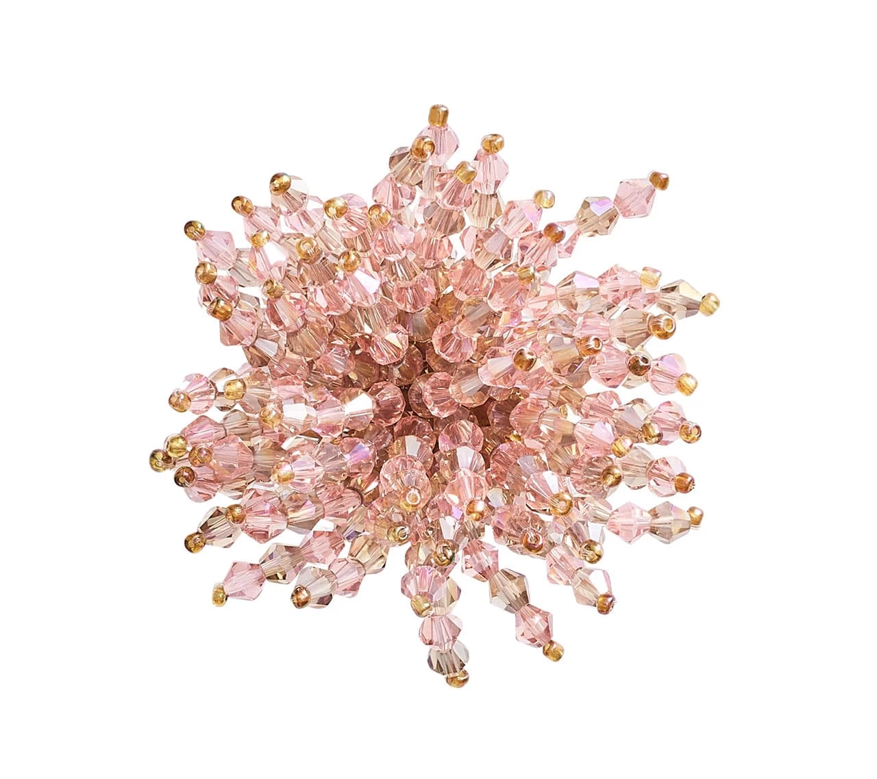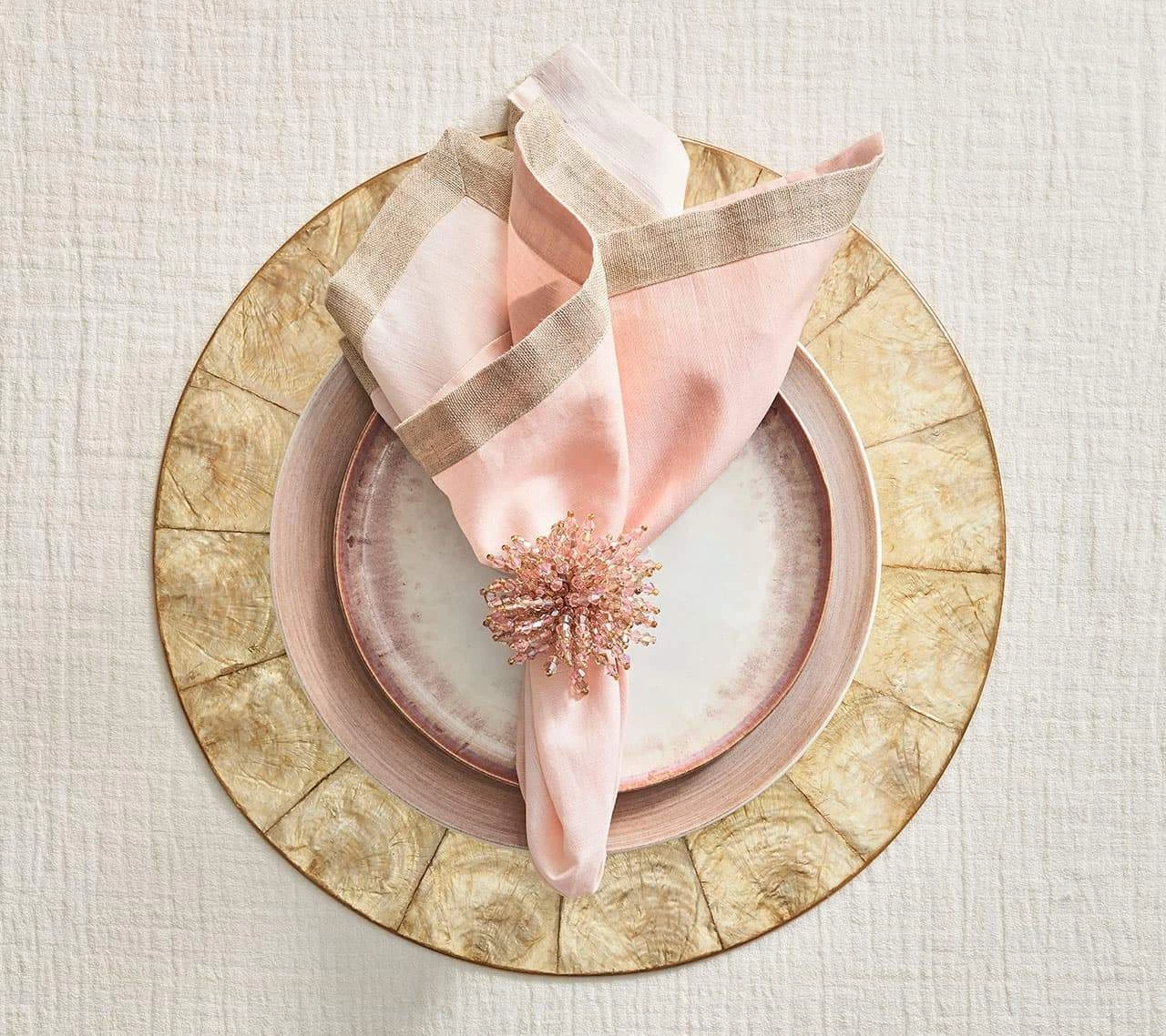 The beaded Brilliant Napkin Ring in blush features fire-polished glass, acrylic and metal beads. The glistening blush napkin ring is hand-crafted, each bead is strung to form a glamorous burst of energy. The perfect beaded napkin ring to accentuate a lavish table or to add sparkle to a more subtle setting.