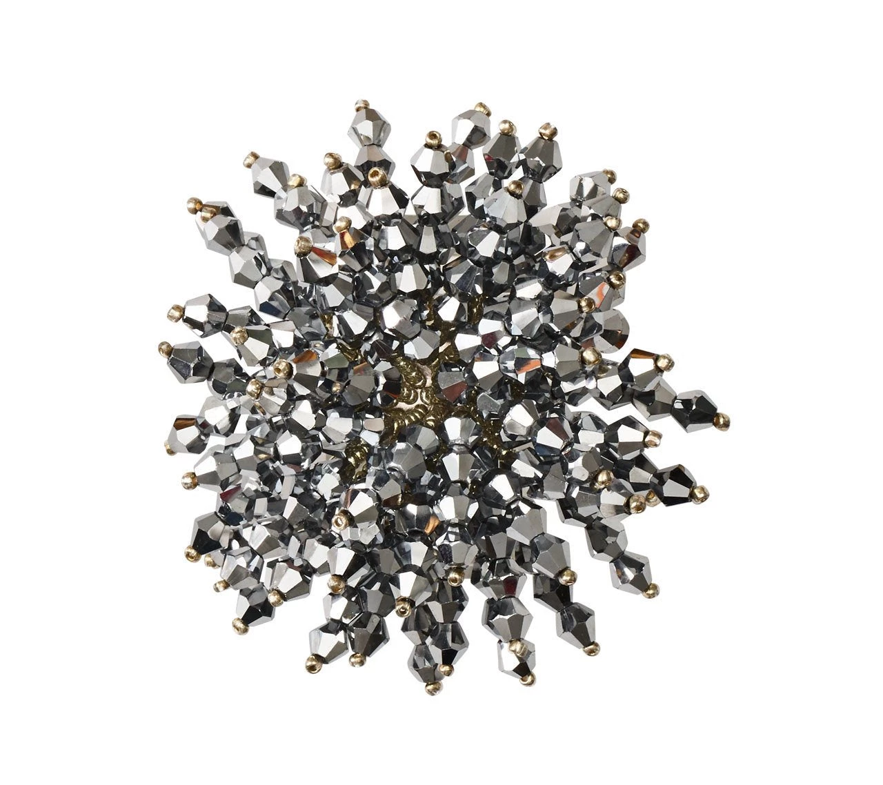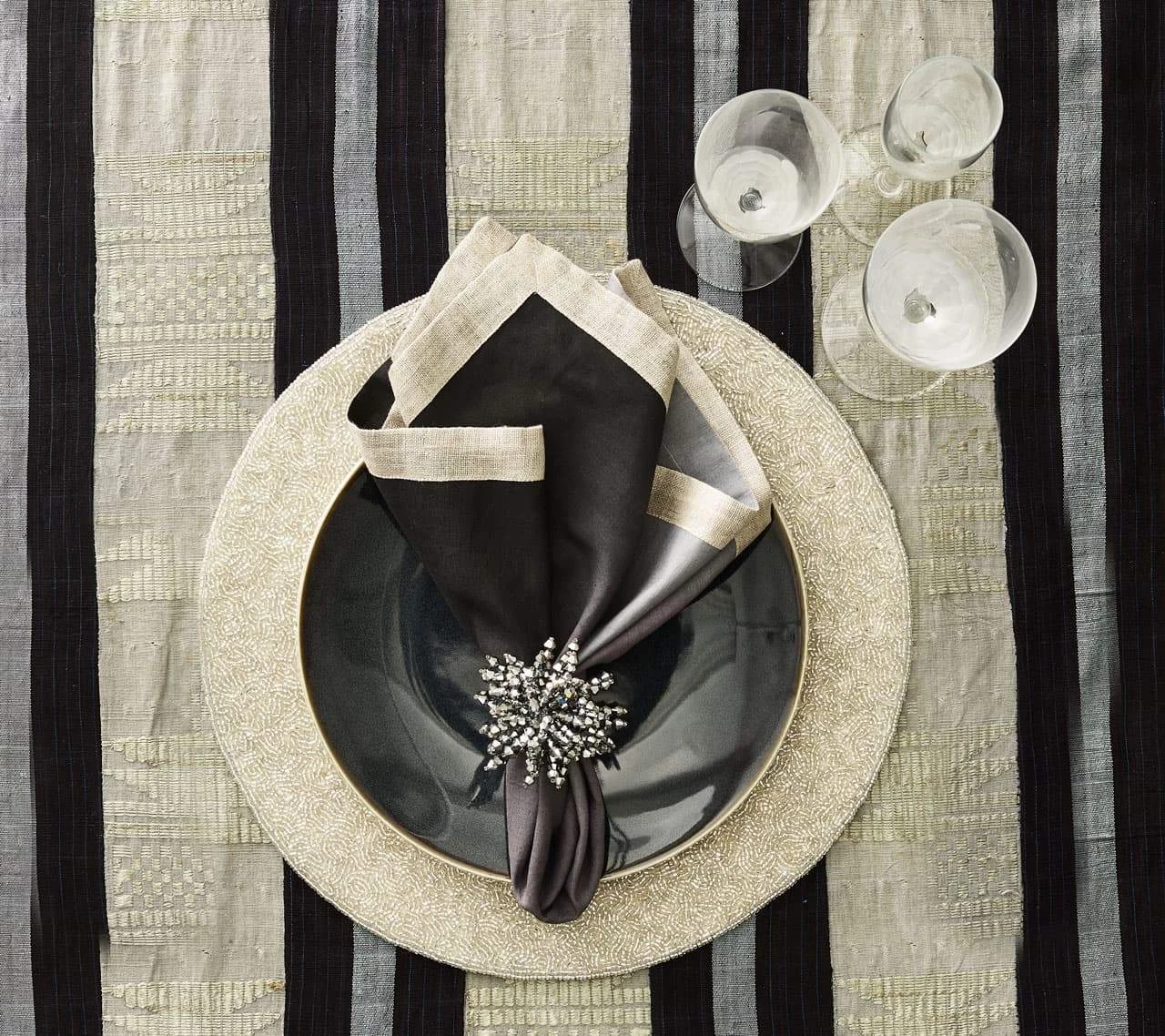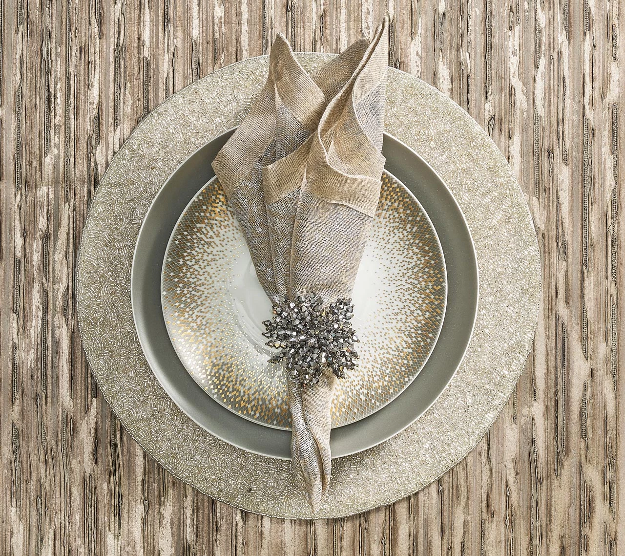 The silver Brilliant Napkin Ring features fire polished silver glass, acrylic and metal beads. The glistening silver napkin ring is hand-crafted, each bead is strung to form a glamorous burst of energy. The perfect napkin ring to accentuate a lavish table or to add sparkle to a more subtle setting.