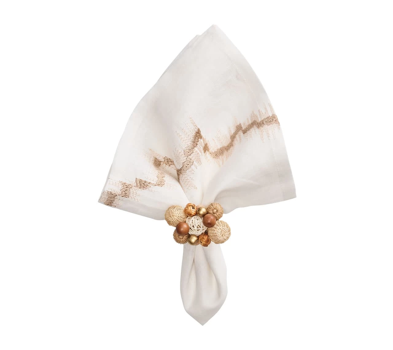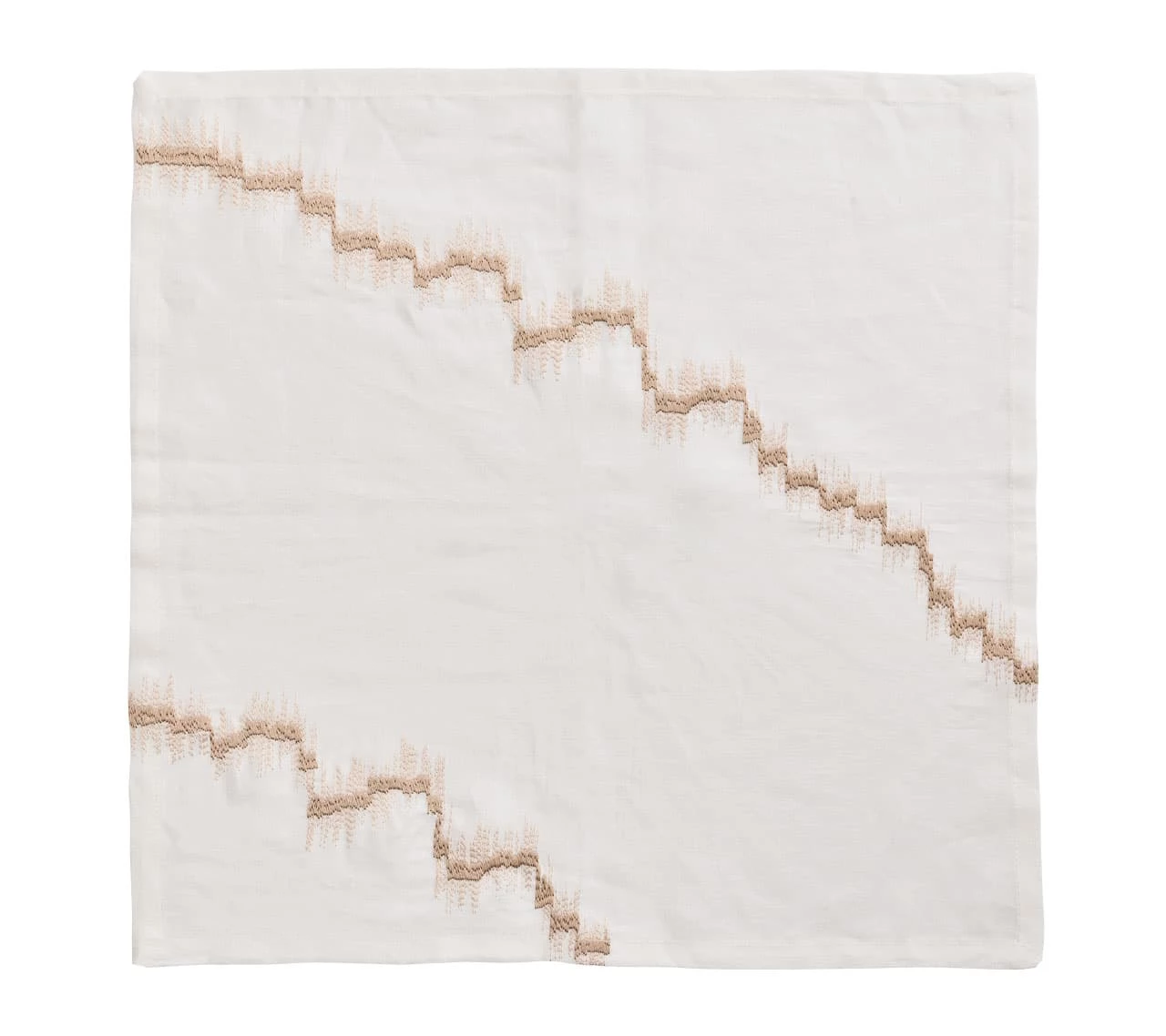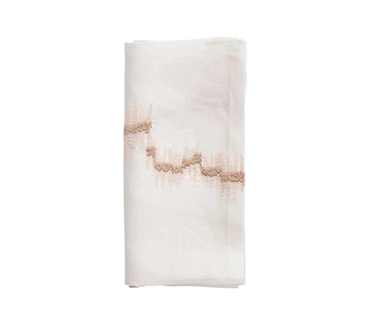 The crisp white linen Brushstroke Napkin is reminiscent of abstract painting. The subtle natural beige embroidery mimics random brushstrokes using the white linen napkin as the canvas. The fluid vertical embroidered lines give the crisp white linen napkin movement. Pair these napkins with lively napkin rings for a bold statement.