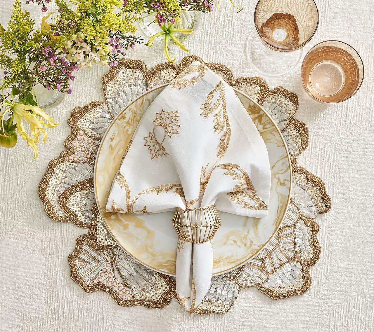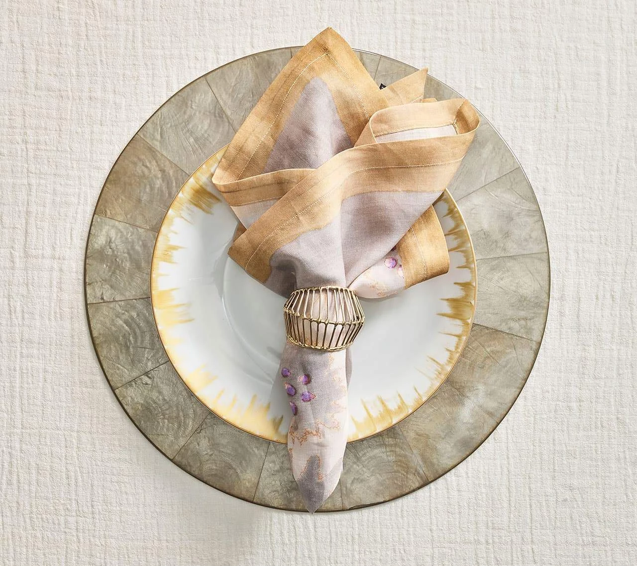 The brass, hand-made Cage Napkin Ring features hand-welded gold spokes in a modern, geometric pattern. The pattern was inspired by the wire enclosure of a birdcage and the hand-made nature of the napkin ring ensures each piece of one-of-a-kind. Brass patinas over time, a change in color is part of the organic design.