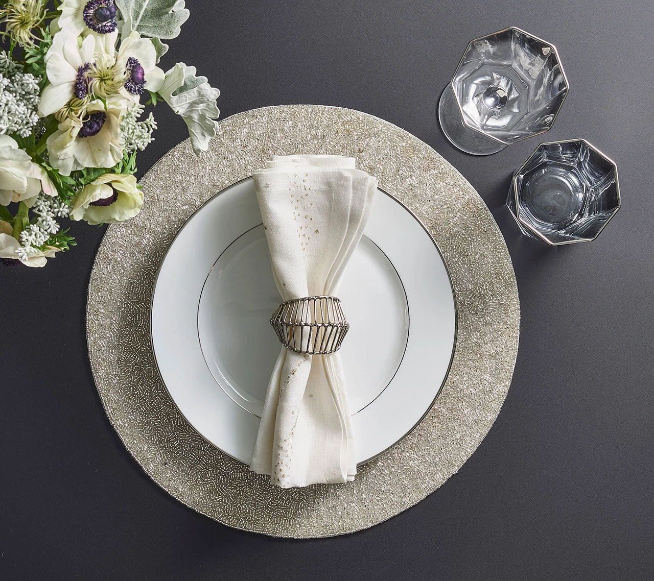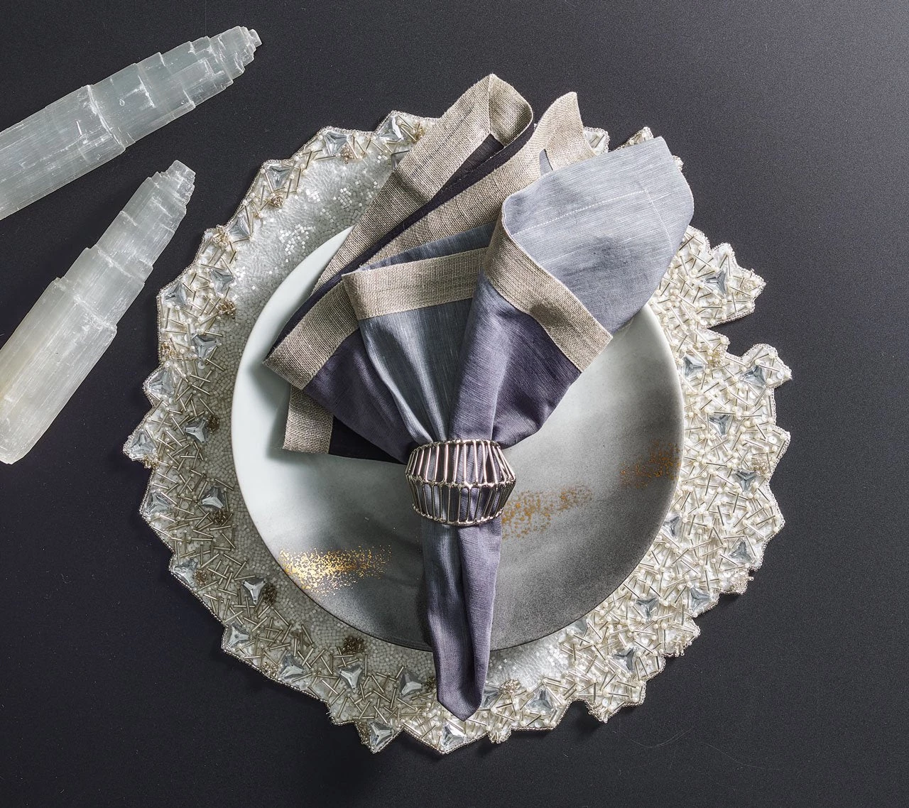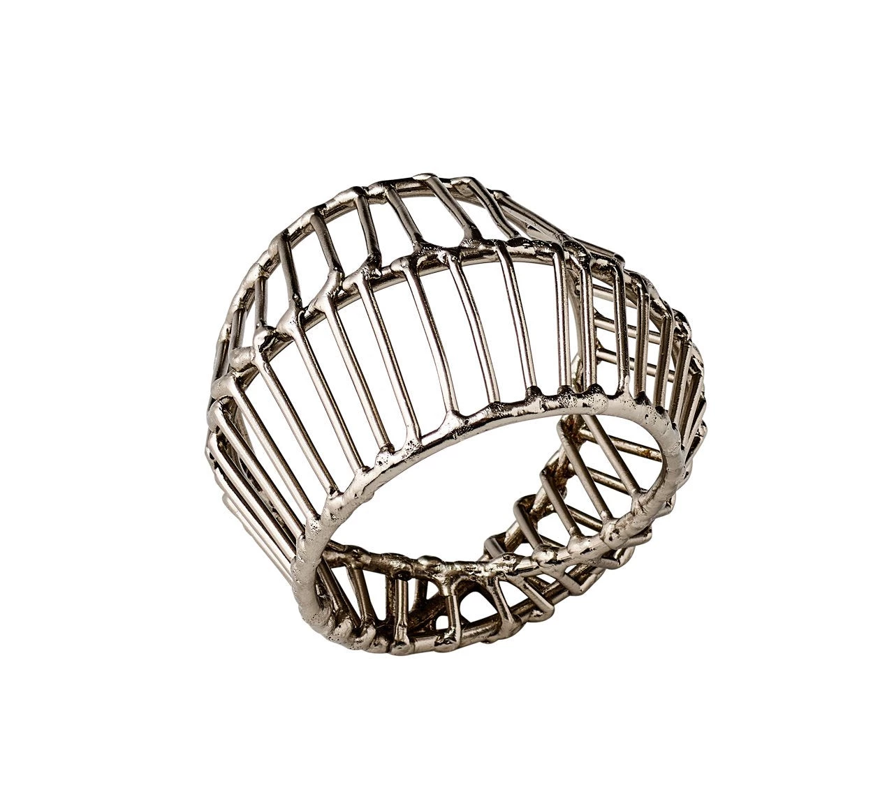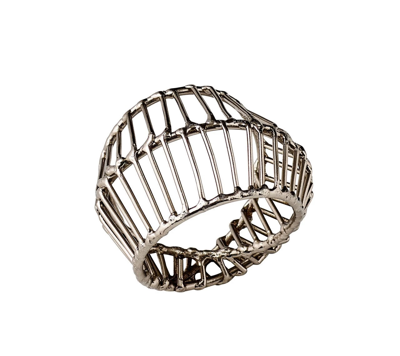 The brass, hand-made Cage Napkin Ring features hand-welded silver spokes in a modern, geometric pattern. The pattern was inspired by the wire enclosure of a birdcage and the hand-made nature of the napkin ring ensures each piece is of one-of-a-kind. Brass patinas over time, a color change is part of the organic design.