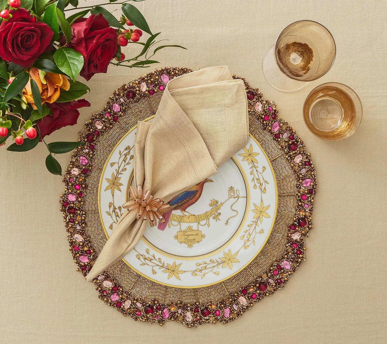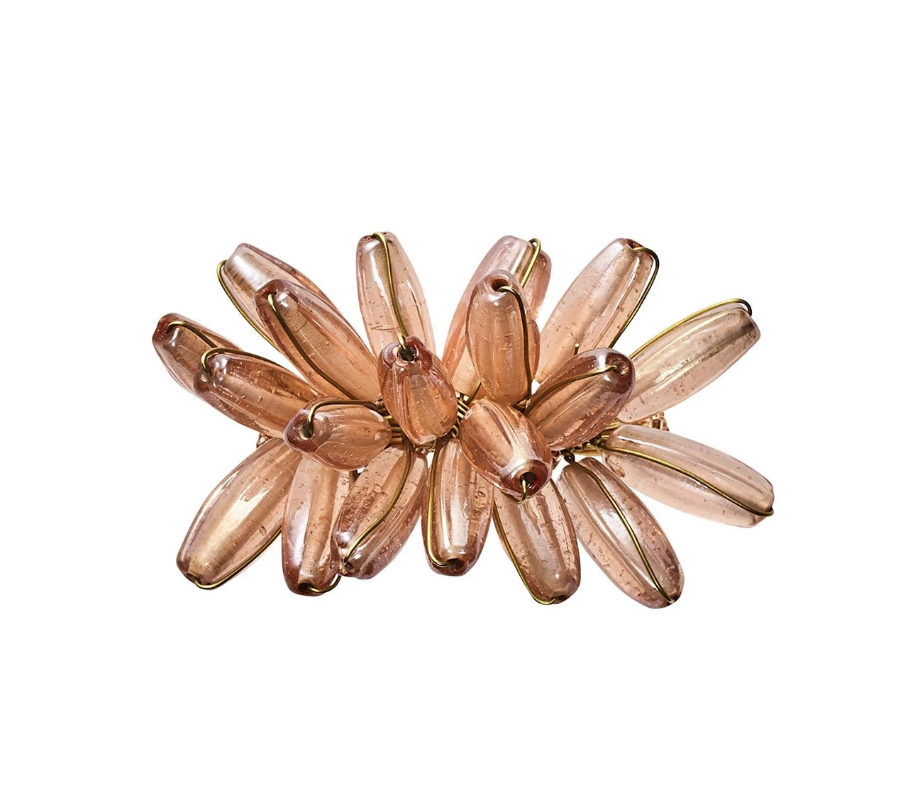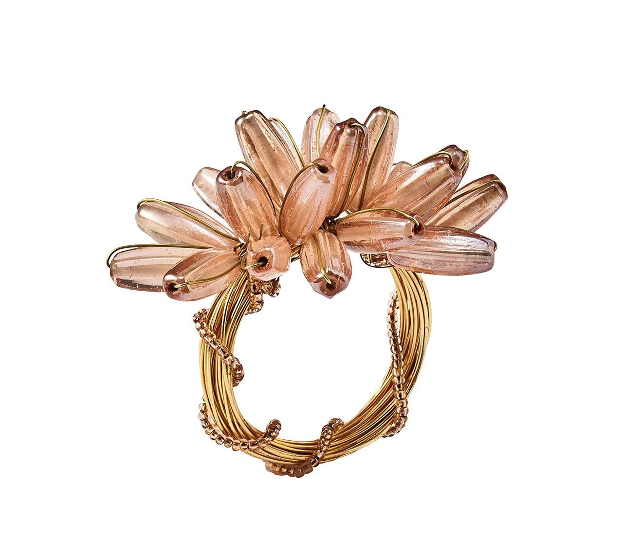 The refined Camellia Napkin Ring features smooth, cylindrical blush beads arranged in a floral pattern. This versatile napkin ring works well in a light and airy design or adds an elegant touch to a more dramatic setting.