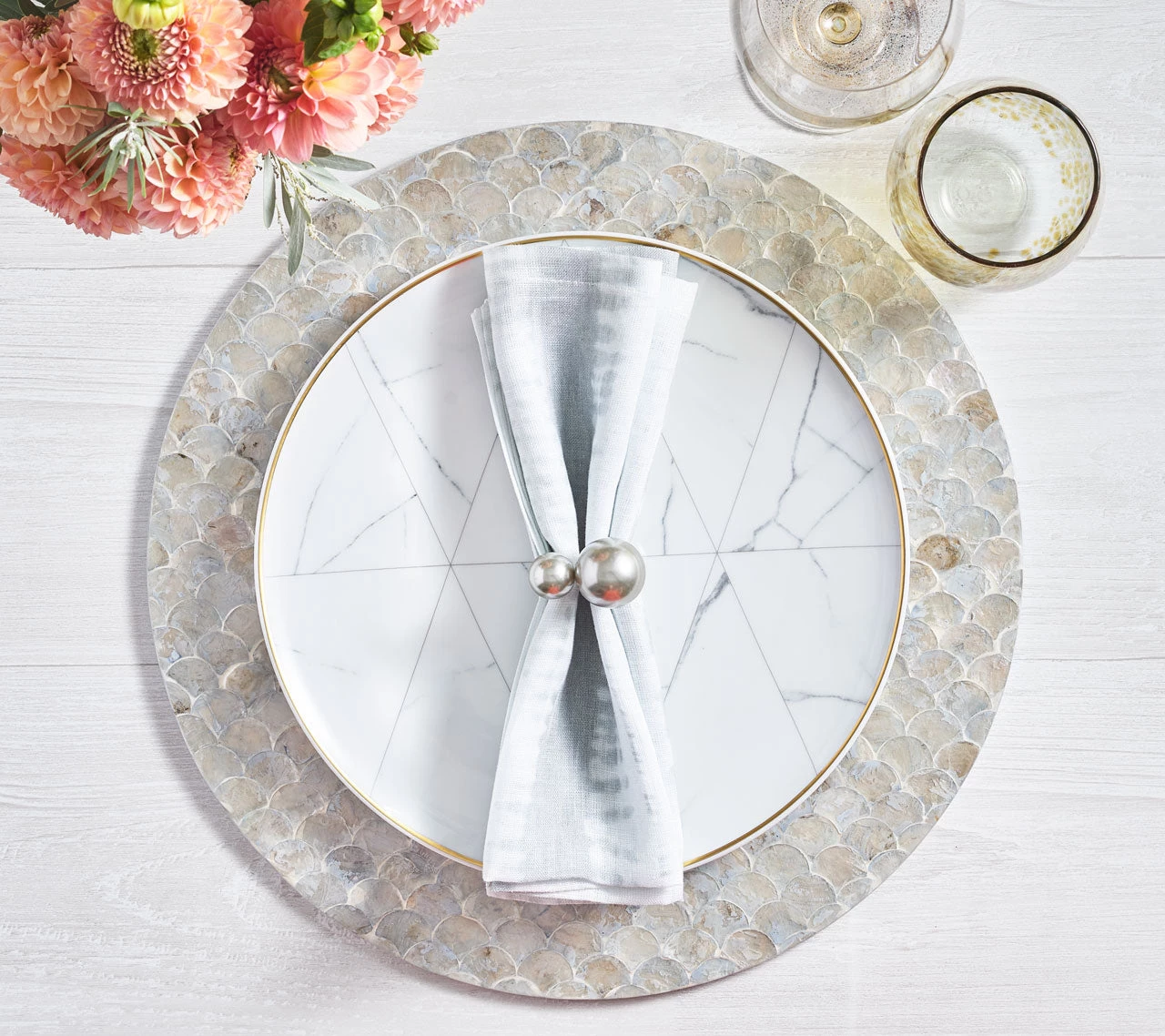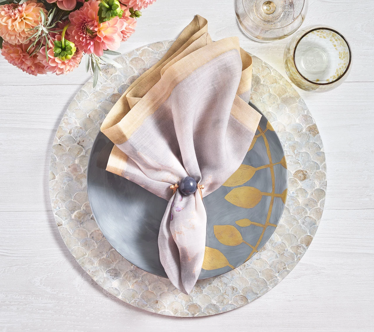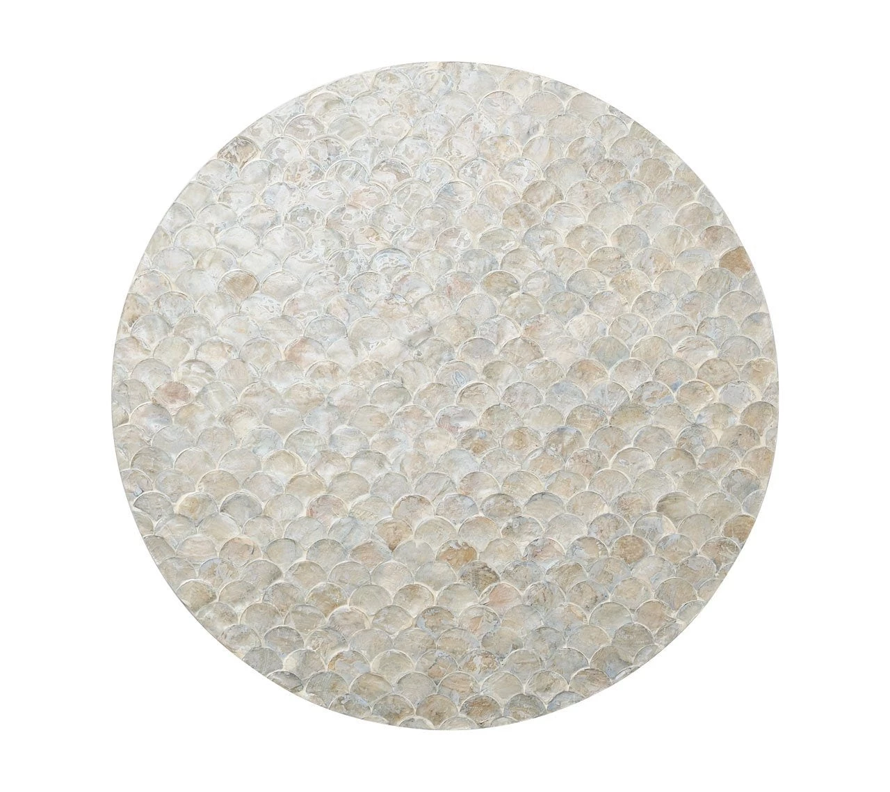A softer take on the scalloped design motif found on traditional china dinnerware, the round Camellia Placemat features hand-dyed Capiz shells in a muted gray. Each naturally occurring shell absorbs the dye differently allowing for stunning color variation. The shells are hand-placed in a scale-like pattern, creating a one-of-a-kind product.