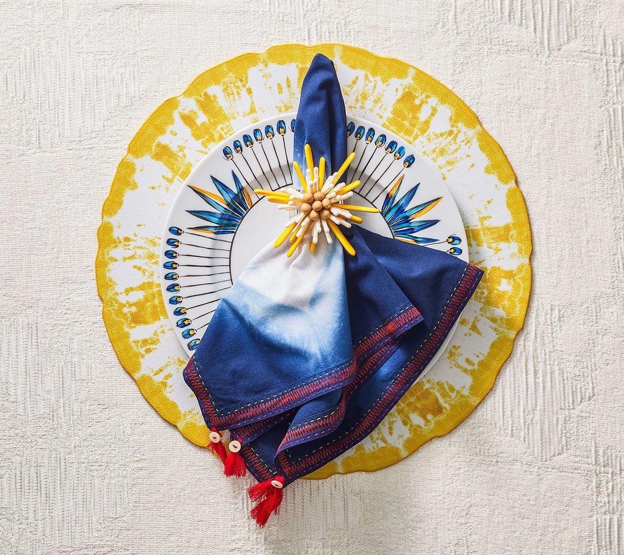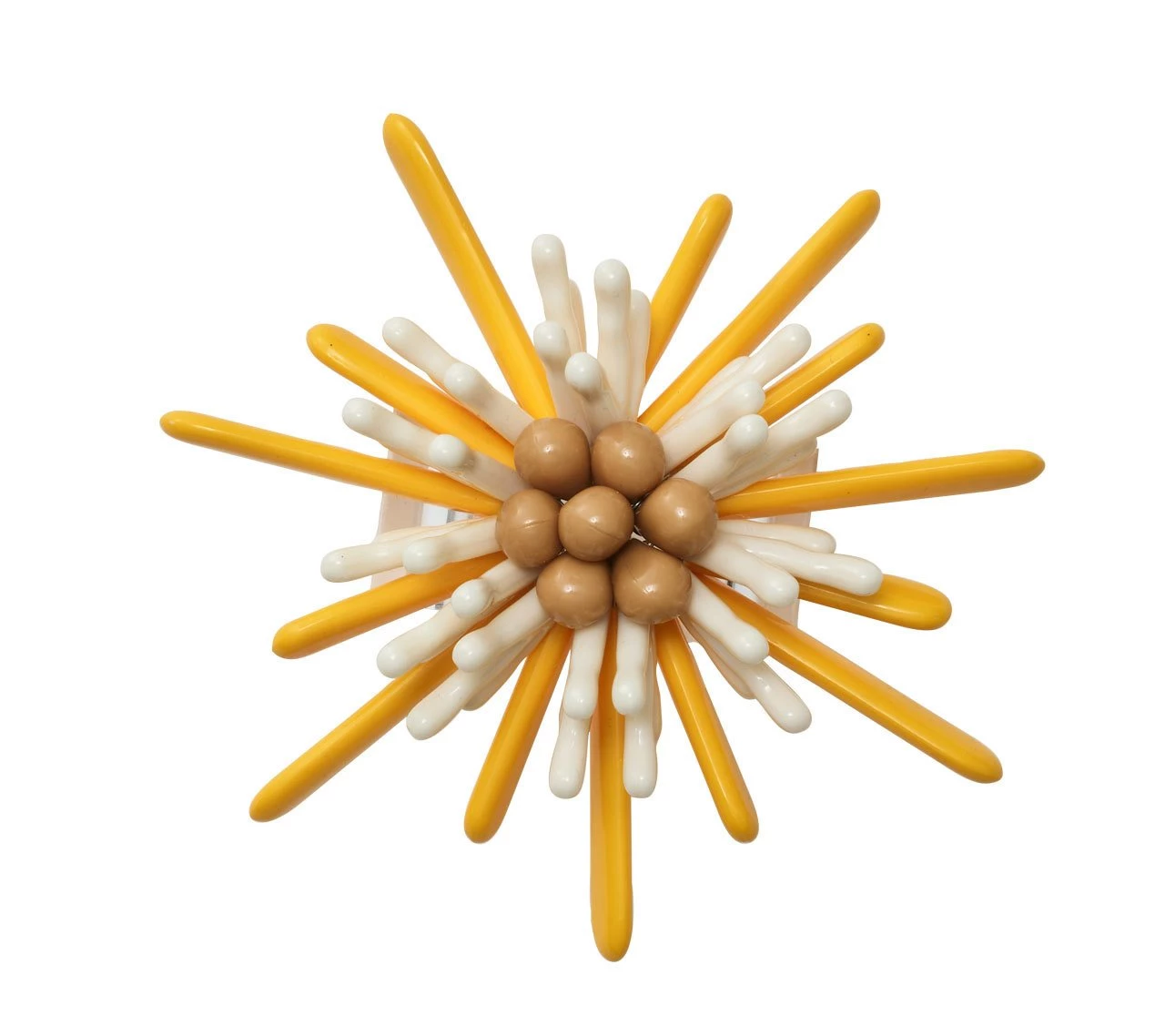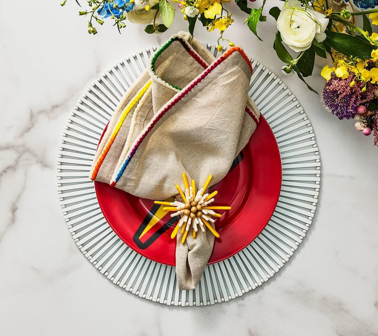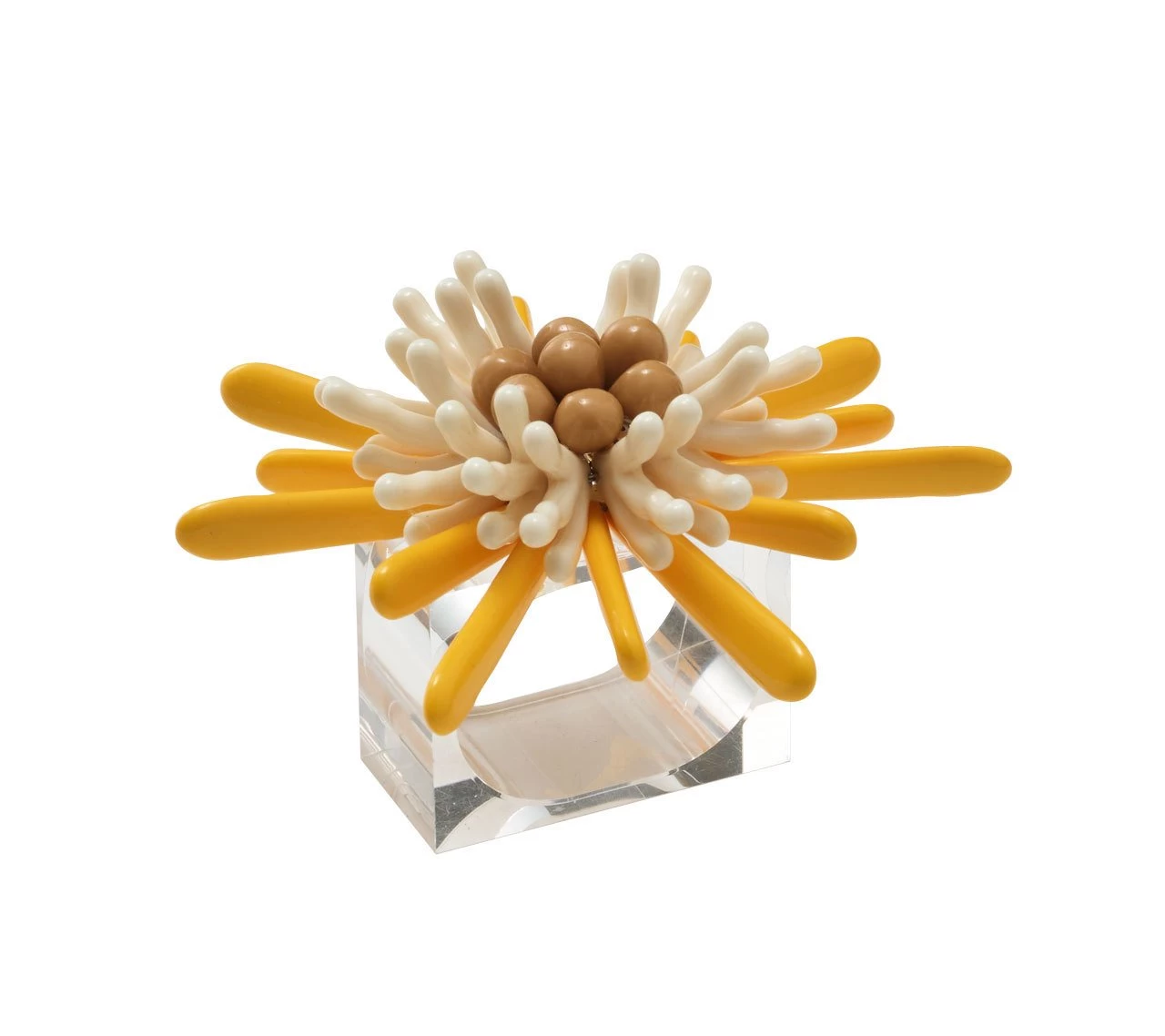 The Capri Napkin Ring draws inspiration from the ocean, a yellow and white color scheme in a sea creature radial pattern. Smooth, acrylic beads in various lengths and shapes, adding an element of surprise to the table.