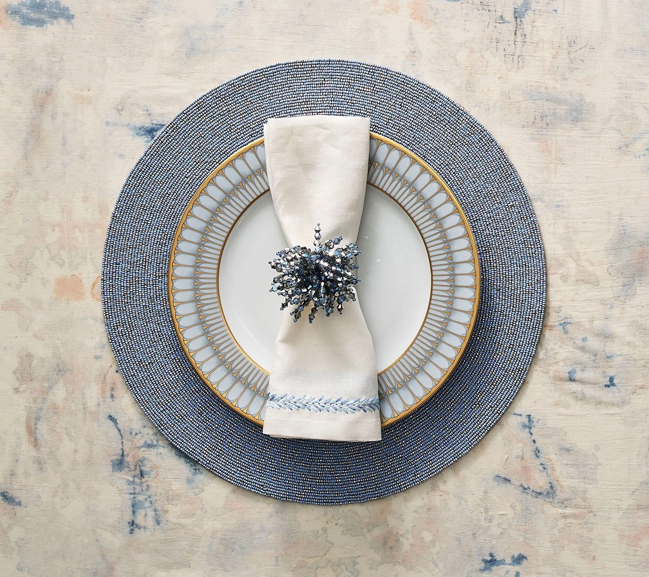 Throwing a glitzy dinner party? Then don’t forget to use the Kim Seybert Confetti placemats as glamorous foundations for your place setting. Hand made using shiny microbeads they create the effect of an explosion of glitter. Hand beaded in silver and periwinkle, a spring-inspired color this season, use them under classic white plates or pair them with monochromatic dinnerware.