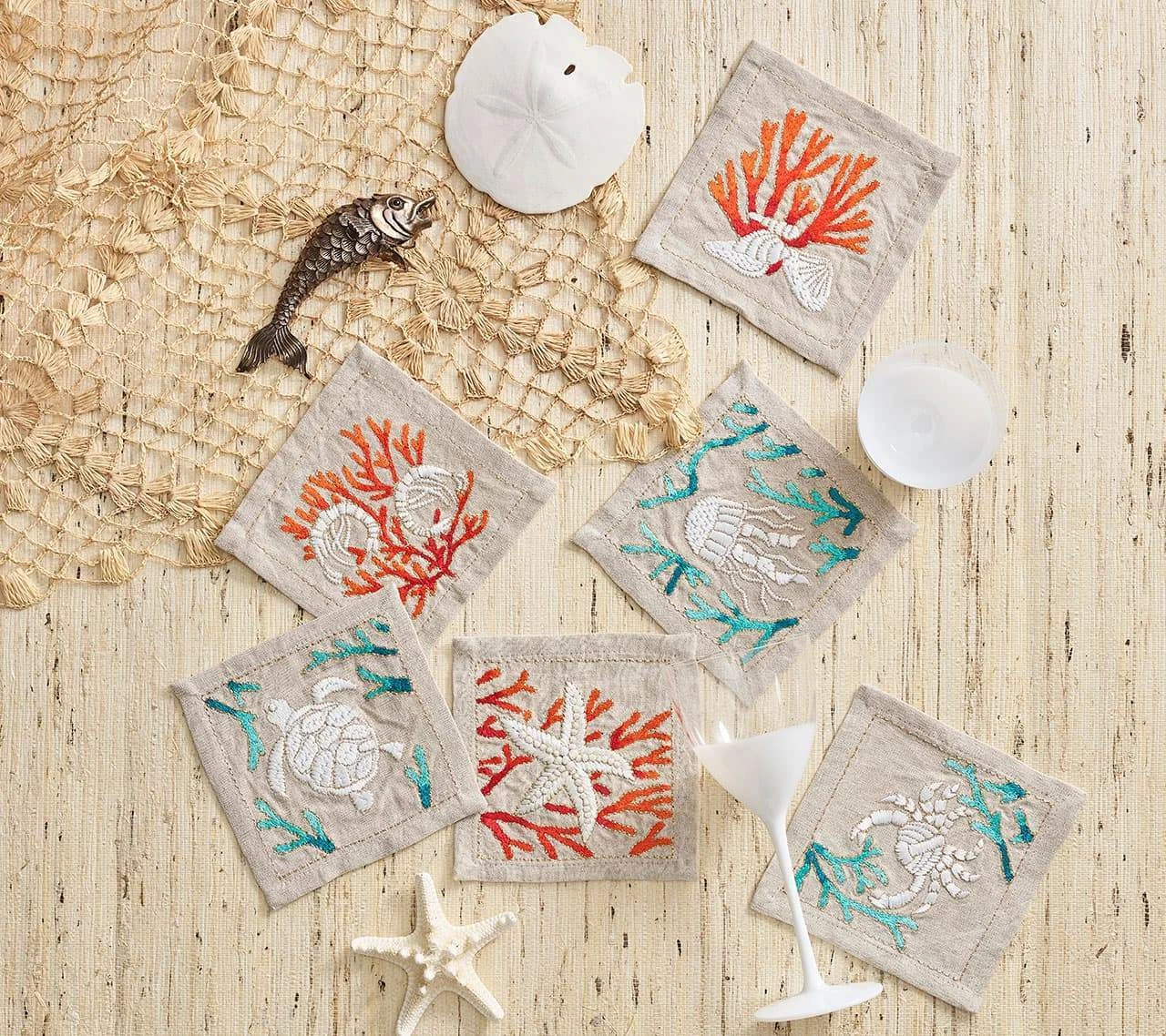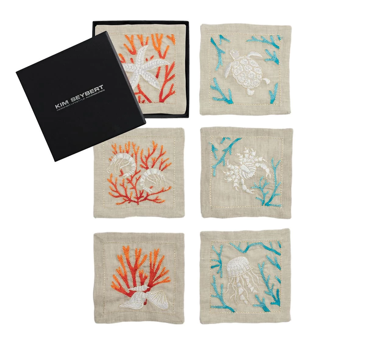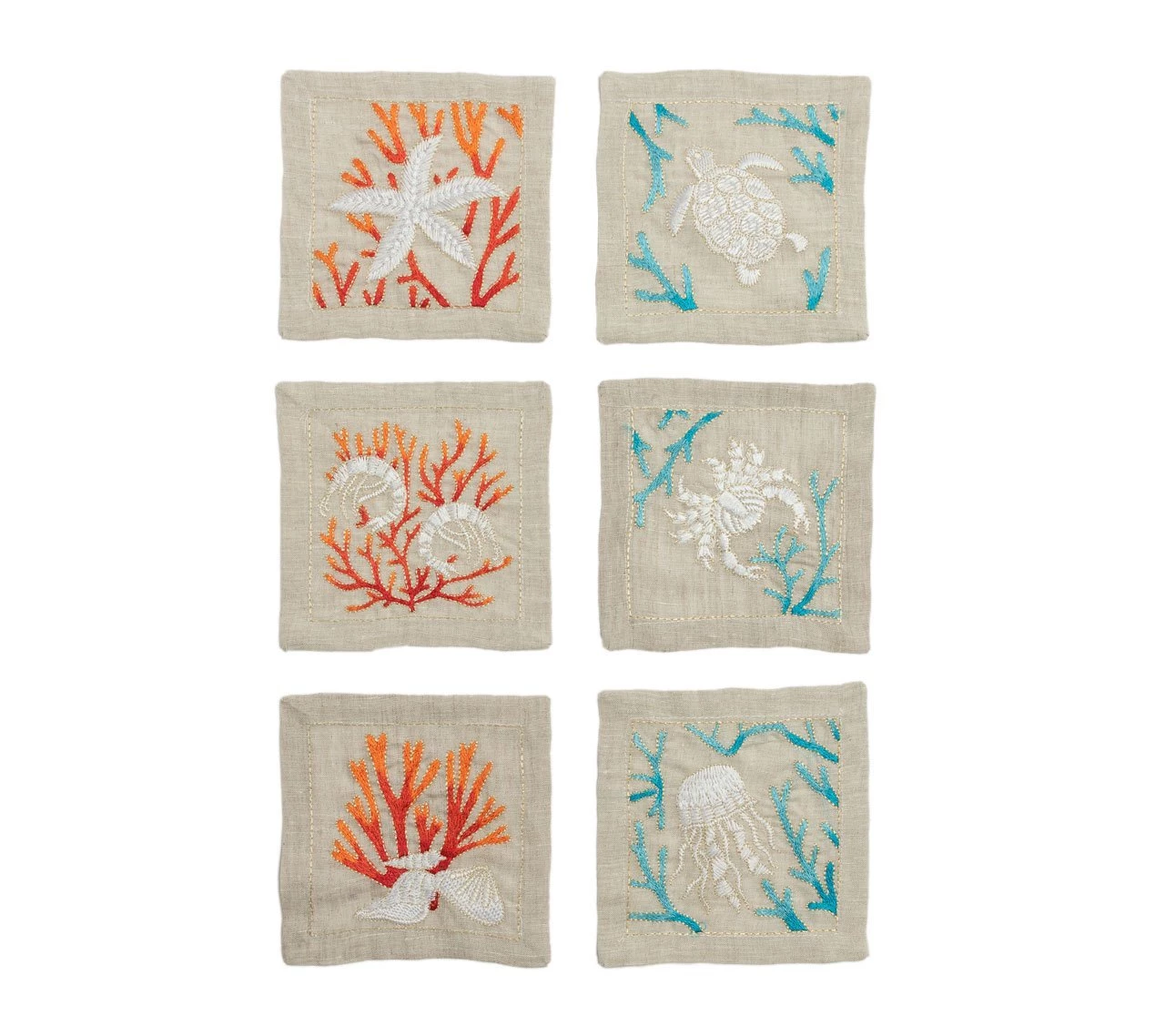 The embroidered linen Cozumel Cocktail Napkins feature six different embroidered seascape images in brilliant blues, vibrant corals and rich oranges. Embroidered coral clusters and imaginative marine plants adorn these intricate aquatic-themed linen cocktail napkins.