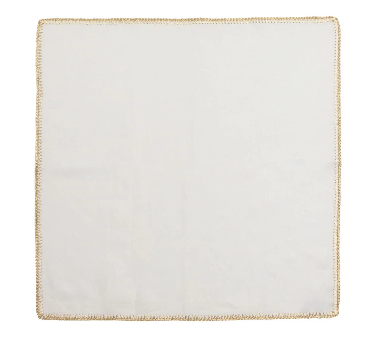 The white linen Crochet Edge Napkin features a crisp cloth napkin with an intricate gold crochet edge. Like a pretty package, this sweet linen napkin with gold trim is ready to be opened and used at every opportunity. The perfect white linen napkin for a classic, sophisticated table, wedding celebration or bridal shower.