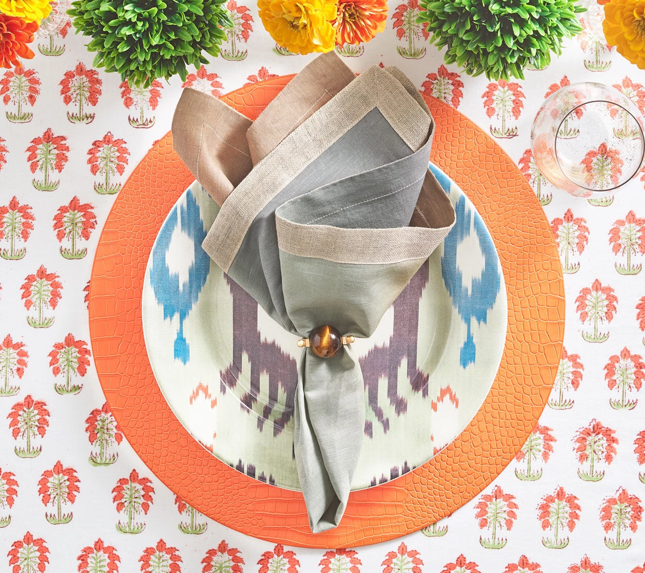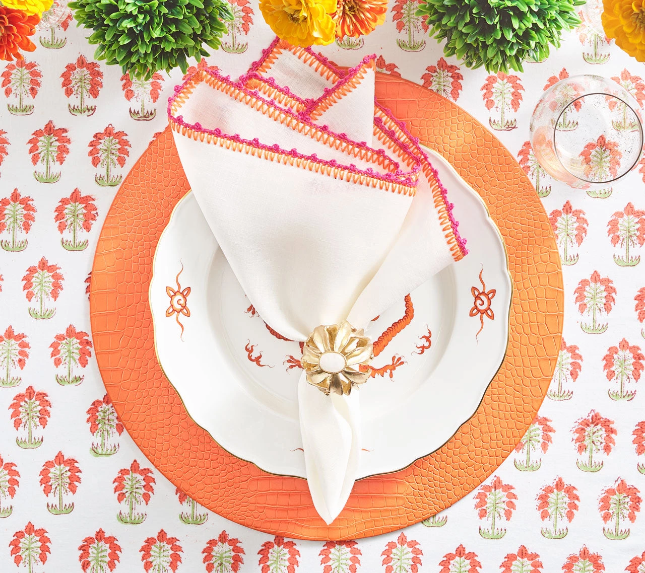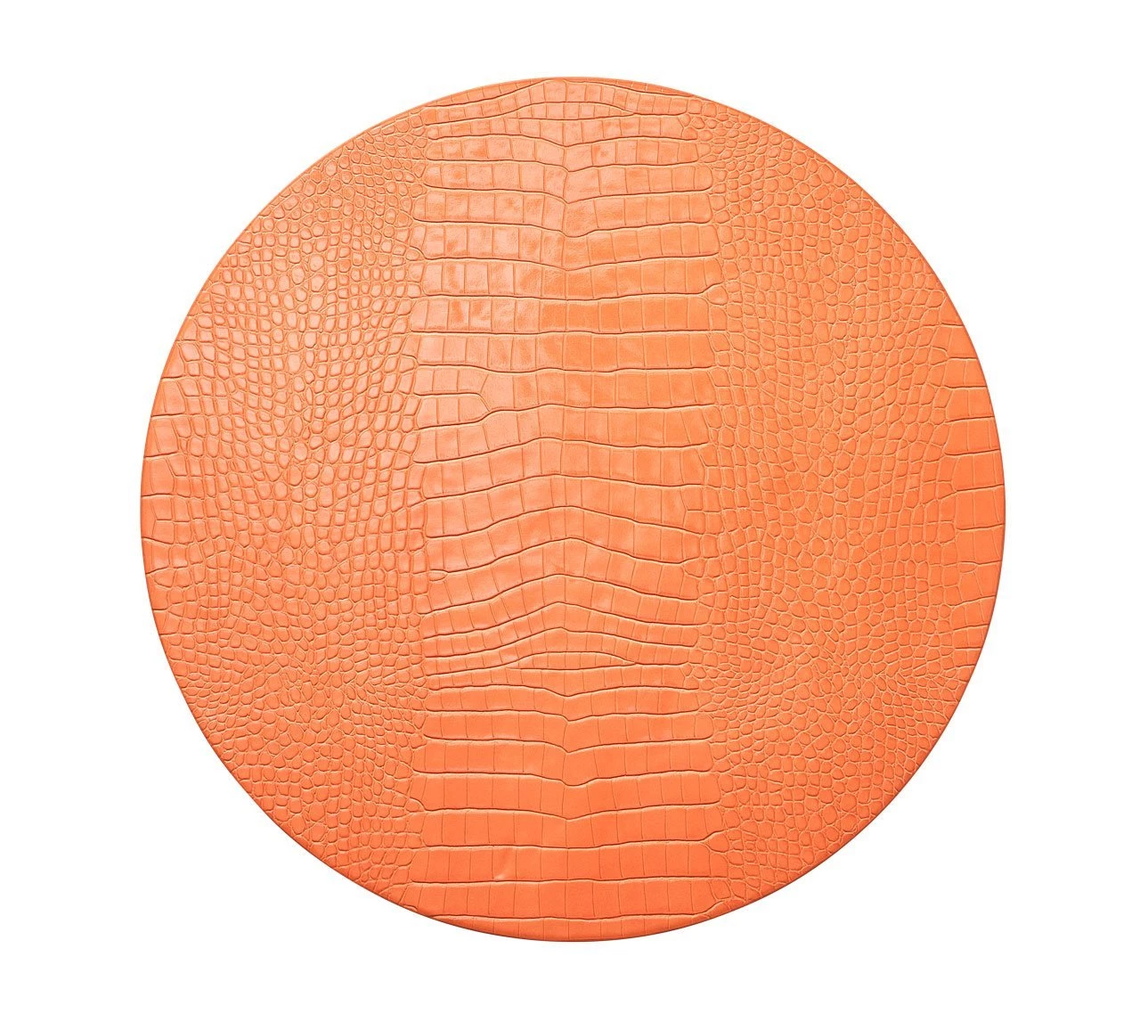 The round embossed faux Croco Placemats are the perfect staple for a holiday table. The festive yet sophisticated crocodile pattern in orange works in any season. The vibrant orange placemat completes a springtime soiree or complements a well-appointed fall table. Perfect for entertaining, these placemats are easy to care for; simply wipe them down before storing them.