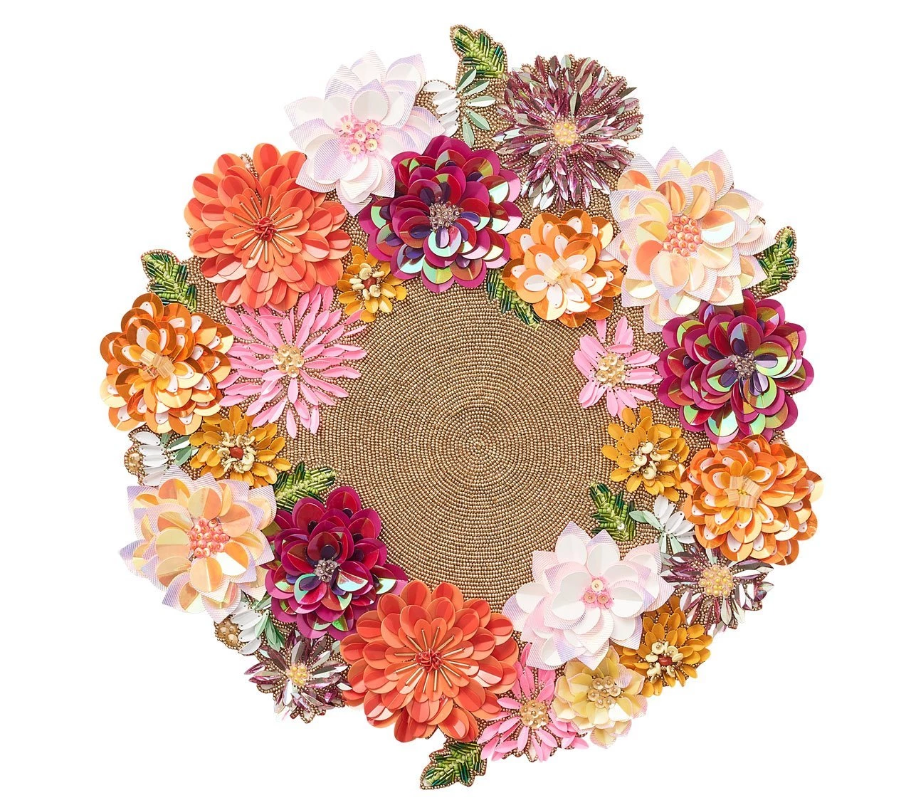 Named for the summer-blooming flower that signifies elegance and strength, the exquisite Dahlia Placemat radiates magnificence. Over 35 sequins and beads in vibrant pink, orange and amethyst colors are hand-layered and folded to create the three-dimensional Dahlia Placemat.