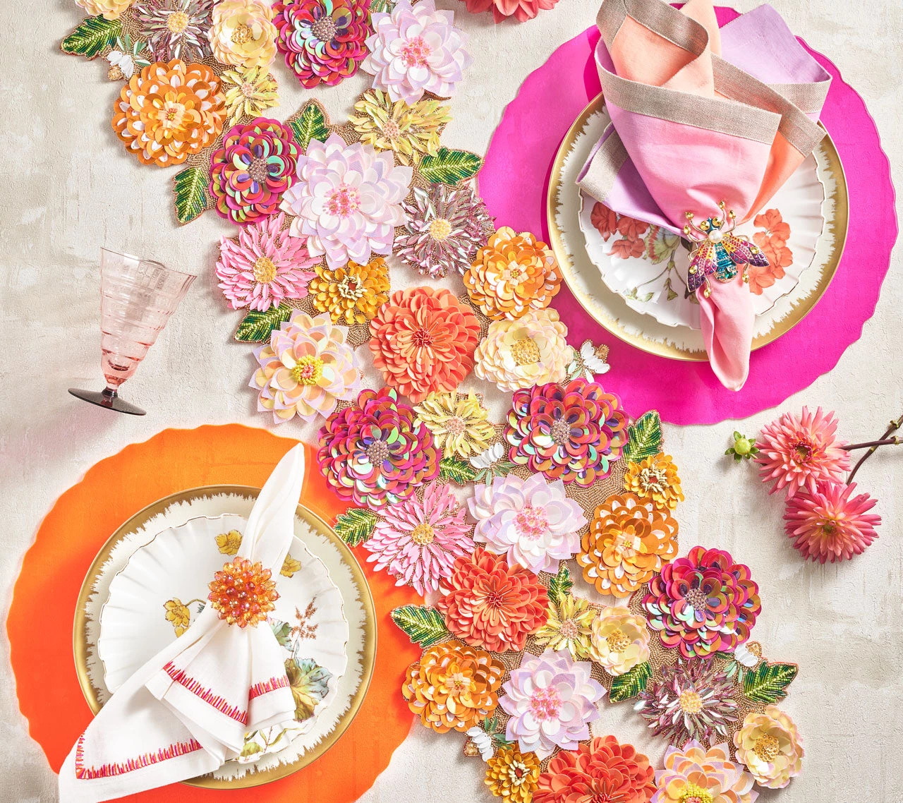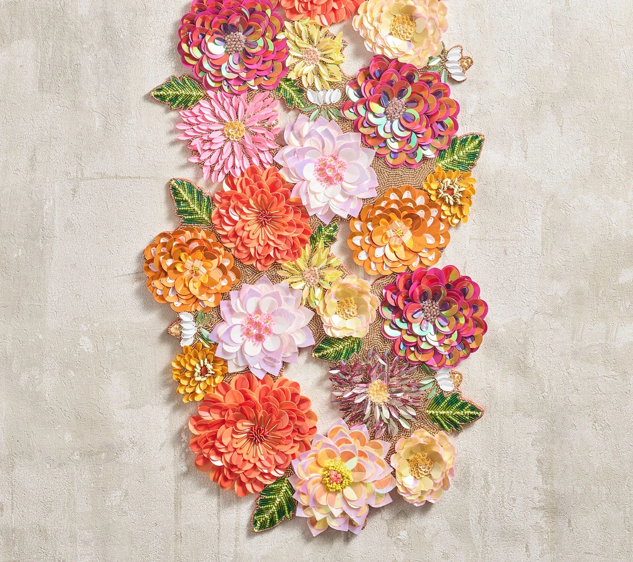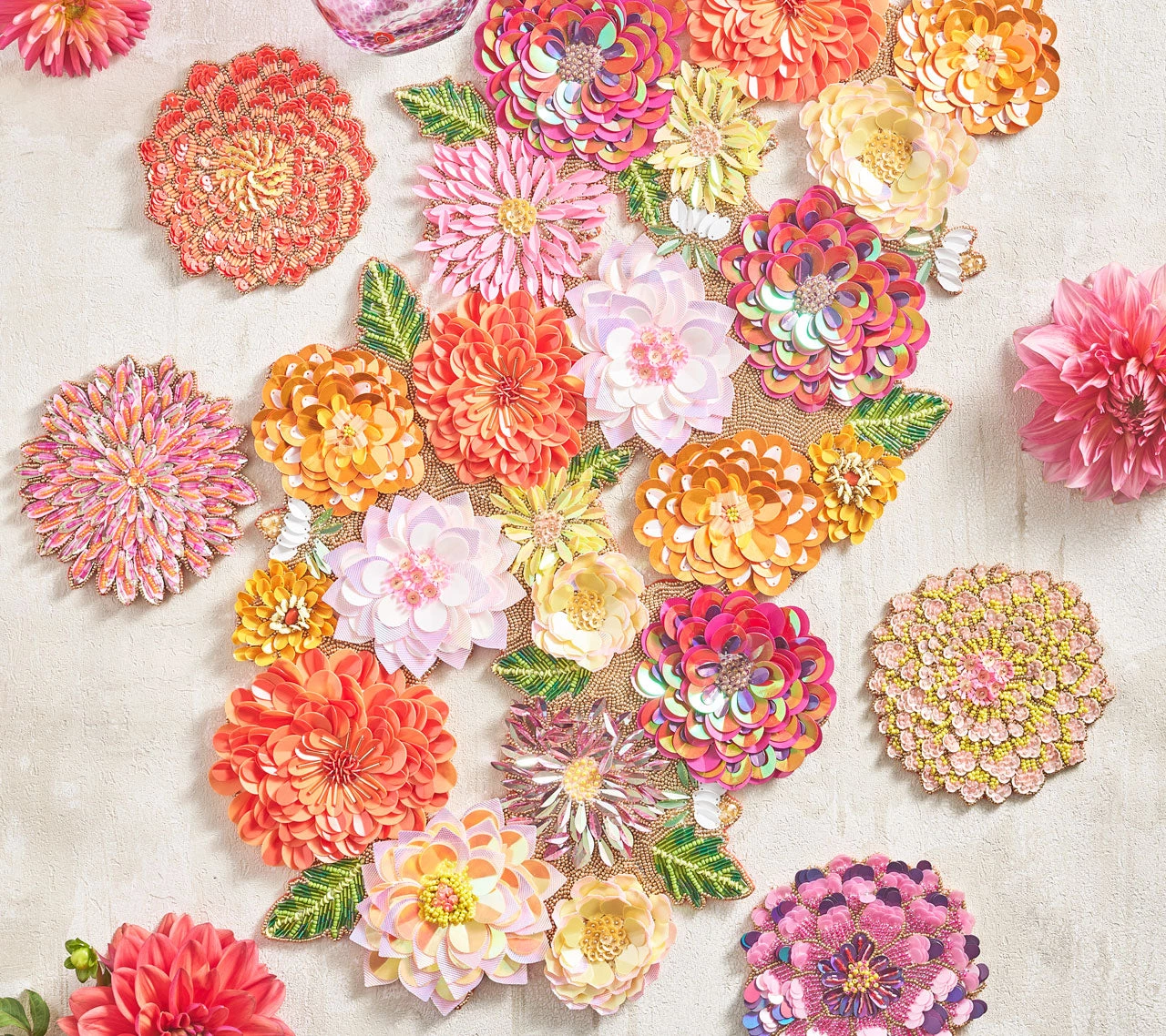 Named for the summer-blooming flower that signifies elegance and strength, the exquisite Dahlia Runner radiates magnificence. Over 35 sequins and beads in vibrant pink, orange and amethyst colors are hand-layered and folded to create the three-dimensional Dahlia Runner.