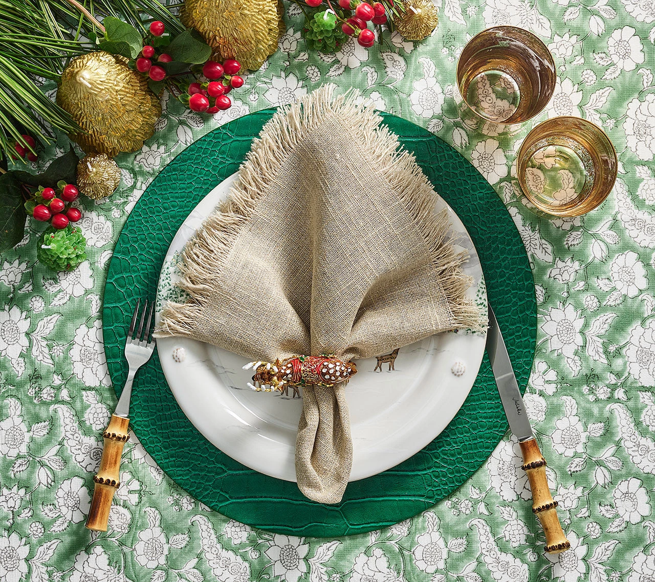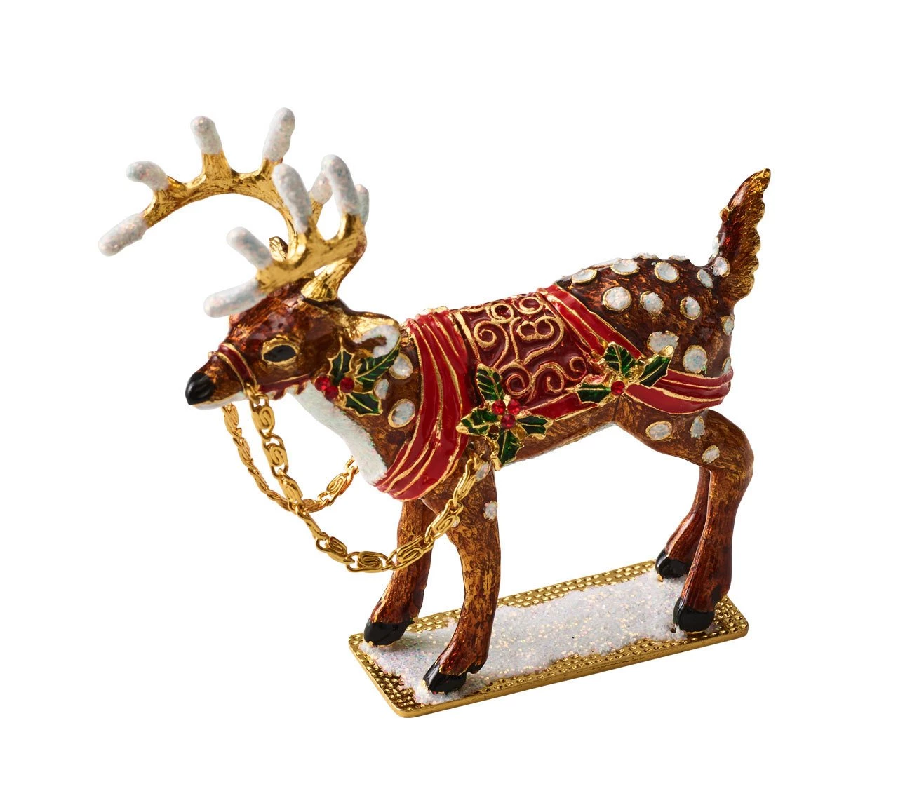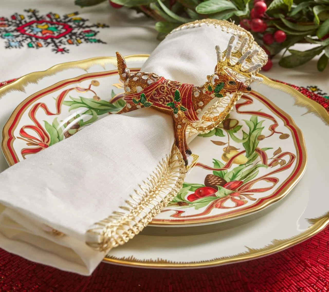 Add a fun and whimsical touch to your Christmas parties with our hand painted enamel reindeer napkin ring named after one of Santa’s helpers. It is in the traditional colors of the season and is sure to bring joy to those you’ve gathered around your table.
