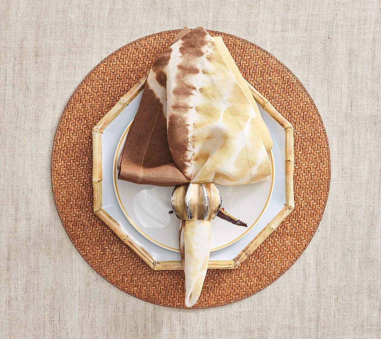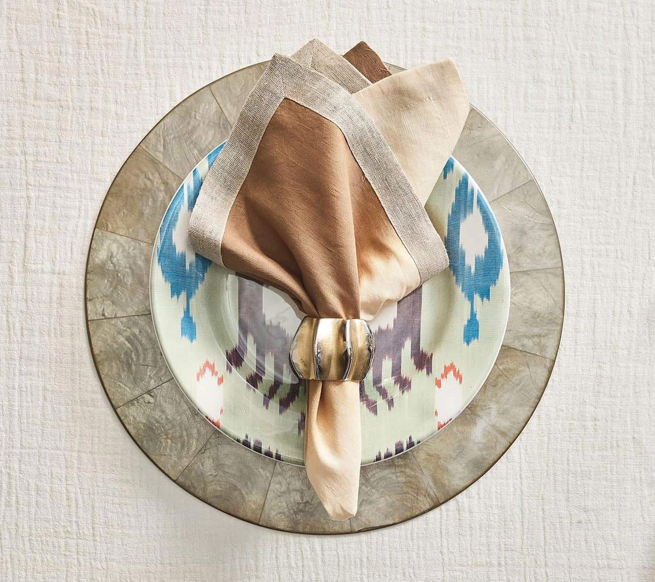 The Desert Napkin Ring is cast in two-tone gold and silver metal works with any style setting. Its protruding edges are hand-polished to reveal the silver-color plating beneath, creating a subtle air of elegance. Pair with an elegant white linen napkin or an ornate beaded placemat, the metal Desert Napkin Ring is a showstopper.