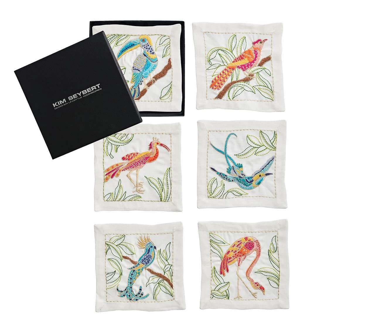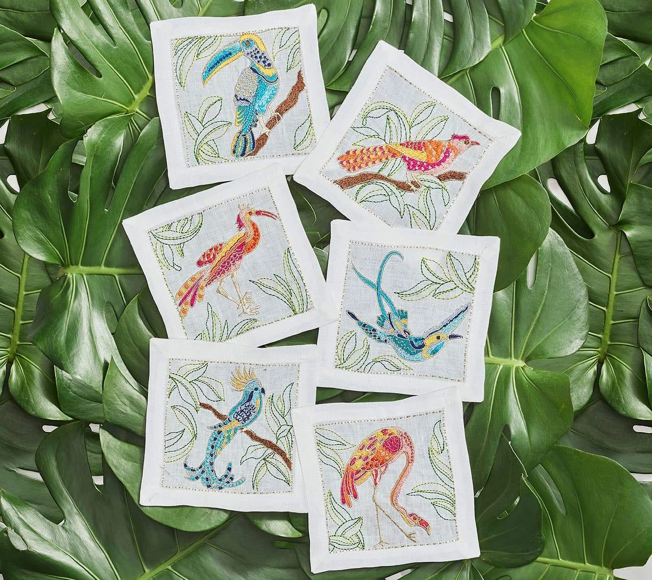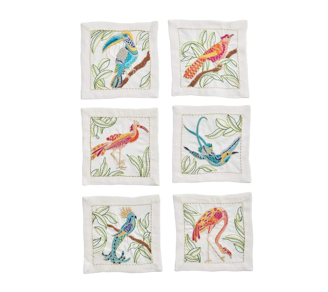 The linen embroidered Birds of Paradise Cocktail Napkins feature six different exotic birds on a stark white linen napkin. Each bird is hand-drawn then intricately embroidered on the linen cocktail napkin. There is a delicate balance between the colorful embroidered birds and the subtle background greenery.
