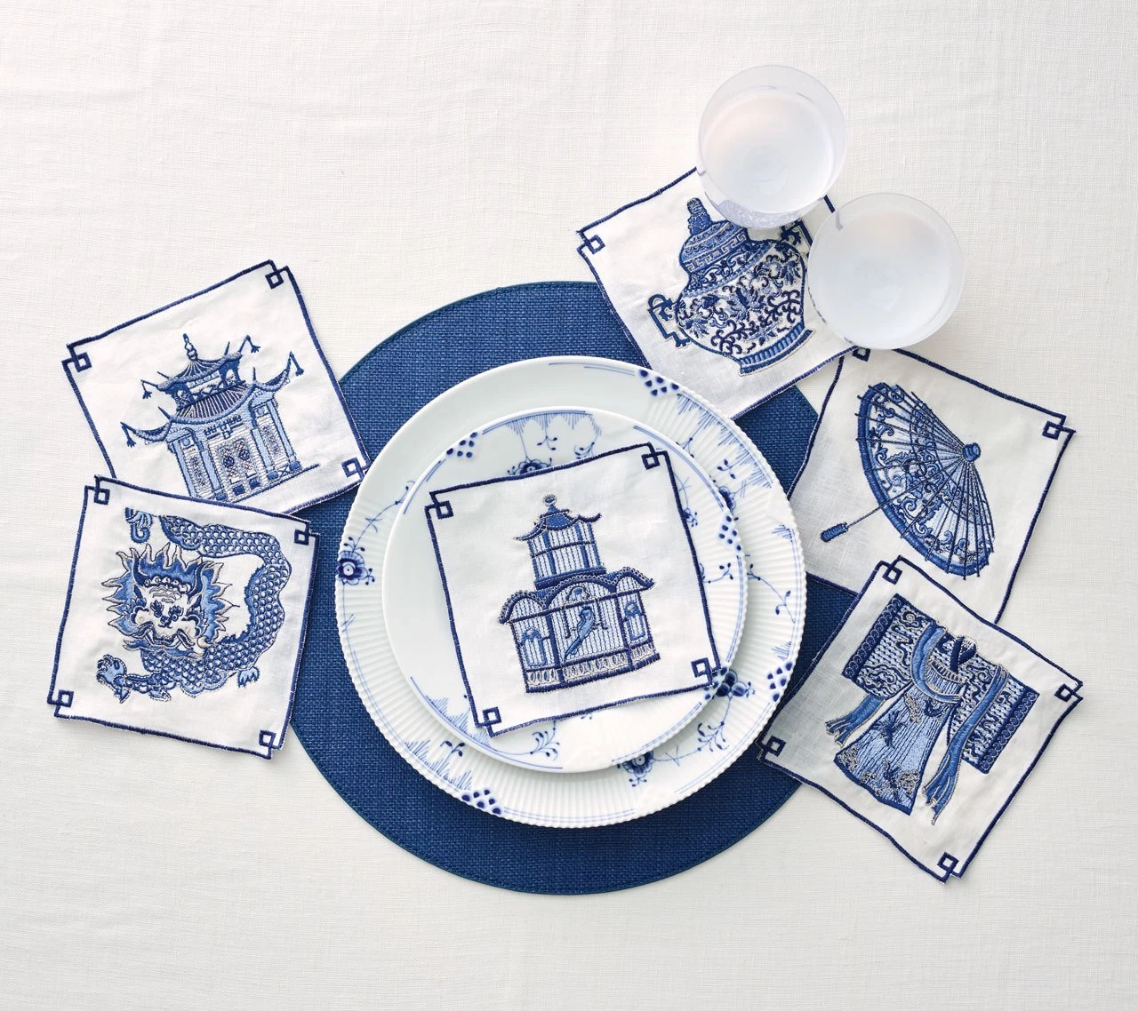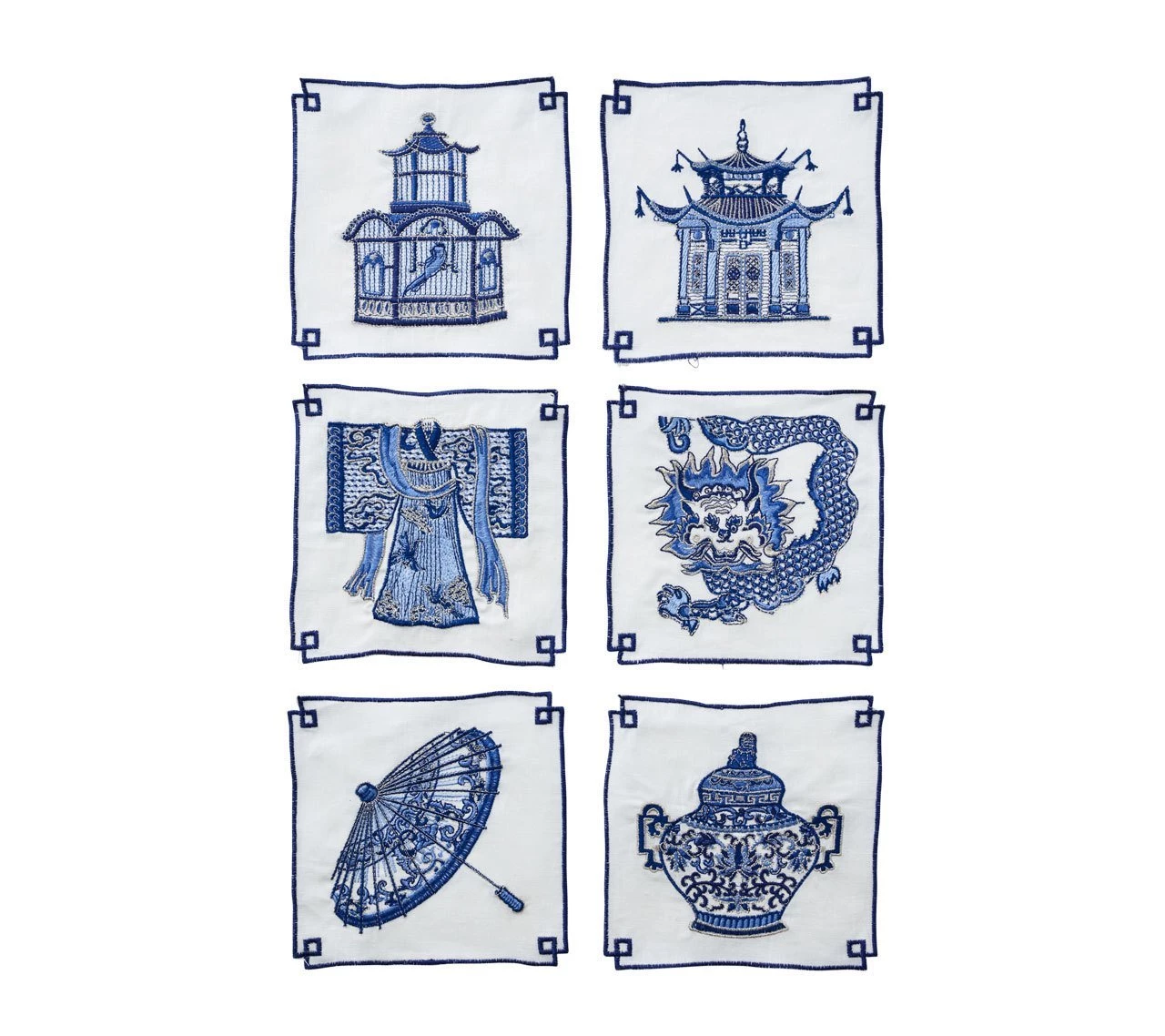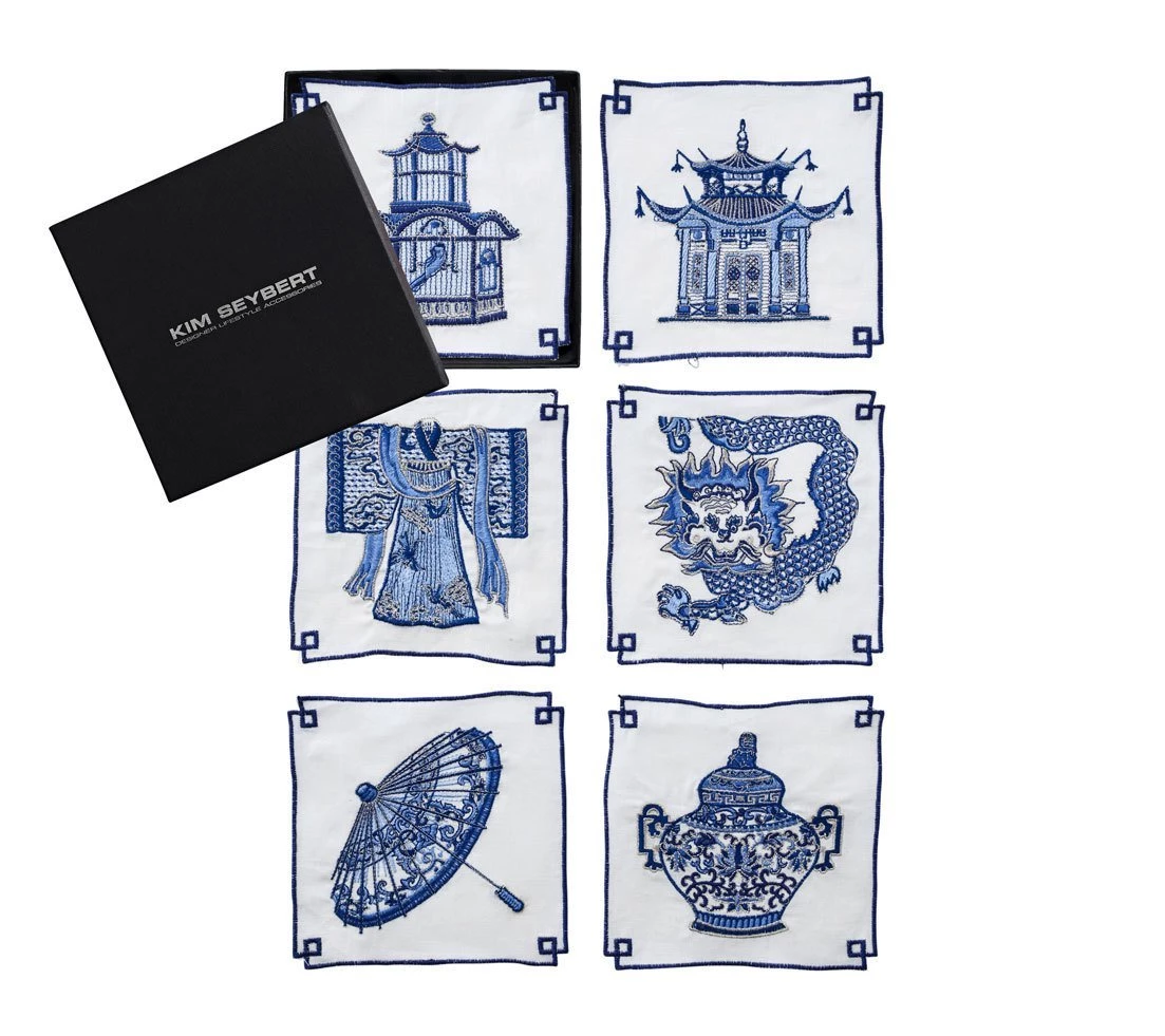 Our love for all things chinoiserie will never fail. And who wouldn’t fall for these white linen cocktail napkins which feature embroidered pagodas, parasols and birdcages on blue thread?