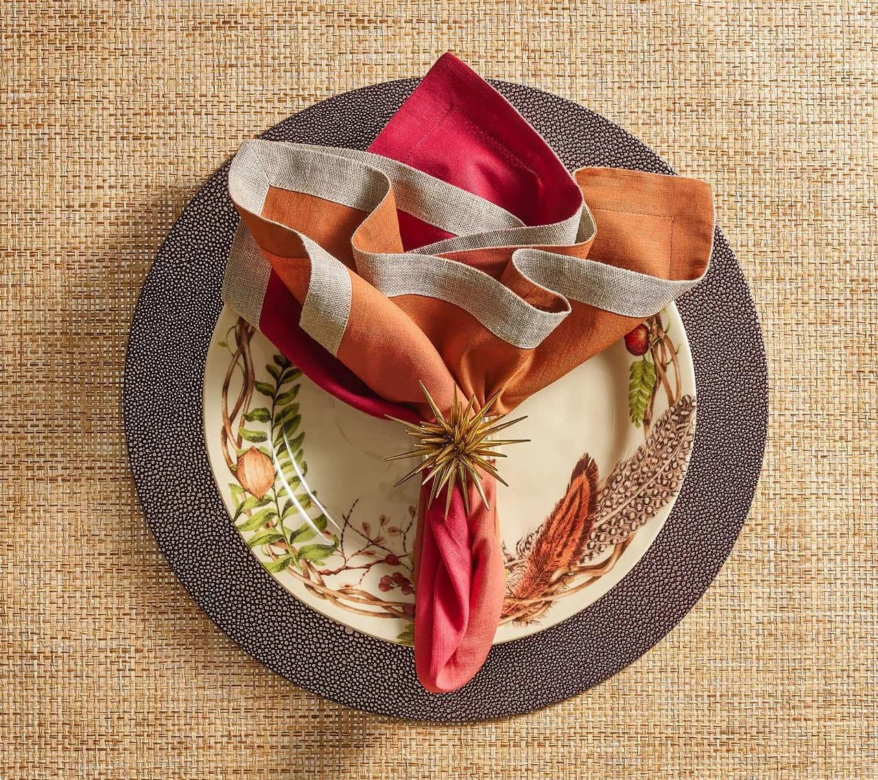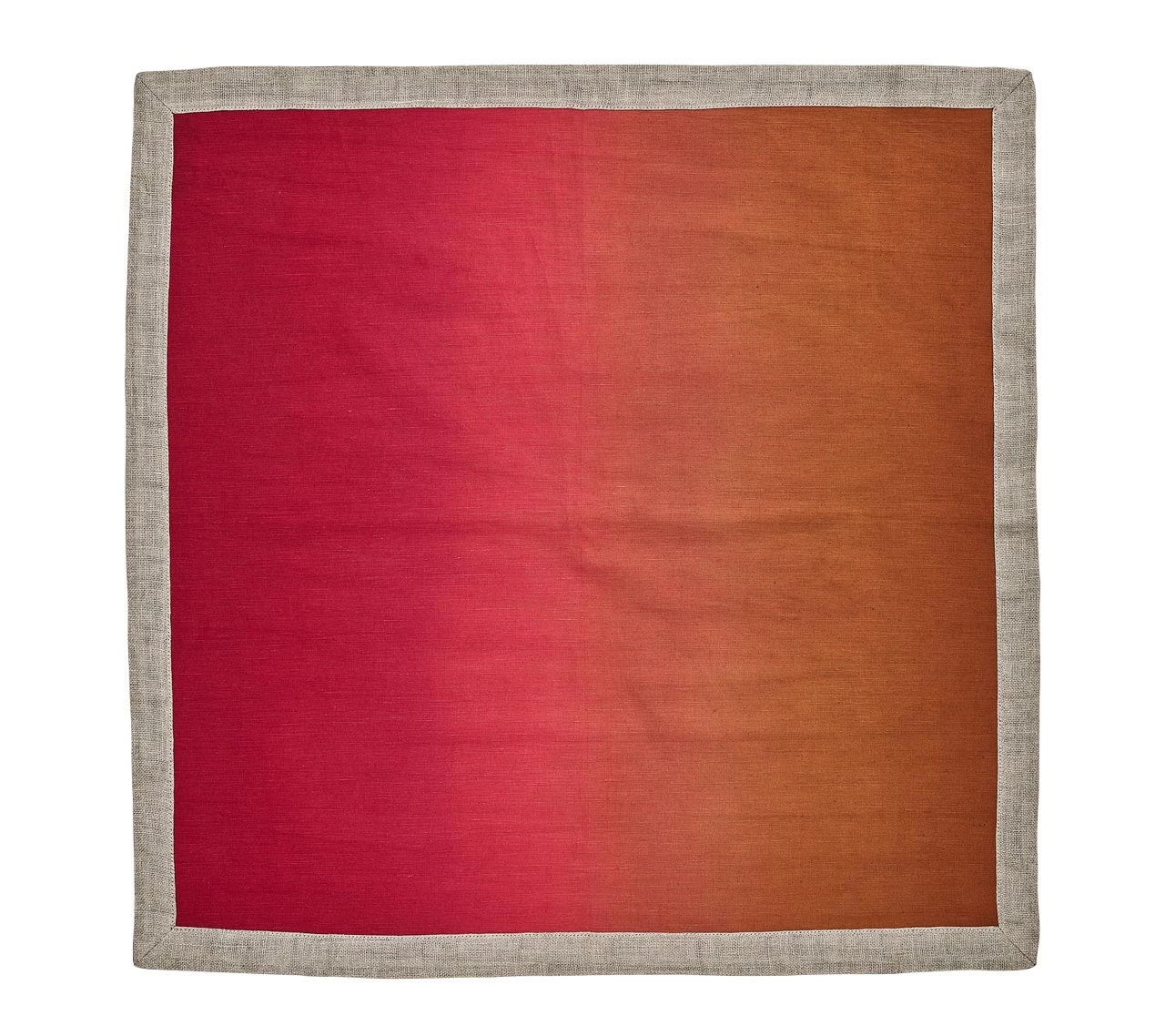 The Dip Dye Napkin features an ombre gradation from cranberry to orange, adding a subtle elegance to the refined linen napkin. This gorgeous rich color combination complements any festive fall table. These napkins are hand dipped and dyed and accented with a luxurious metallic foil border.