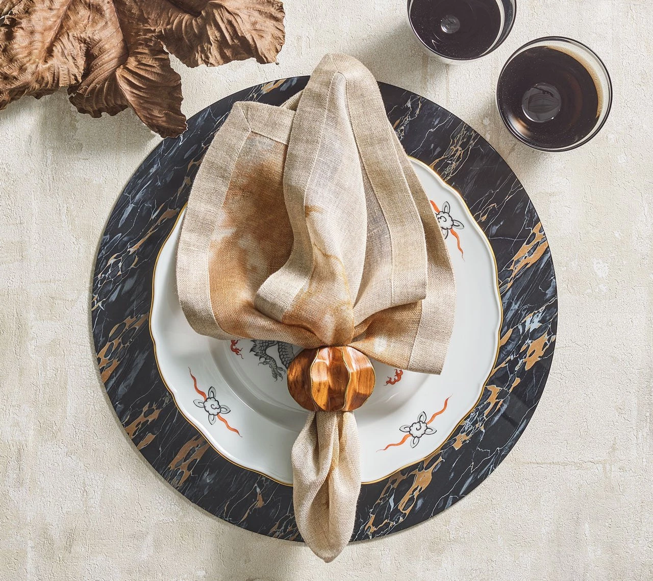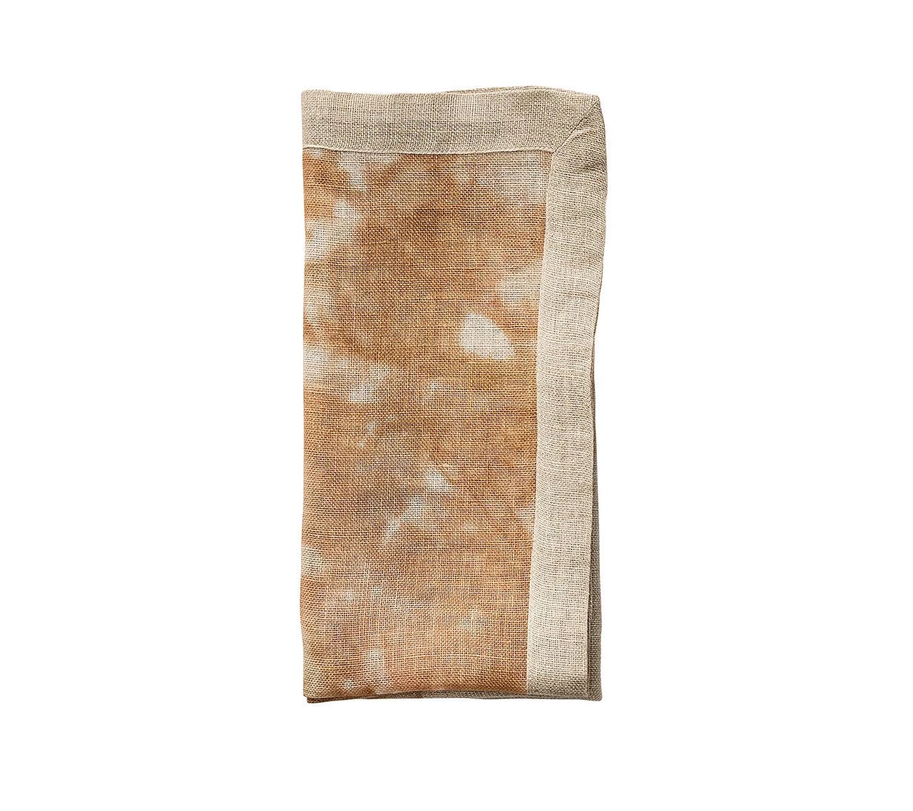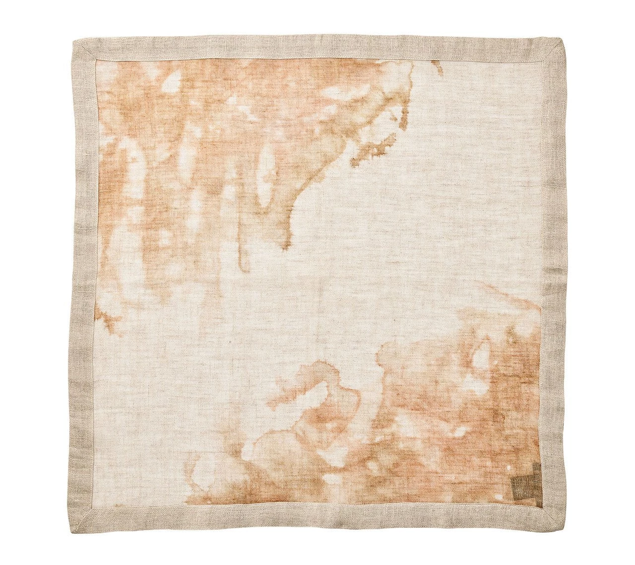 Inspired by a beloved method of painting, the Ethereal Napkin mimics the beauty of watercolor. A unique tie-dye process is used on natural linen gauze to create an ethereal pattern. Autumnal browns are suspended in delicate formations on the natural linen.