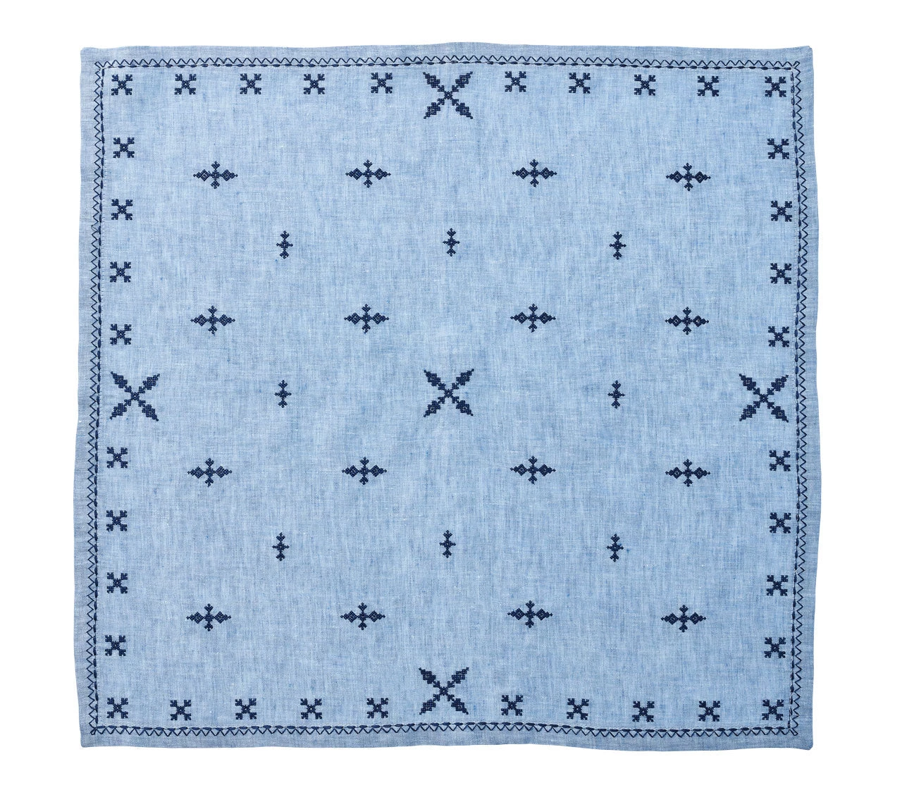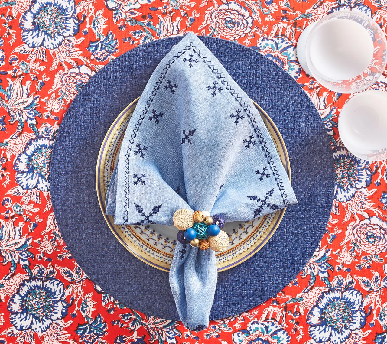 Traditional Moroccan embroidery inspired the linen Fez Napkin. The periwinkle napkin features navy embroidered details arranged in a symmetrical pattern across the napkin. A navy striped embroidered border completes the festive napkin.