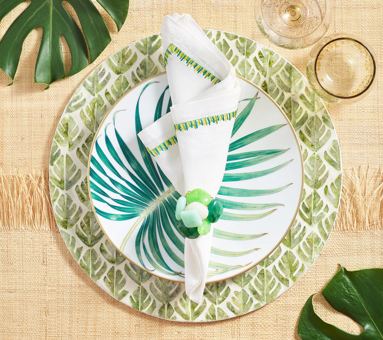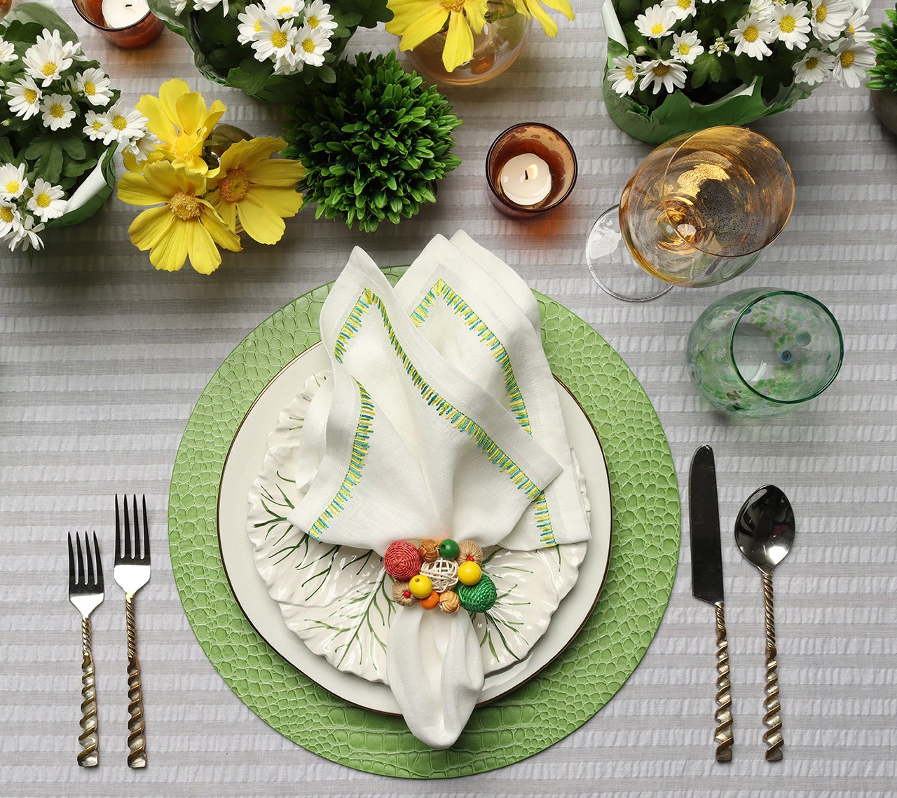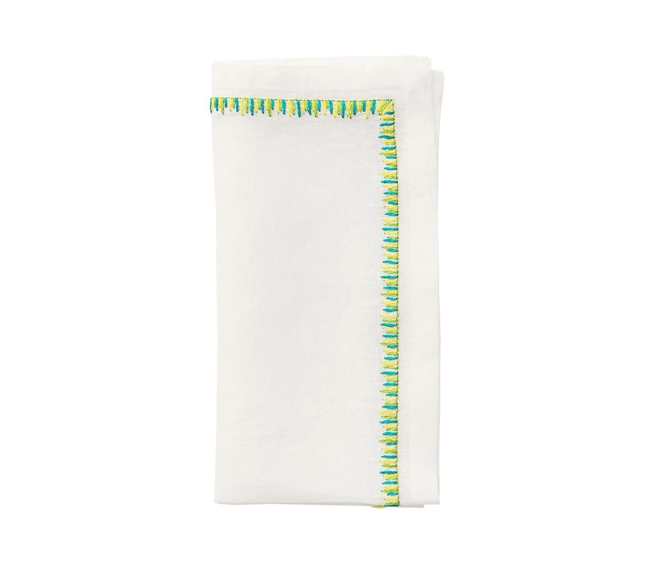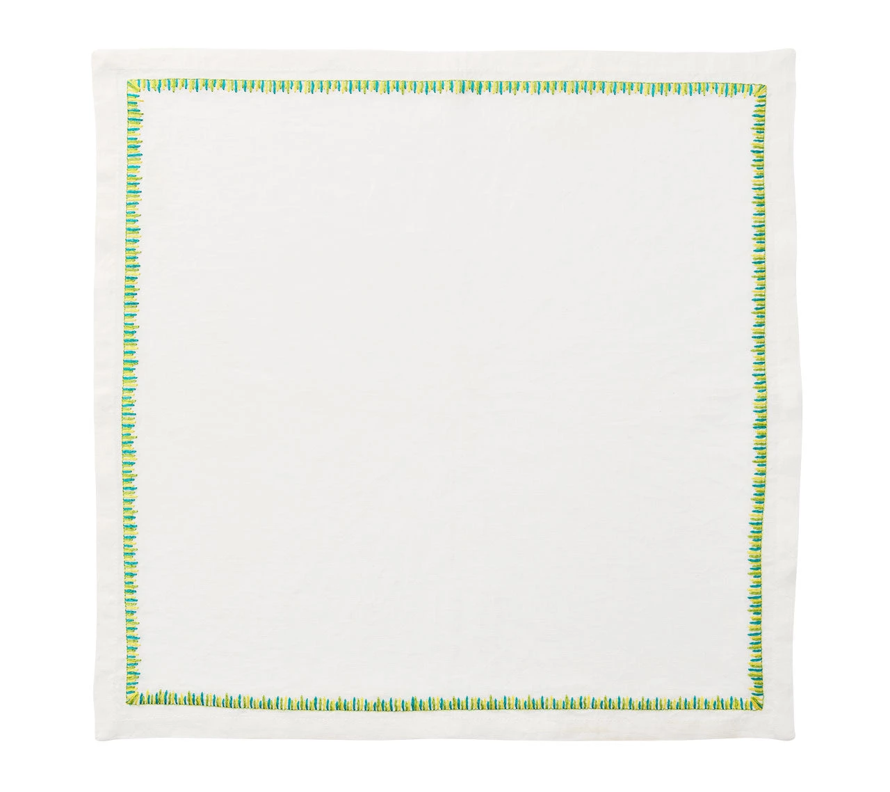A fresh take on the classic, crisp white linen napkin, the linen Filament Napkin features long, floating embroidered stitching. These long stitches are reminiscent of the filaments in the center of a lightbulb. The yellow and green stitching contrast against the white linen napkin similarly to the way the bright light contrasts against the frosted glass.