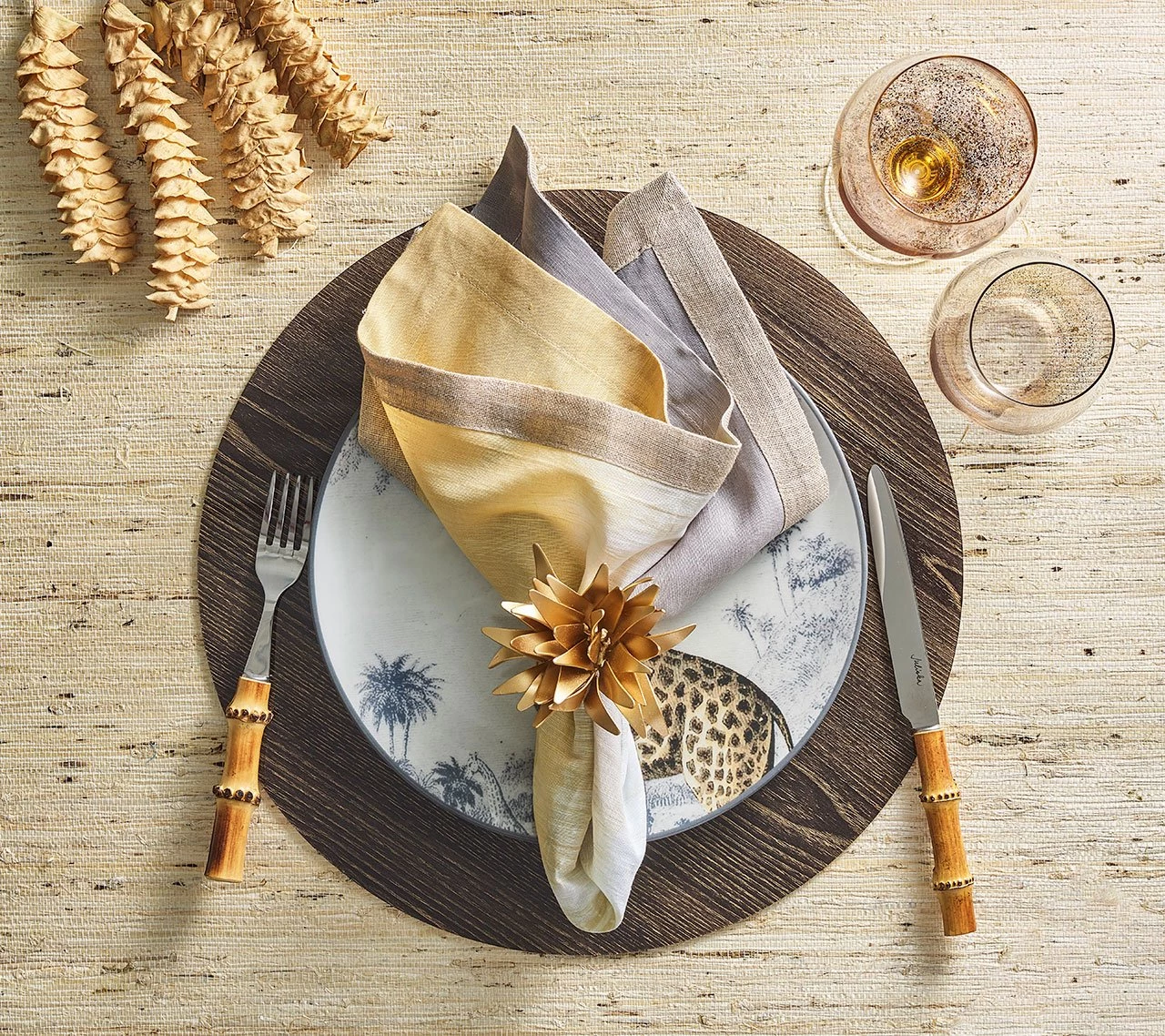 Aptly named, the gold cast Flores Napkin Ring is inspired by organic flower petals. The petals are hand-cast to create a stunning floral display. The long, whimsical leaves sit atop a square gold ring, adding movement and energy to the table setting.Â