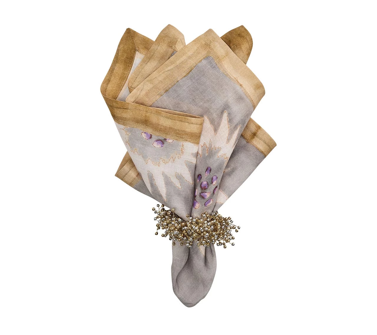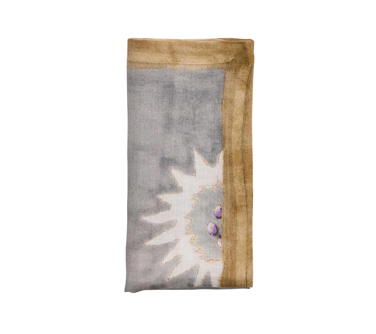 The Foliage Napkin is a printed cloth napkin showcasing a hand-painted floral motif on linen fabric. This luxurious fall cloth napkin is offered in three sophisticated color combinations. The autumnal beige, taupe and gray colorway sets the stage for a festive fall meal, the fluid blue, gray colorway creates a lighter atmosphere and the natural, gray colorway draws on a bohemian, free spirited ambiance. Perfect for mixing and matching, these printed cloth napkins are an entertaining must-have.