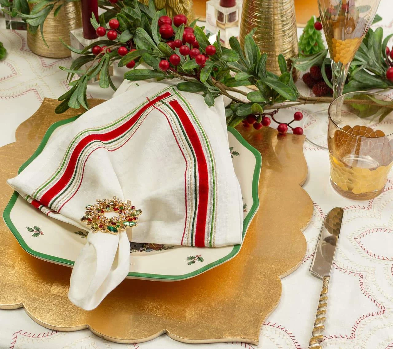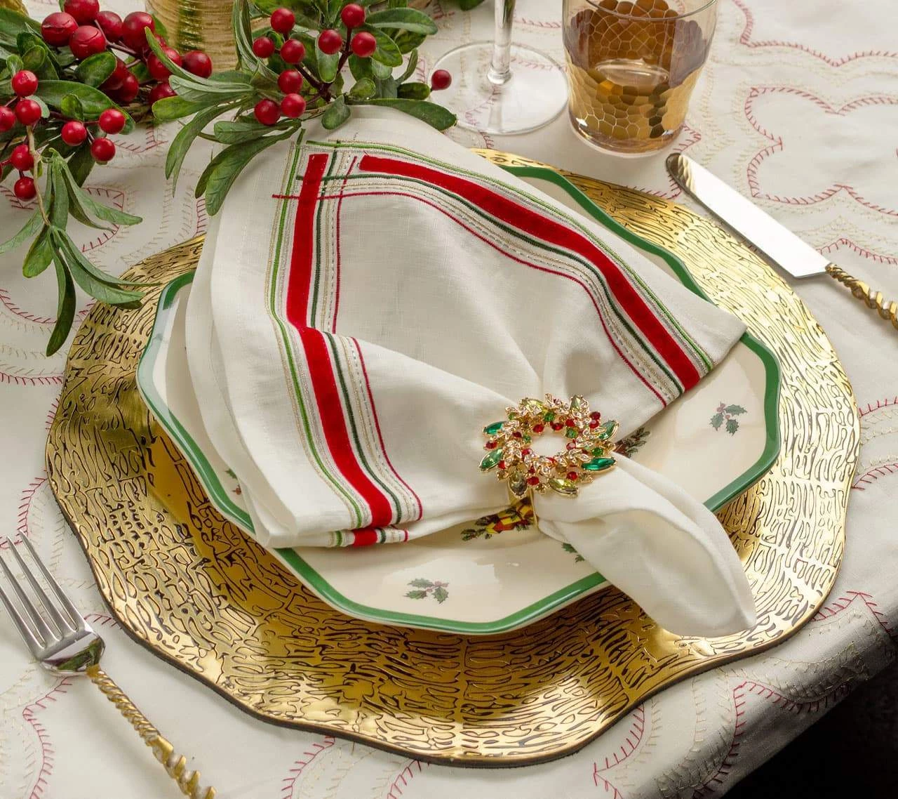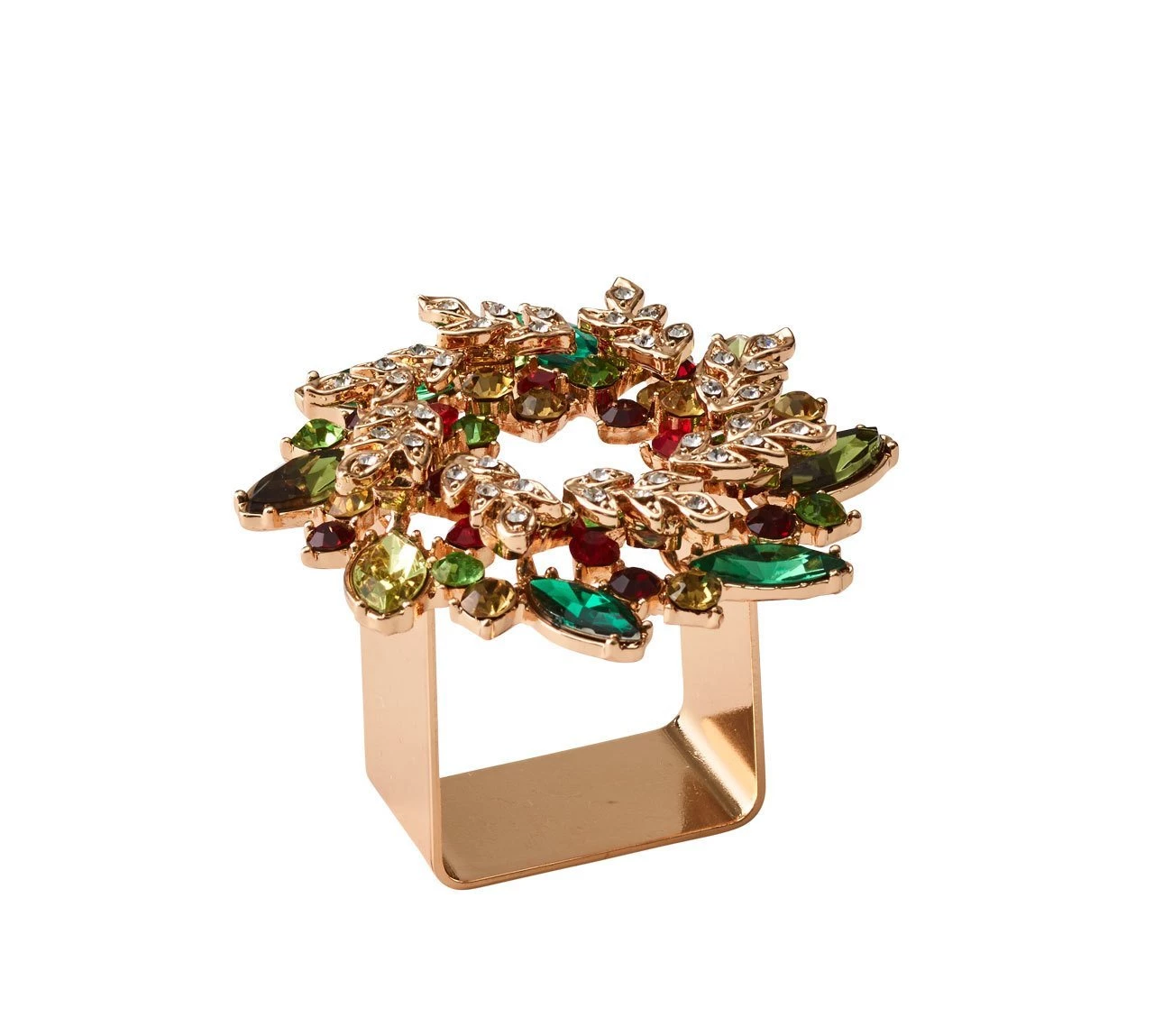 Why limit holiday wreaths to doors and windows? At Kim Seybert, we’ve found a way to introduce them to your holiday table setting. In multiples too! Welcome the Gem Wreath napkin ring; an embellished and bedazzled miniature wreath atop a gold square ring.