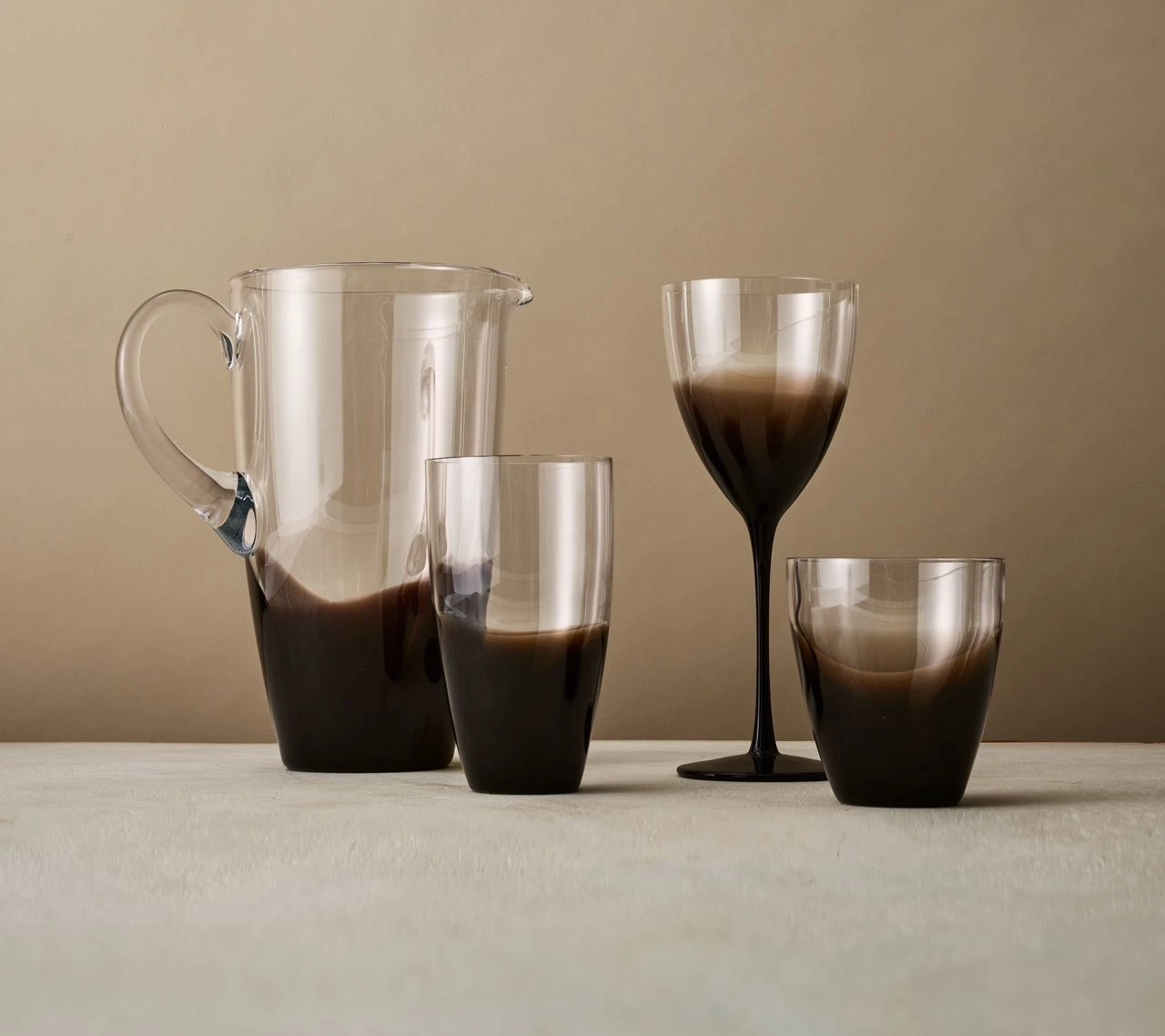 Every item in our mouth blown Vague collection undergoes a two-step process. Each piece is first blown to create its body in clear, then a second layer of smoke colored glass is blown to form its one-of-a-kind tinted base.