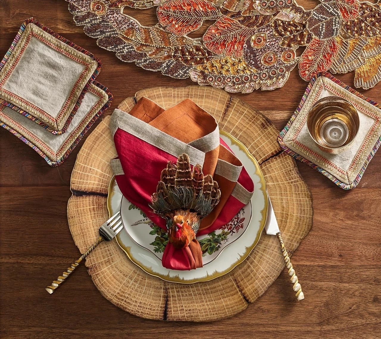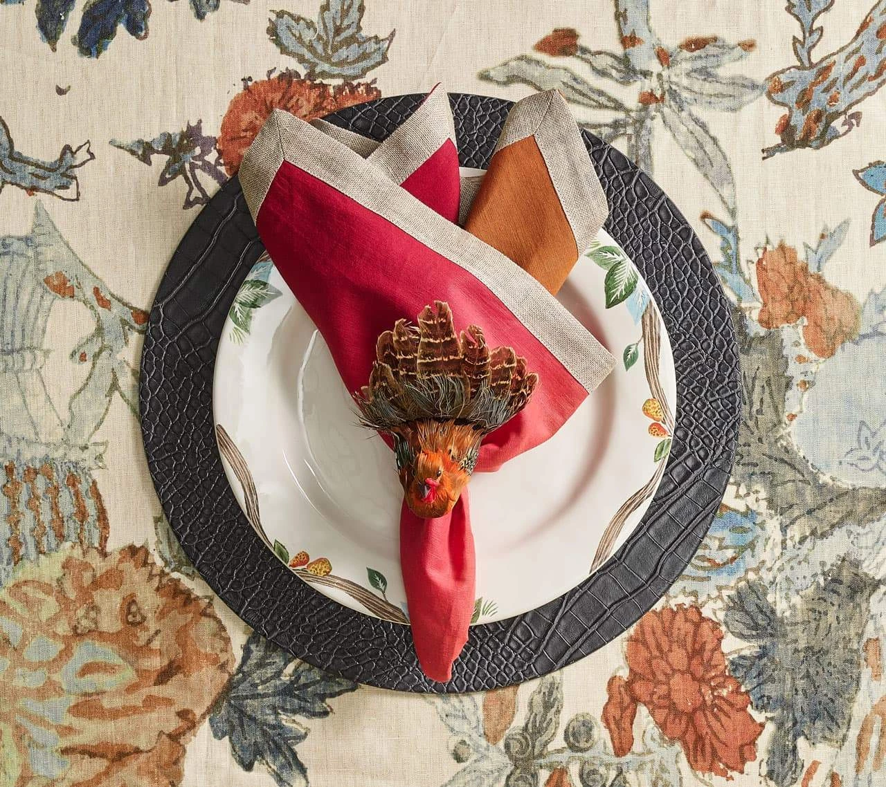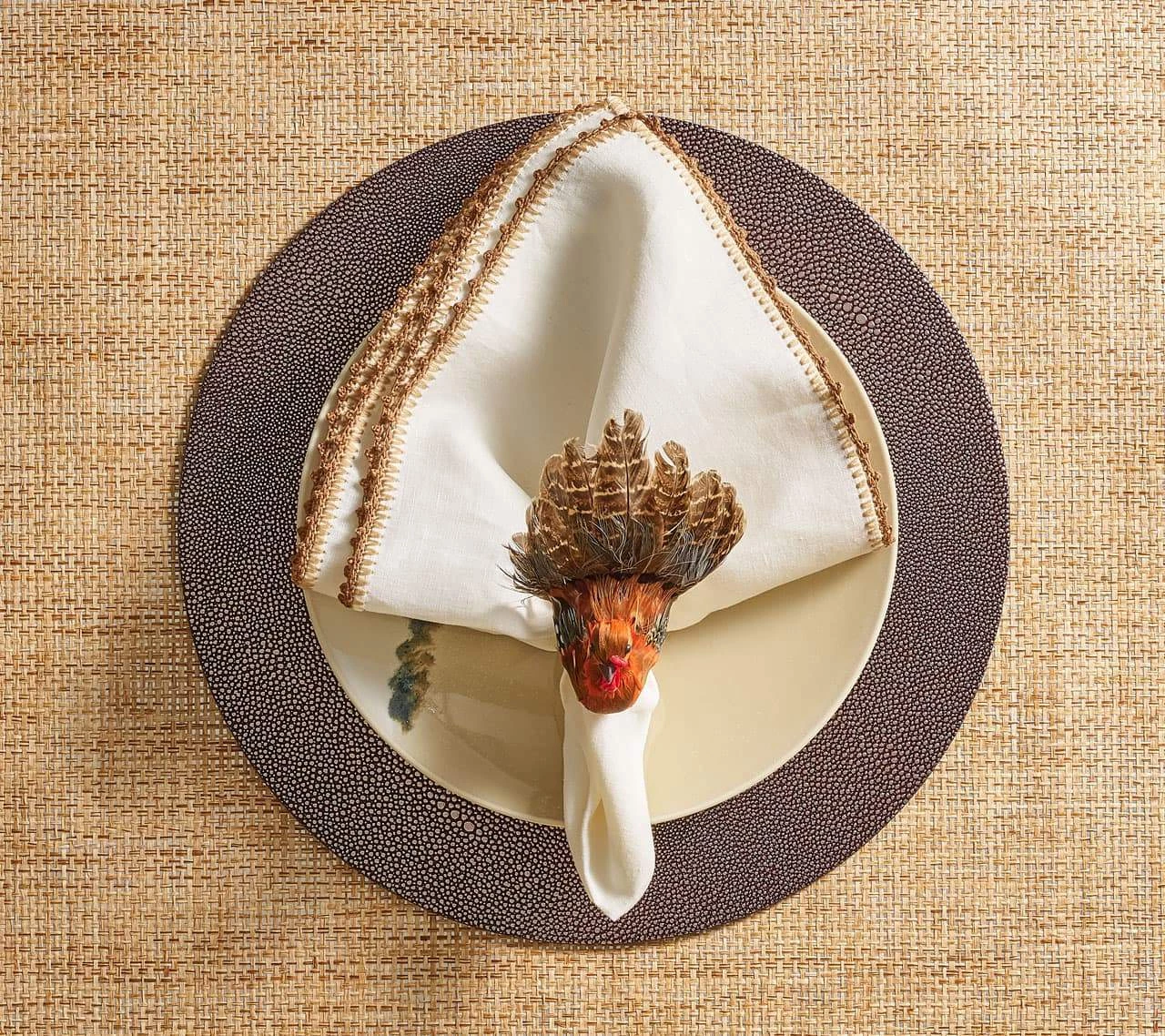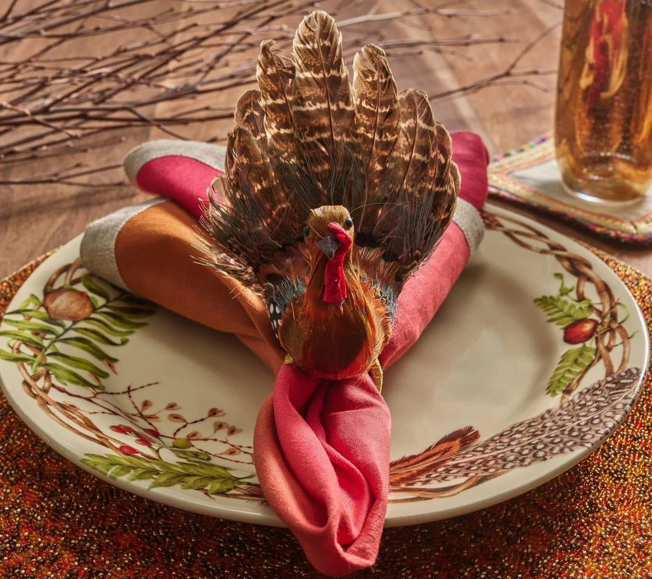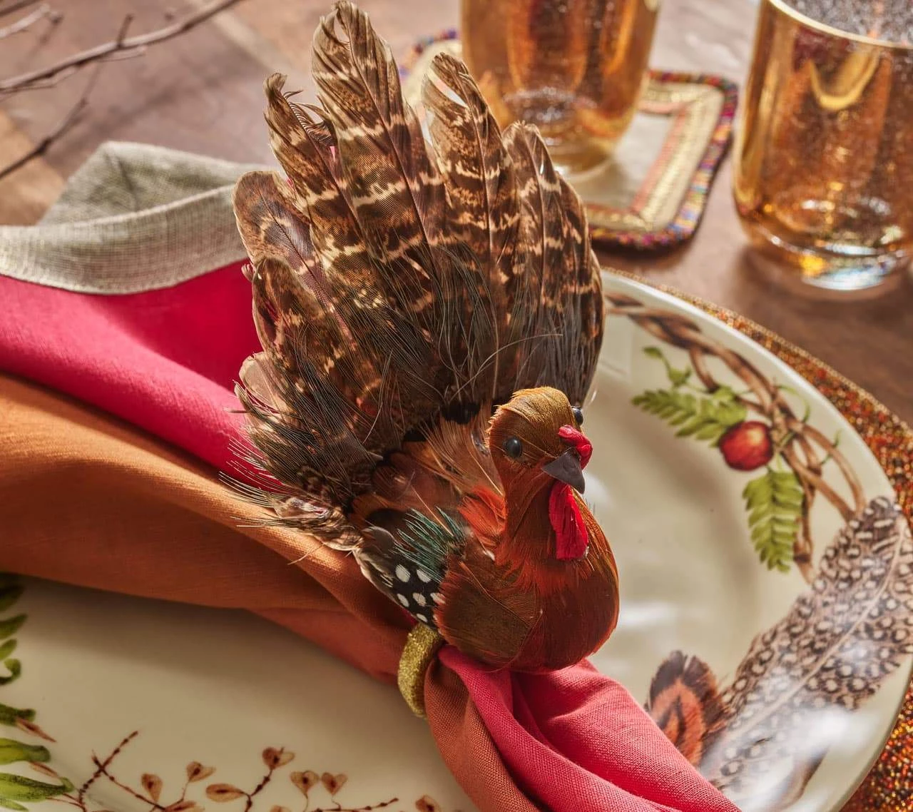 Set a stunning Thanksgiving table with The Gobble Napkin Ring, which features natural feathers in the shape of a turkey. Part of the autumnal Harvest Collection, these fall themed napkin rings will add a festive touch to your autumn table settings. This Thanksgiving Napkin Ring features fall shades of brown, reds and oranges.