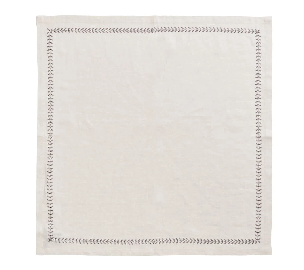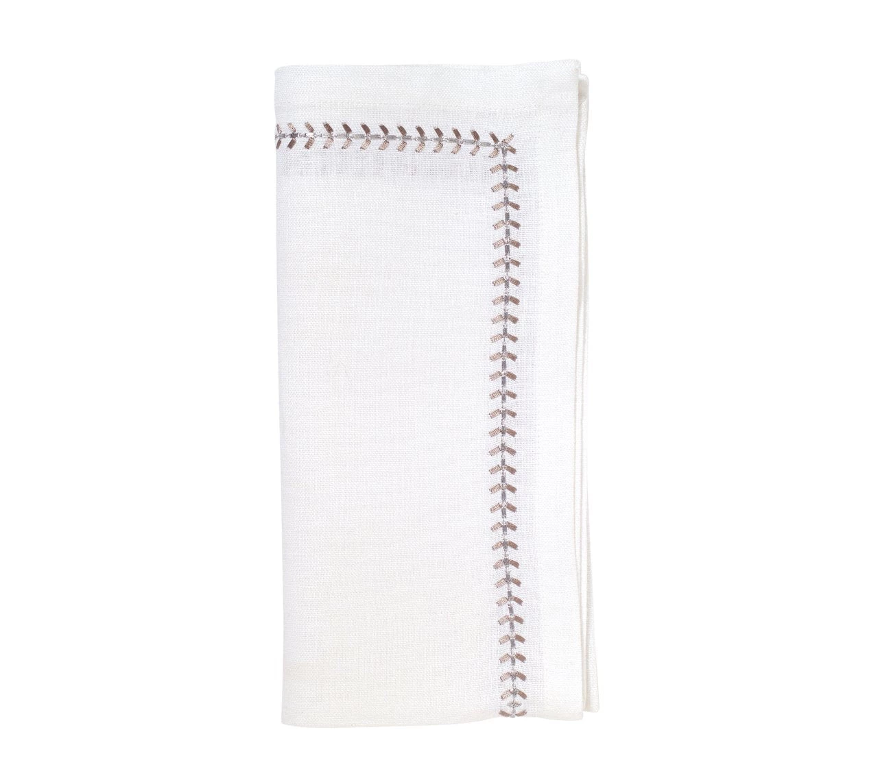 The elegant linen Herringbone Napkin in white, gunmetal and silver is a classic entertaining staple for the table. The crisp white linen napkin is accentuated with a gunmetal and silver herringbone stitch border. A versatile linen napkin, the Herringbone Napkin in gunmetal and silver works beautifully in a formal setting or for daily use.