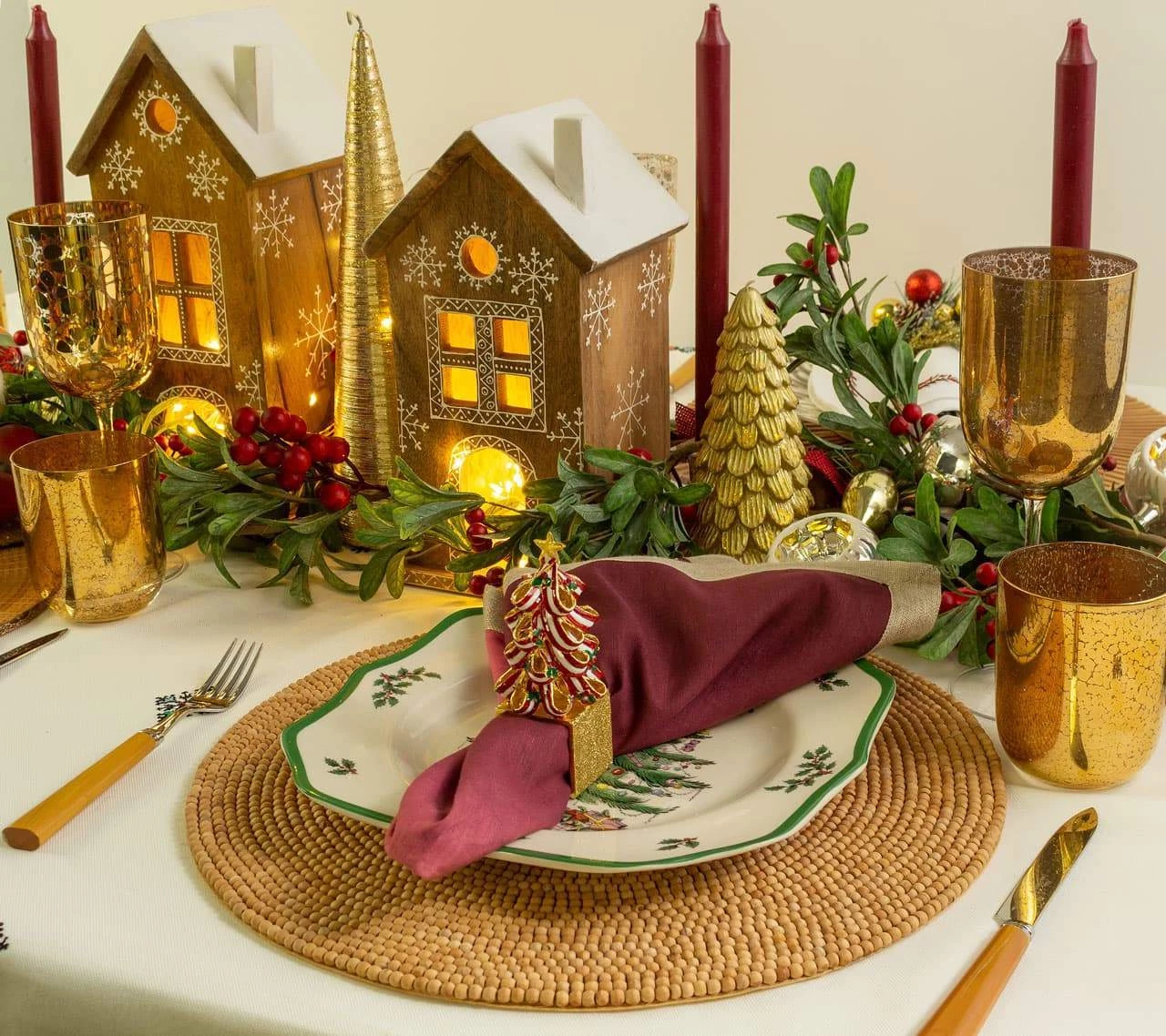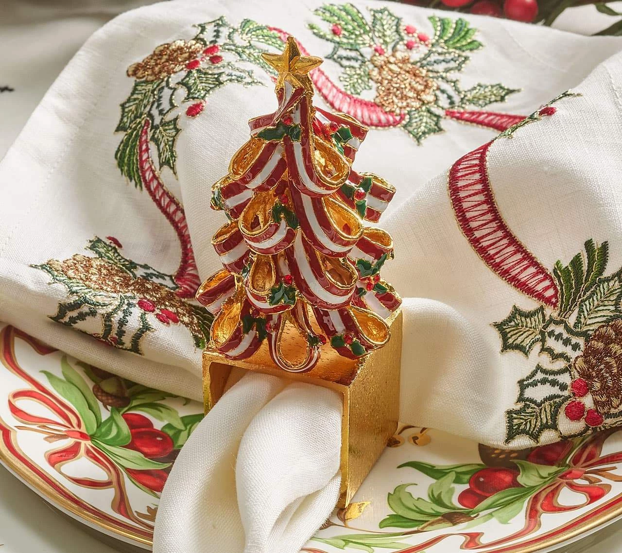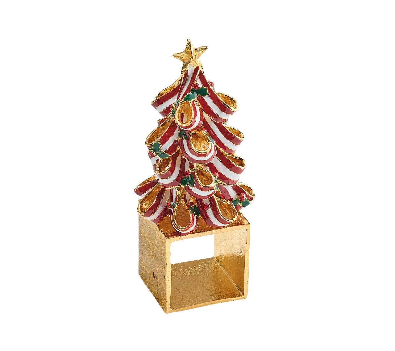 The Holiday Tree Napkin Rings feature ribbons of Christmas candy in red and white with tiny green accent bows set on a gold ring. These Christmas napkin rings are sure to add a whimsical flair to your Christmas table settings. The Holiday Tree Napkin Rings are sold as a set of four.