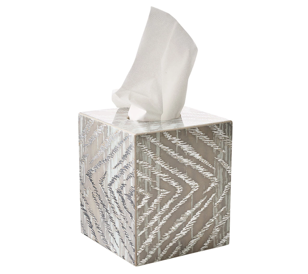 We have re-interpreted classic zebra pattern on our newest bath collection. Instead of the traditional black and white color combination, we washed it in metallic silver and gray. They are made by hand using lacquer techniques and metallic foiling.The result is a modern must-have bath set, especially this tissue box.
