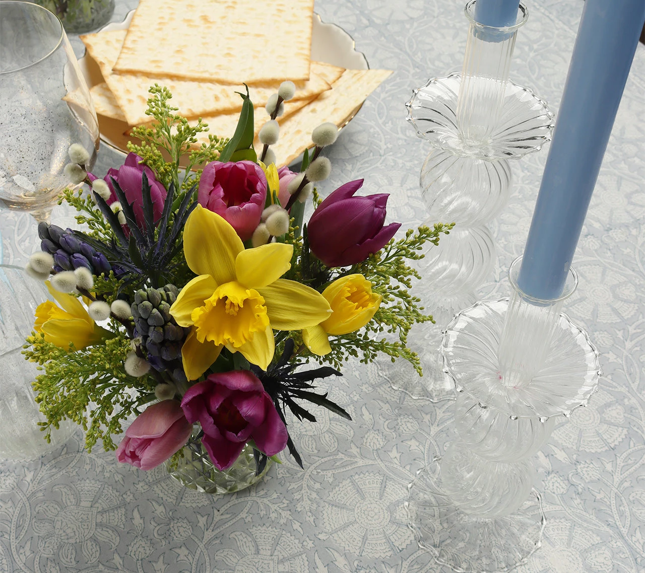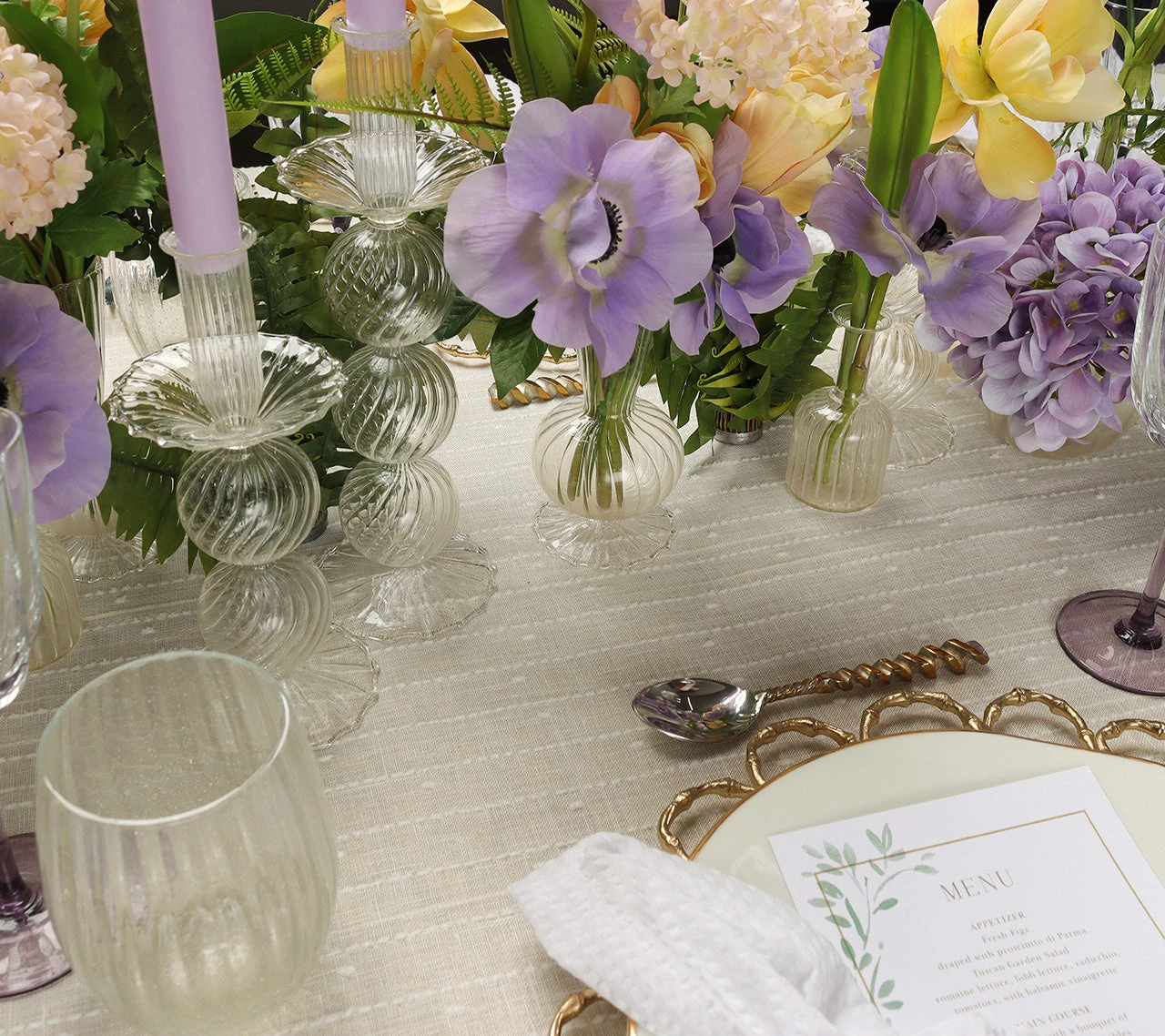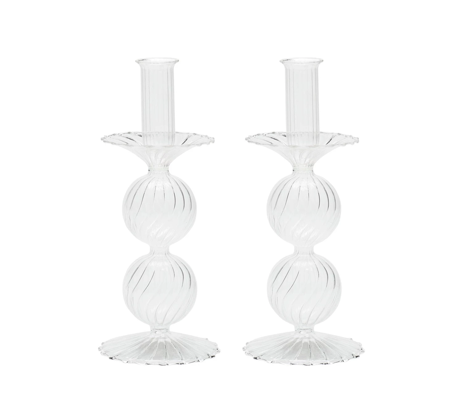 The delicate, hand-blown glass Bella Candlestick features two stacked globes atop a scalloped base. This stunning glass candlestick adds movement and sophistication to any table.
