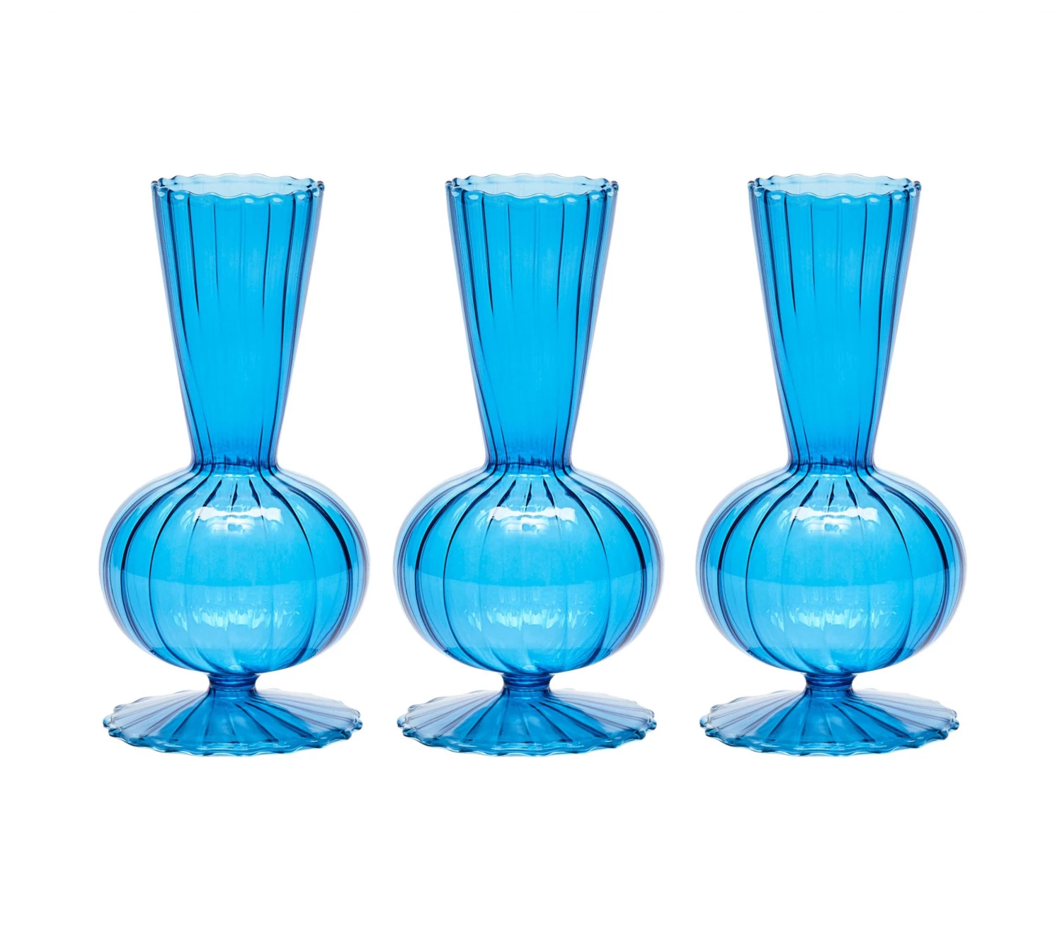 The delicate, hand-blown glass Tess Bud Vase features a tapered flute atop a globe and finished with a scalloped base. This stunning glass bud vase adds sophistication to any table.