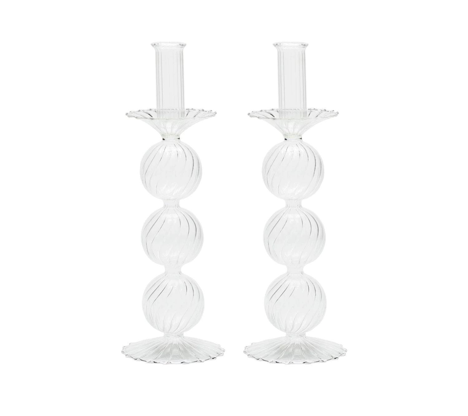 The delicate, hand-blown glass Iris Candlestick features three stacked globes atop a scalloped base. This stunning glass candlestick adds movement and sophistication to any table.