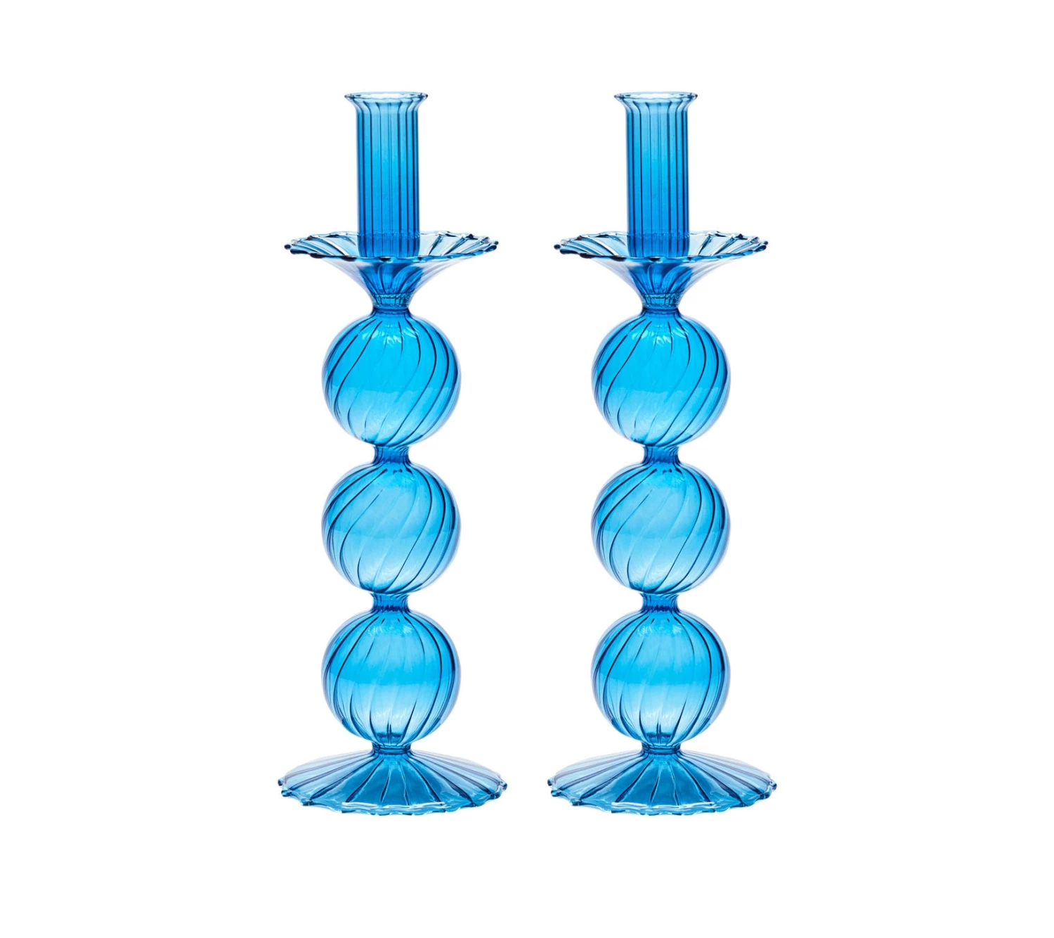 The delicate, hand-blown glass Iris Candlestick features three stacked globes atop a scalloped base. This stunning glass candlestick adds movement and sophistication to any table.