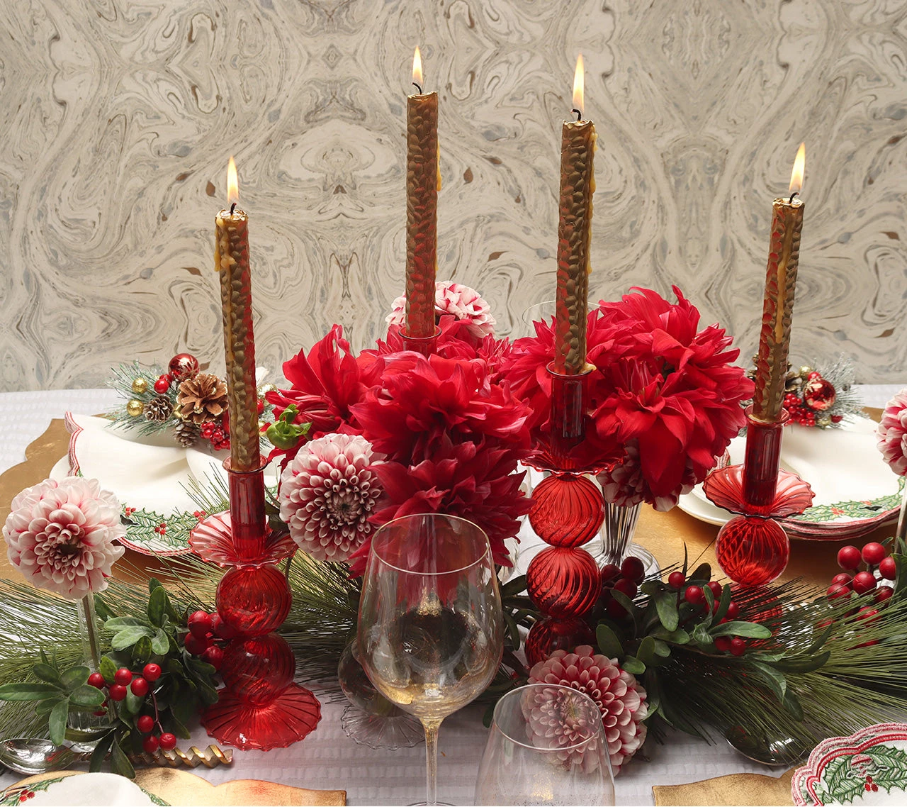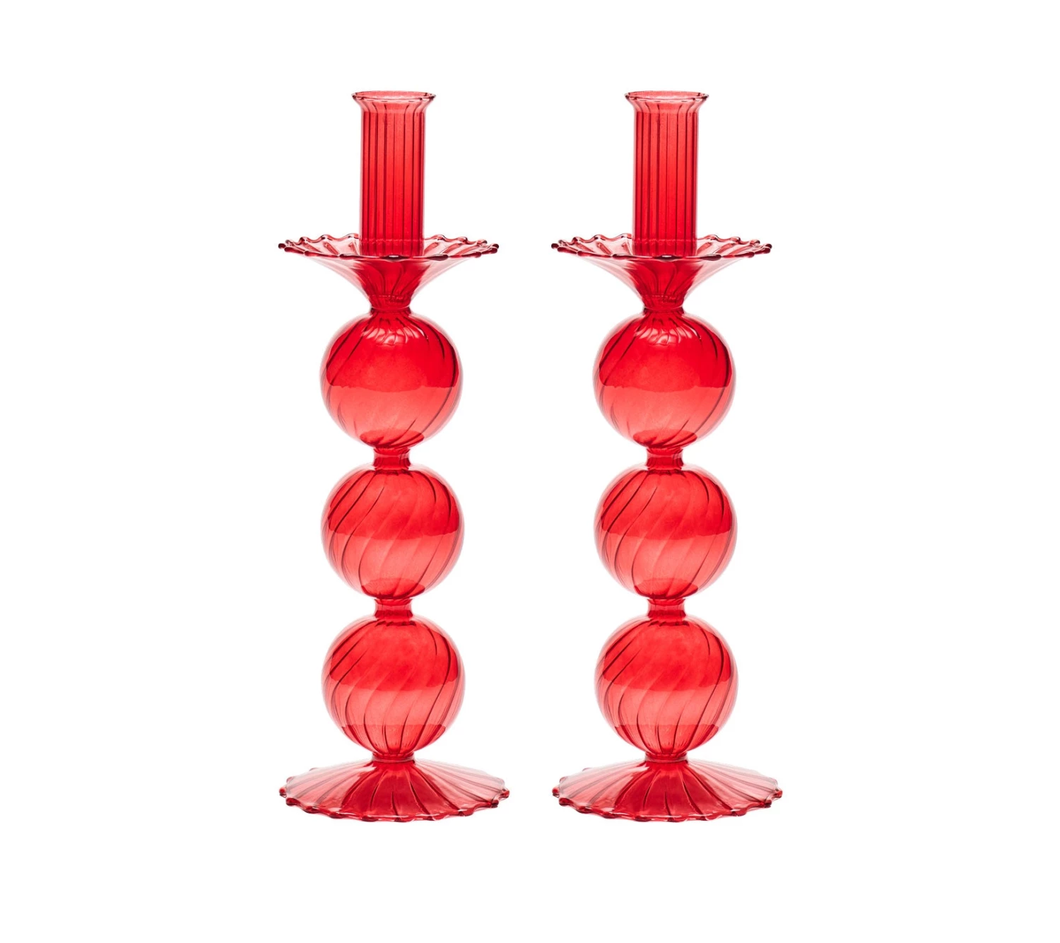 The delicate, hand-blown glass Iris Candlestick features three stacked globes atop a scalloped base. This stunning glass candlestick adds movement and sophistication to any table.