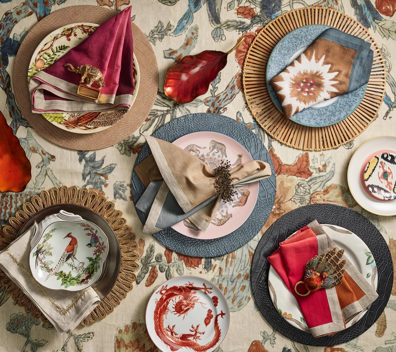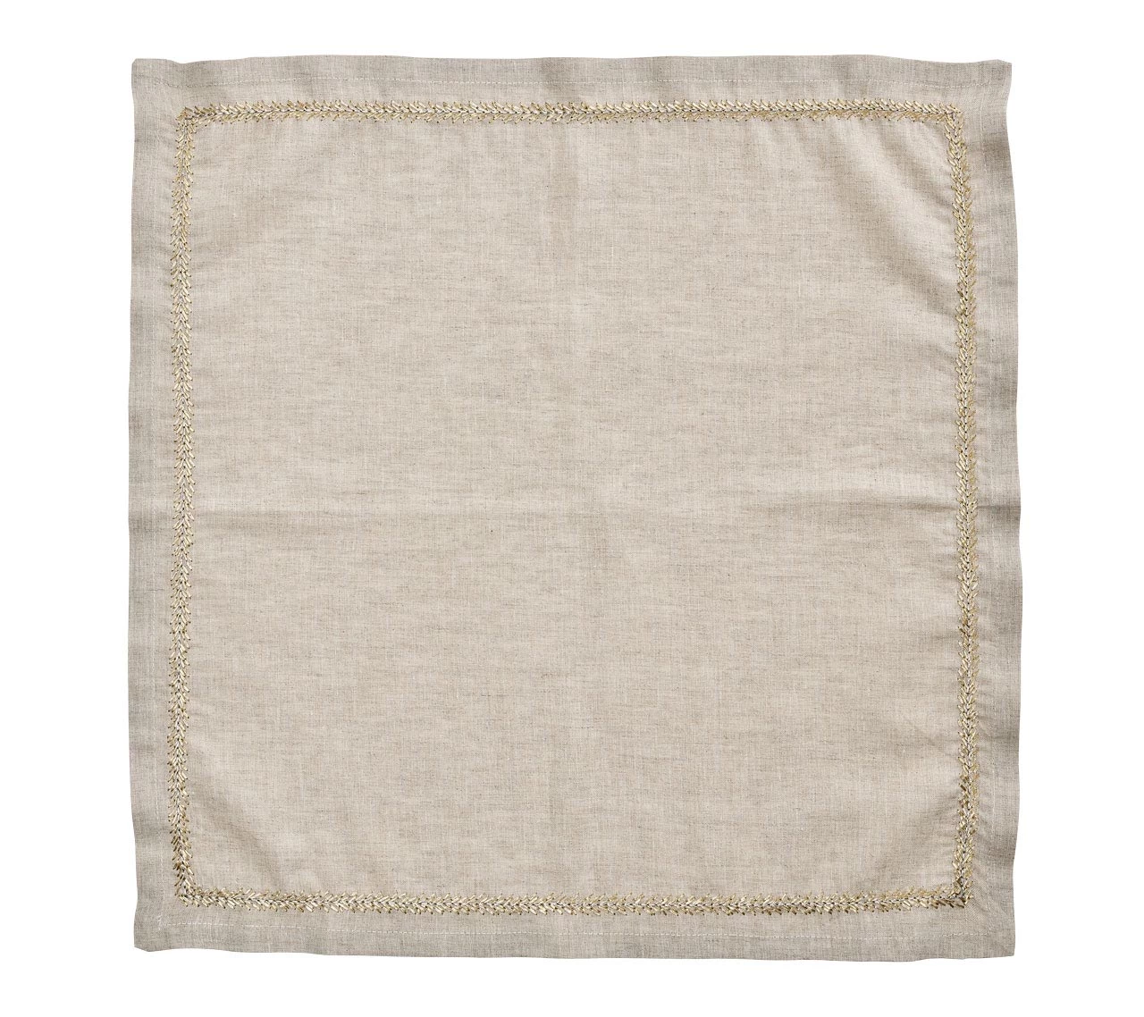 The linen Jardin Napkin in natural, gold, and silver features intricate embroidery in gold and silver along with the trim of the natural linen napkin. This elegant linen napkin is versatile and can be used in both casual and formal table settings. The Jardin Napkin in natural, gold, and silver could be used as a wedding or bridal shower napkin, a holiday table, or a quiet dinner at home.