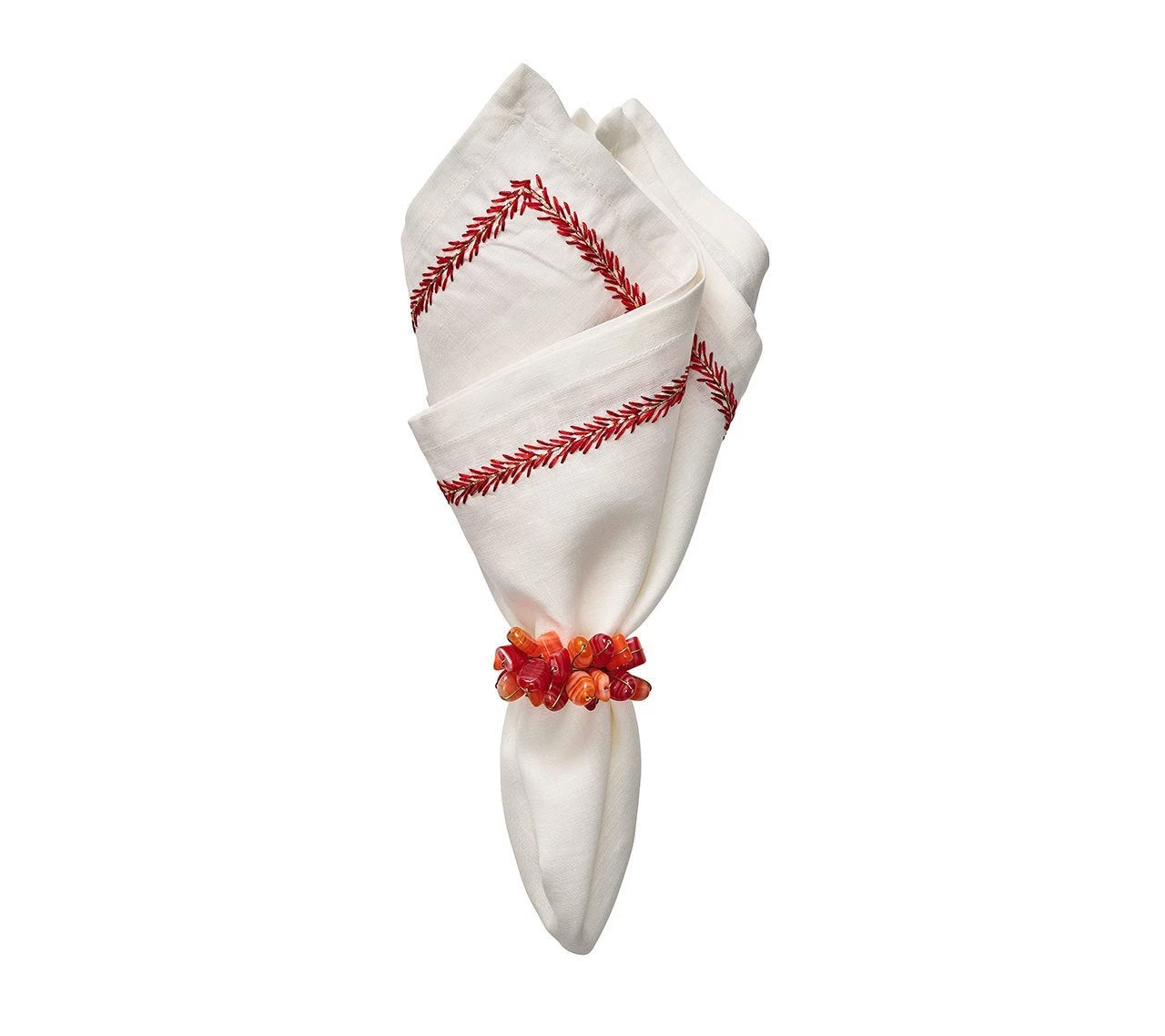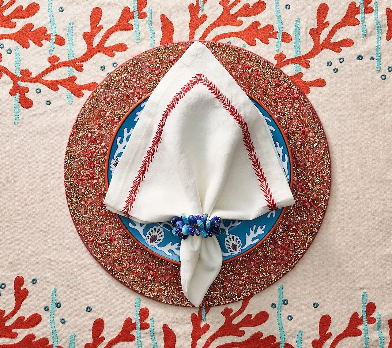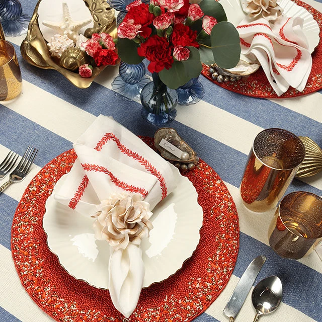 The Jardin Collection transports the garden to your table. The intricate embroidery on the linen Jardin Napkin plays with texture and shades of coral.