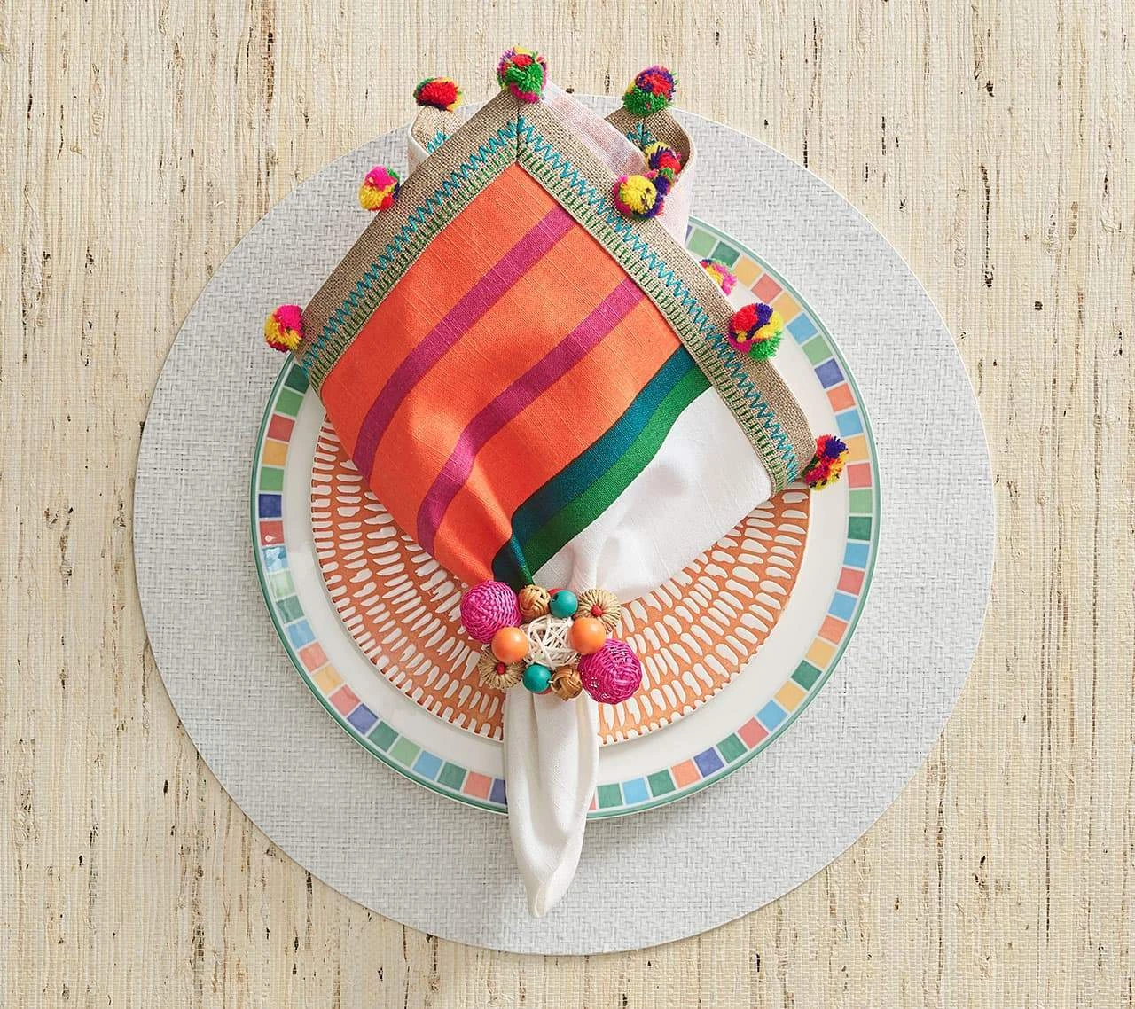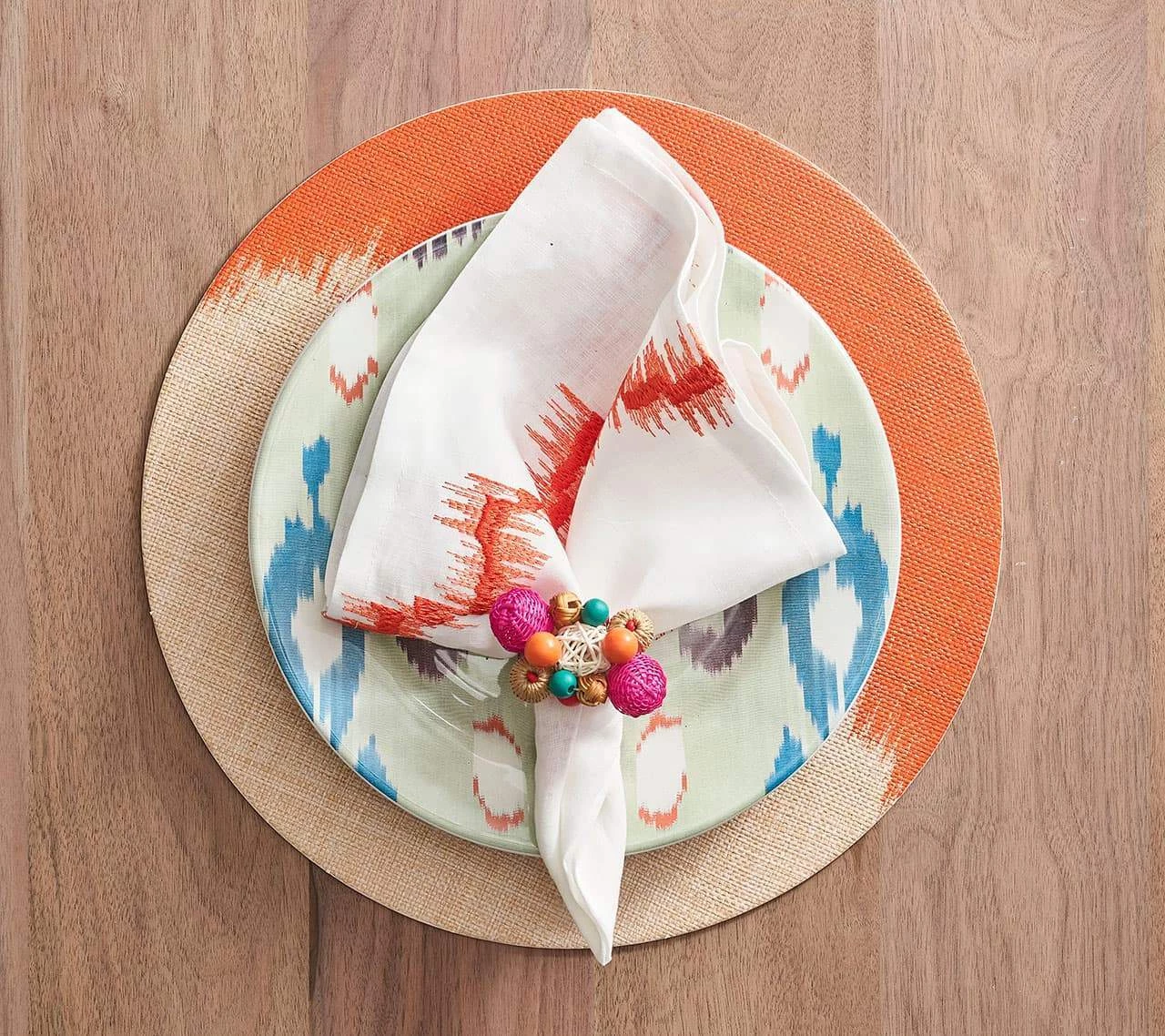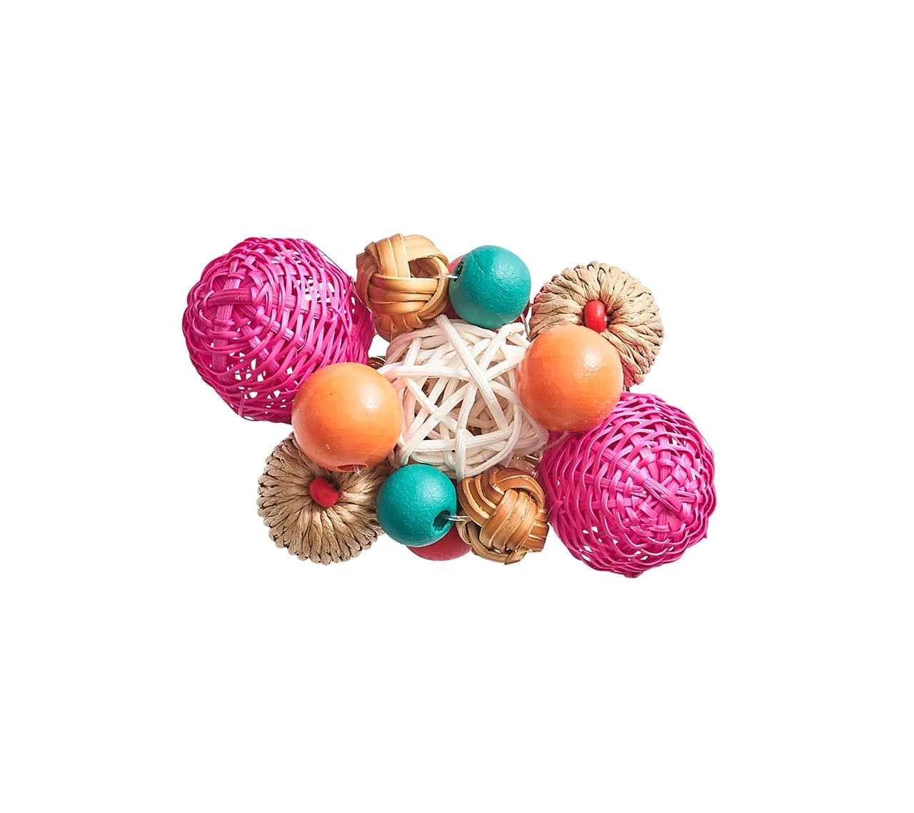 The textured Java Napkin Ring features mini woven baskets in natural materials and vibrant colors displayed in a cluster atop a wooden base. Seven different types of rattan and wooden beads are polished, painted or woven by hand to create the bead-like baubles on this festive napkin ring. This exceptional napkin ring is hand-made using naturally occurring materials, variations are to be expected.