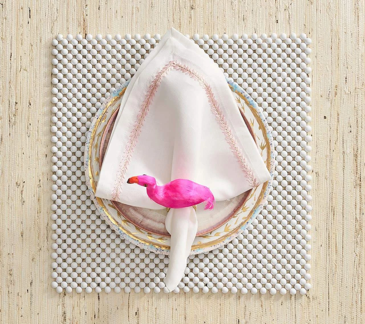 Made from white painted beads, the square, wooden Java Placemat is hand-made by artisans. The glossy beads are hand-linked together to form a square pattern. A fresh take on neutral, this wooden, square placemat adds subtle depth and texture.