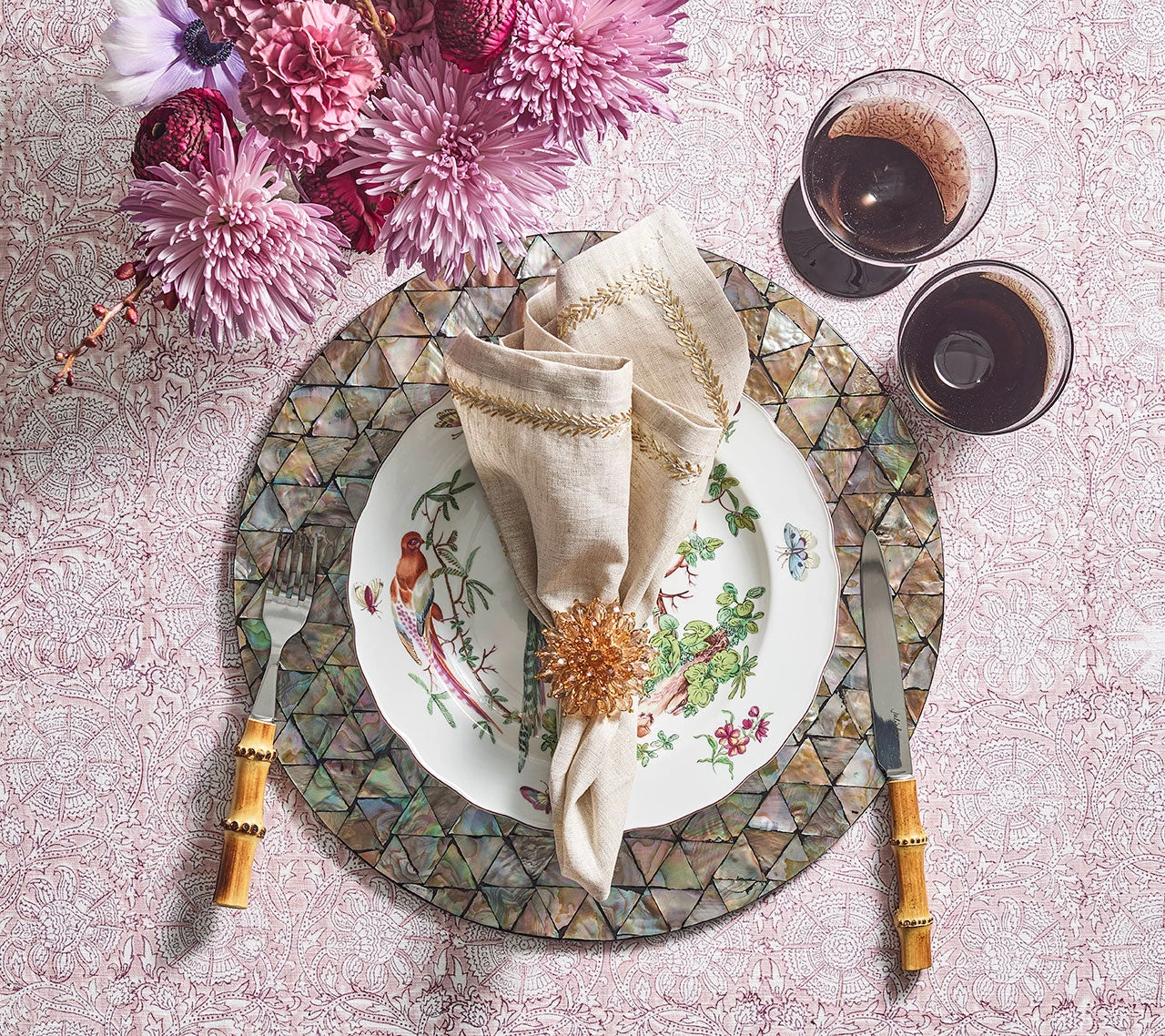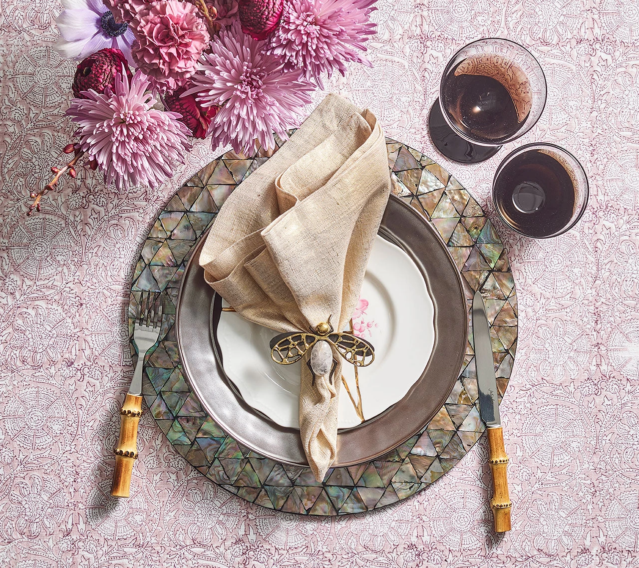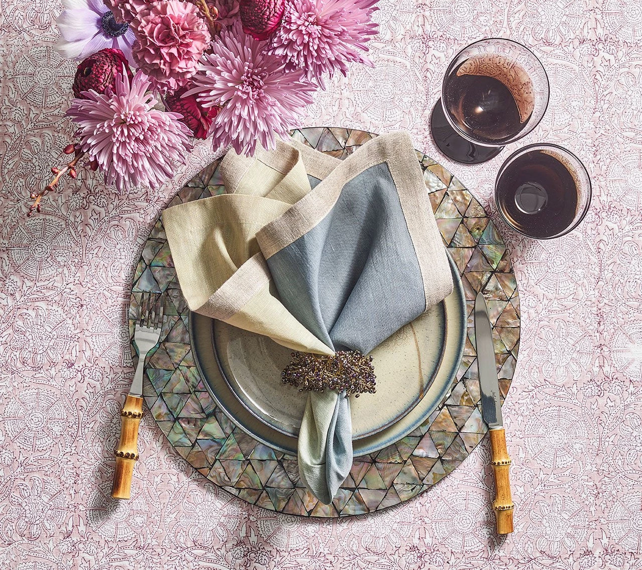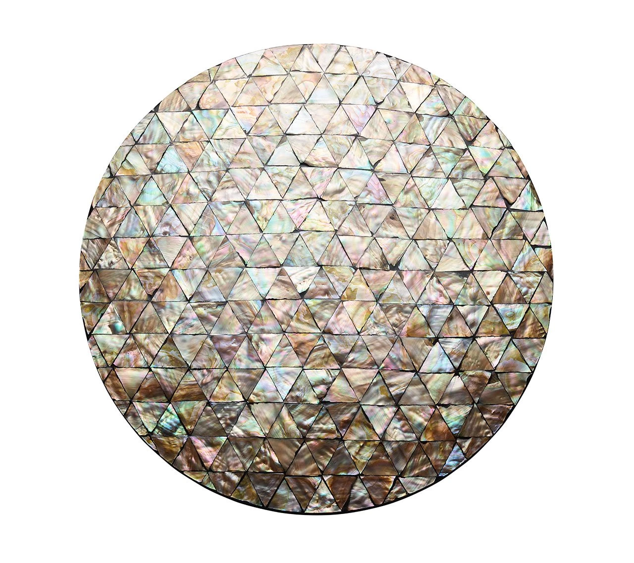 Created by multiple reflections of different surfaces, kaleidoscopes have been used to produce beautiful forms dating back to antiquity. The Kaleidoscope Placemat features triangular mother-of-pearl tiles hand-arranged in a uniform pattern that play with light and color. Due to the organic nature of the shells, no two pieces will be the same.Â