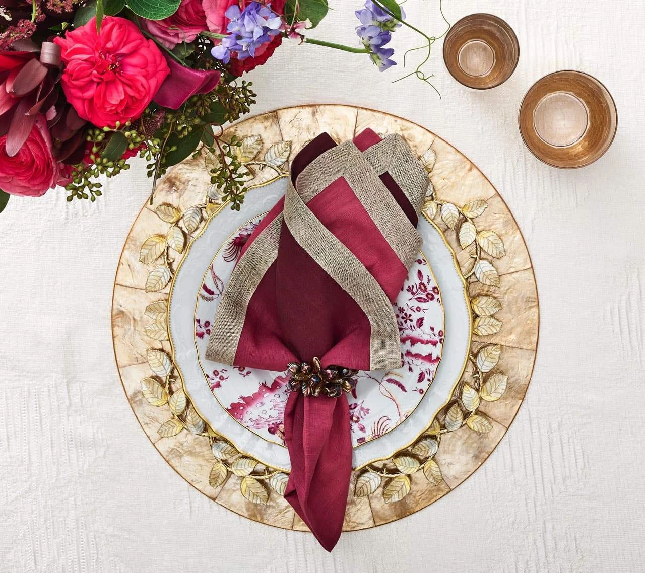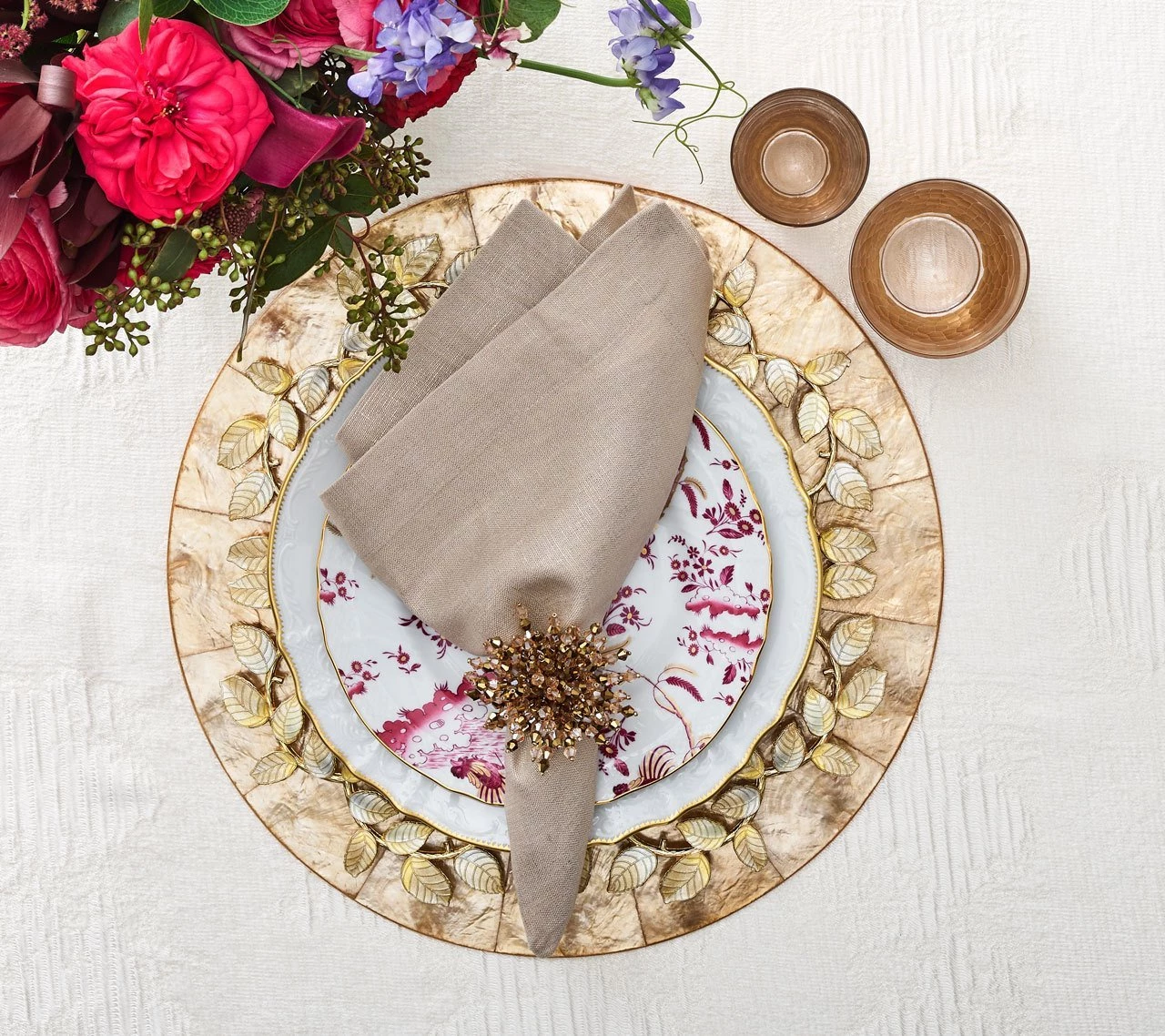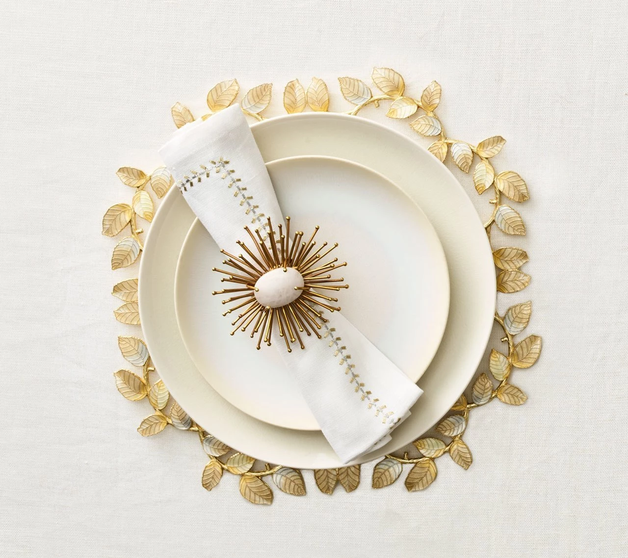 TECHNIQUE: Every piece by Kim Seybert has been touched by the hand of an artisan, many using techniques that have been passed down for generations. Our products are handmade and the gold and silver leaves of the Laurel Chargers are hand-painted, therefore slight variation in colors can be expected from one piece to another. We recommend ordering the full amount needed, as the second shipment may not match exactly.