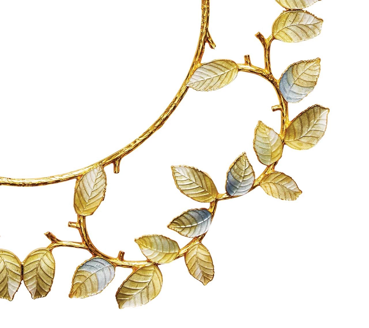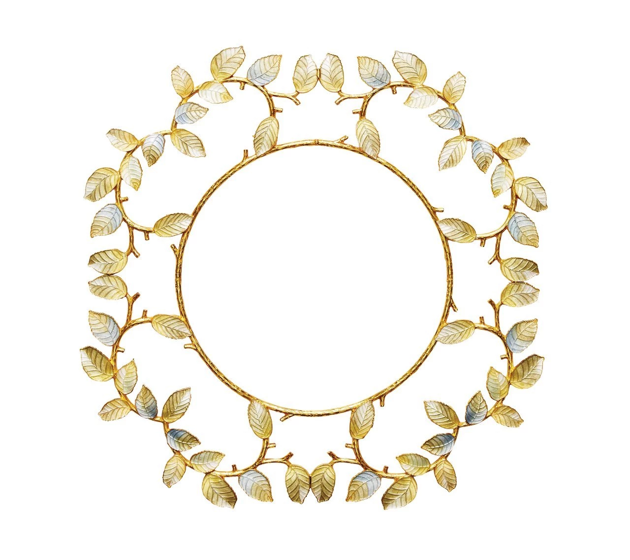 The round gold Laurel Charger features delicate gold and enamel leaves arranged in an organic, wreath-like design. The gold and silver enamel finish adds a sophisticated flourish to this gold metal charger. The perfect addition to an elegant holiday table setting or afternoon soiree.